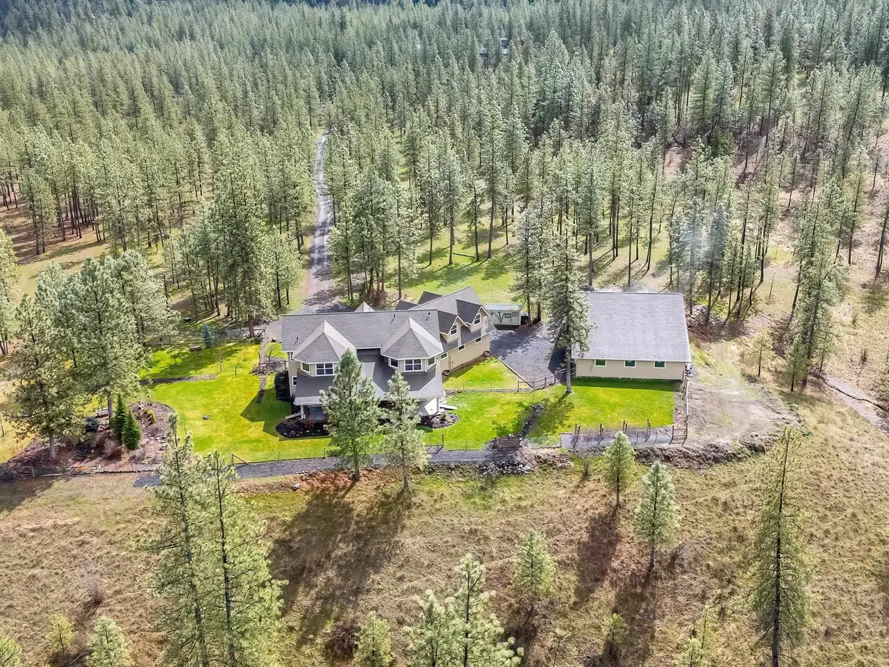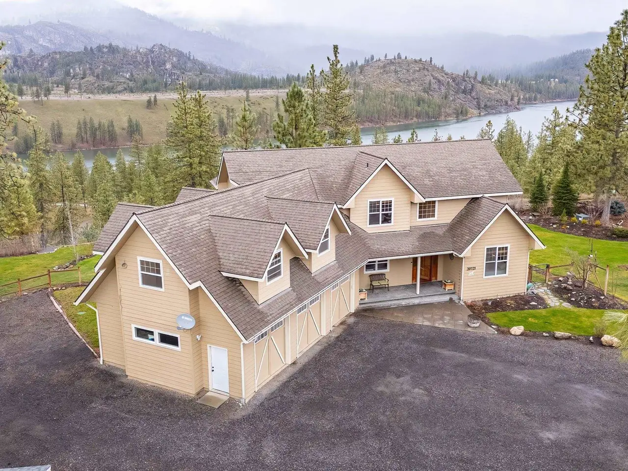 Welcome to this remarkable custom-built home, perfectly situated on 10 acres of park-like grounds with breathtaking views of Lake Spokane. This energy-efficient home boasts zonal Geothermal heating and cooling. The chef’s kitchen is a dream, offering ample cabinet space, double ovens, and a spacious walk-in pantry. The main floor includes a guest suite with an attached bath, a cozy family room, a formal living room, an office, a half bath, and a mudroom for added convenience. Upstairs, you’ll find a large master suite, two generously sized bedrooms, a laundry room, and another full bath. Don’t miss the impressive 687 sq. ft. bonus room, perfect for entertainment or additional living space. For car enthusiasts and hobbyists, the home features an attached 3-car garage and a massive 40x62 detached shop with radiant floor heat in the center bay, making it ideal for year-round use. Enjoy sunsets and endless river views from the expansive back patio that extends the length of the home.