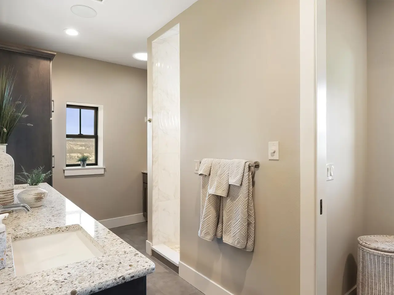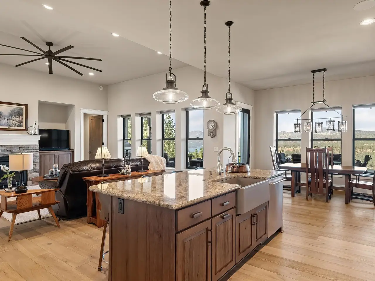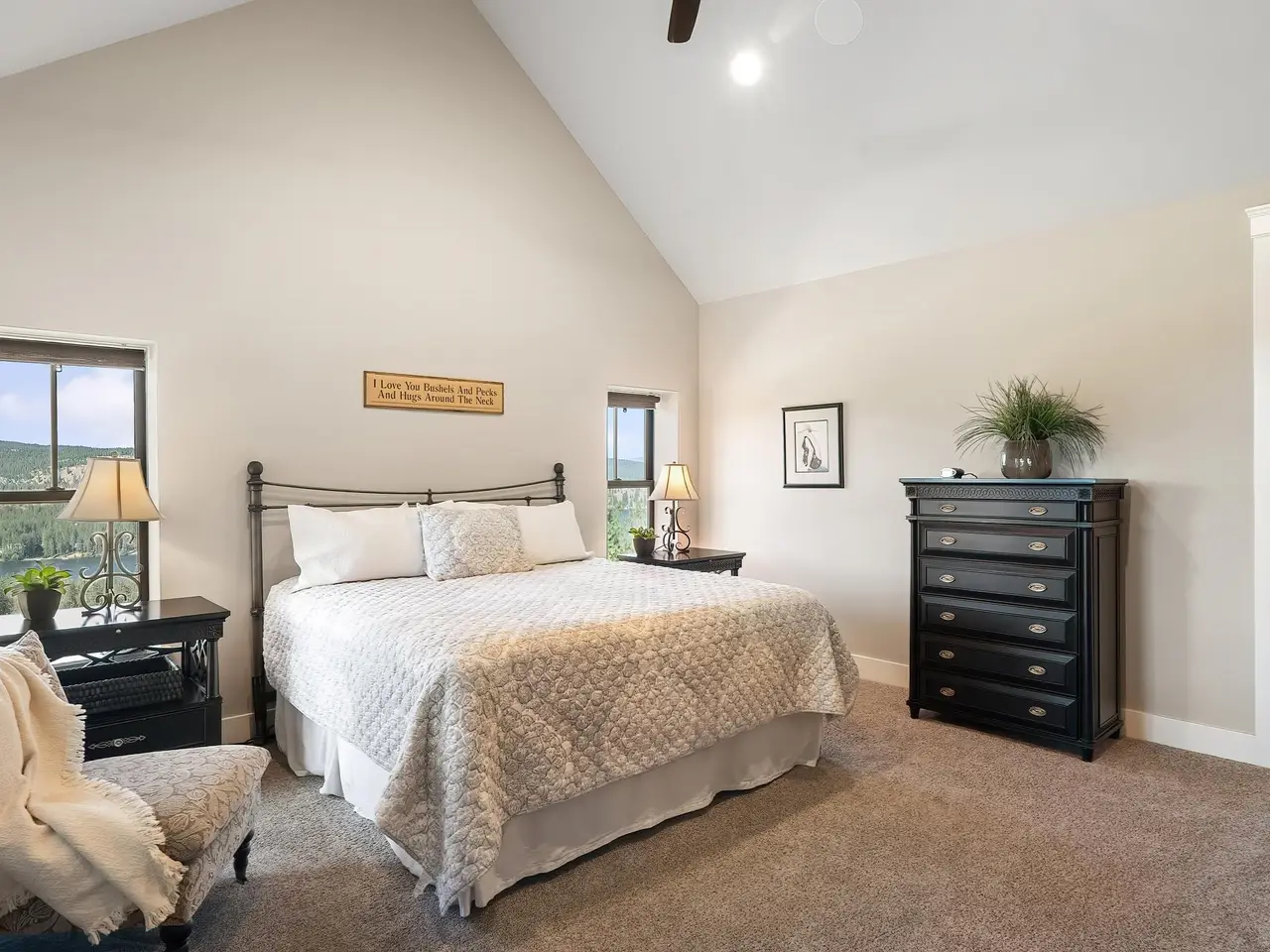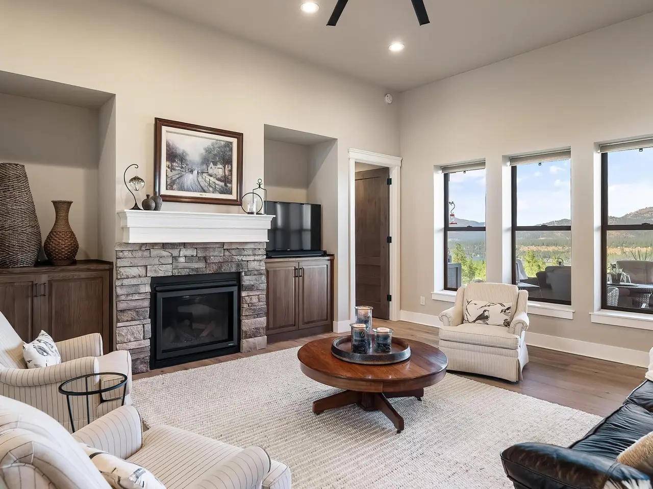 There is so much to love about this stunning property with sweeping views of Lake Spokane & Mt. Spokane. This home features the BEST of everything with 4-bedrooms and 5 bathrooms. Enjoy 1-level living in this thoughtfully designed home with the primary suite and two additional en-suite bedrooms on the main floor, plus a stylish half bath for guests. Upstairs you'll find a spacious 416 sq ft retreat with its own half bath, perfect for a home office, art space, or guest suite. Featuring engineered wood floors, 8-foot knotty alder doors, 10 ft vaulted ceilings, hard surface counters throughout and high-end appliances including a Frigidaire Professional Series refrigerator/freezer, GE Monogram induction cooktop, convection oven/microwave & warming drawer. The chef's kitchen moves outdoors with a 36' built-in DCS barbecue grill, 2-burner gas cooktop & a large covered patio with stamped concrete. An oversized 2-car attached garage is complemented by a massive 40x60 shop w/ a 14-ft center door w/ space for a 35' RV.