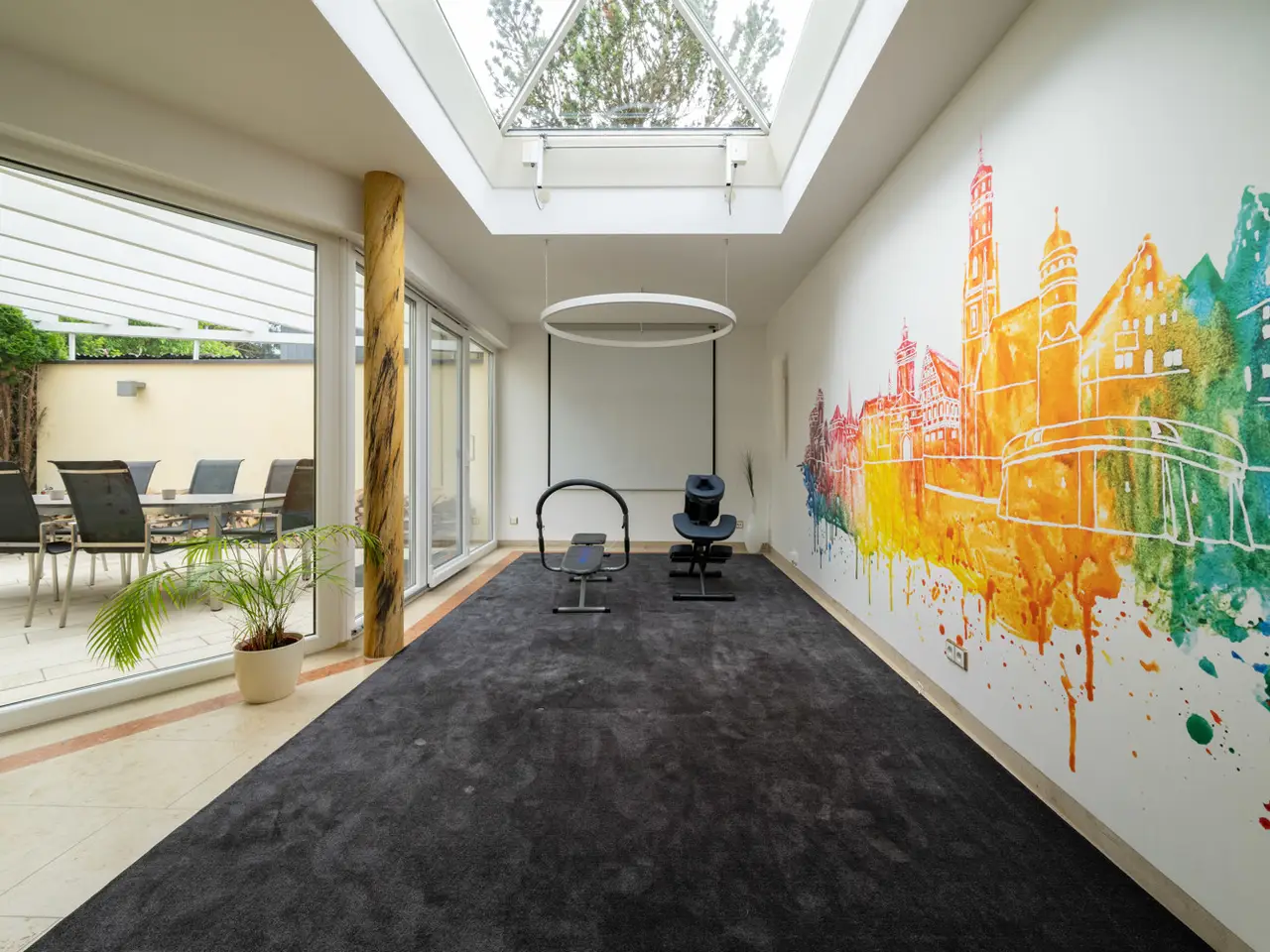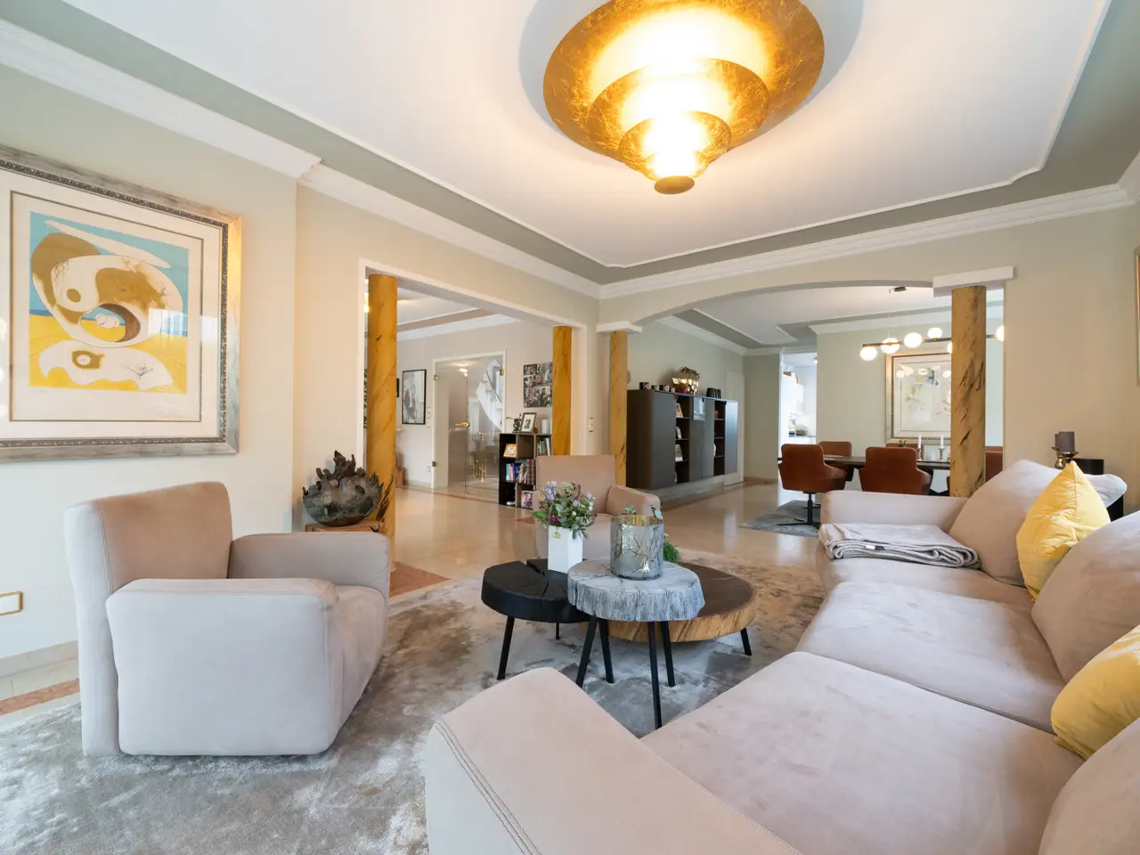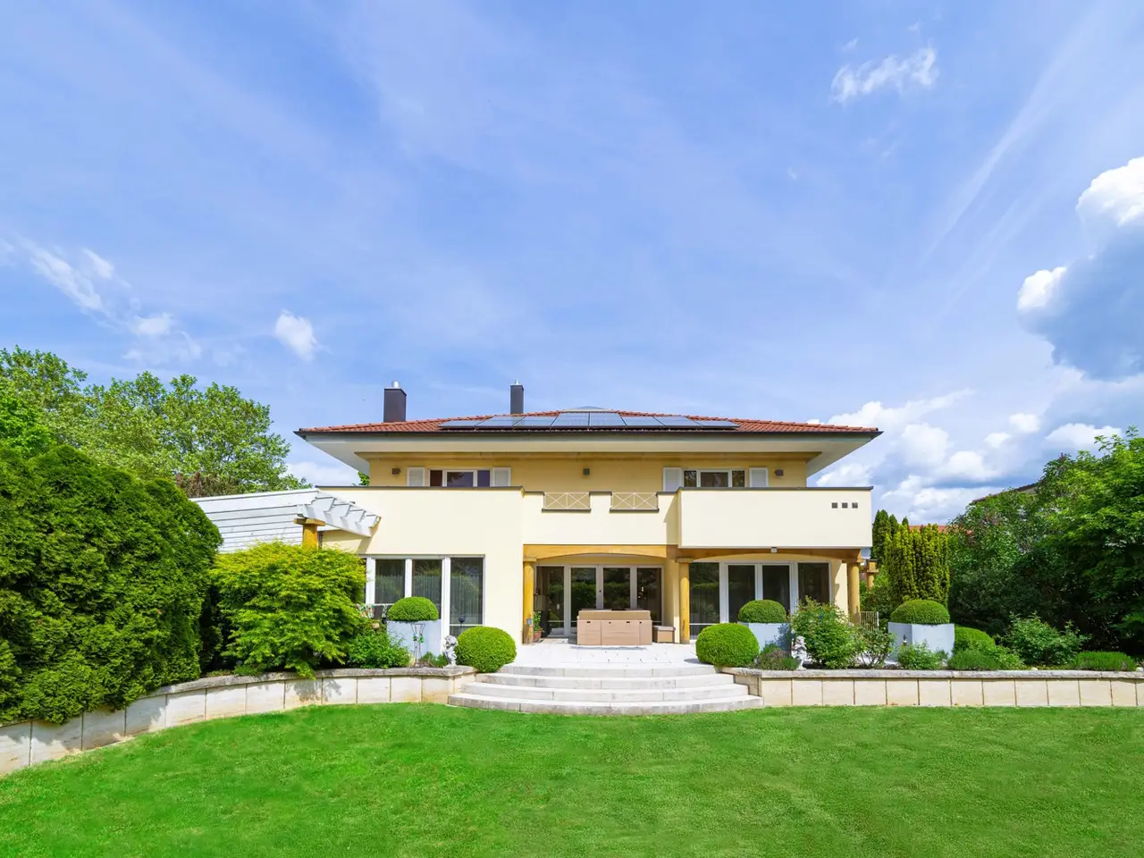 Welcome to a property that offers more than just living space - it embodies a lifestyle. This extraordinary town villa, built in 2004, stands on a generous plot of approx. 981 m² and combines sophisticated architecture, modern technology and pure quality of life on around 412 m² of living space. As soon as you enter the prestigious entrance hall, you can sense the special character of this house: high-quality marble, gold-plated accents and an architecturally sophisticated interior design welcome residents and guests with a touch of grandeur. The spaciousness is continued in all areas - spread over two full floors, a total of eight stylish rooms await you, including up to four bedrooms. Three elegantly appointed bathrooms and a separate guest WC provide the necessary comfort for families and discerning visitors. At the heart of the house is the open-plan living and dining area - flooded with light, with a view of the greenery and equipped with a fireplace that provides warmth and atmosphere in the evenings. A high-quality, as-new fitted kitchen blends seamlessly into the elegant overall concept and invites you to enjoy moments of cooking pleasure. A special highlight is the exclusive wellness area with sauna, shower and WC - your very own personal retreat for relaxation and recreation. The villa also impresses with its diversity in the outdoor area: two spacious terraces, a stylish covered outdoor seating area and a pergola with an outdoor fireplace create space for spending time together outdoors. The additional roof terrace offers a wonderful view over the surrounding area - perfect for sunny afternoons or relaxed evenings with friends. Technically, the villa is of the highest standard: a sophisticated heating system consisting of stove, central and underfloor heating ensures a pleasant indoor climate all year round. A modern BUS system and an alarm system ensure a high level of comfort, efficiency and security. The space available for cars also leaves nothing to be desired: The spacious triple garage offers comfortable space for three vehicles, supplemented by three additional outdoor parking spaces - ideal for families with several vehicles or for visitors. The house has a full basement and, with approx. 172 m² of usable space, opens up additional possibilities - whether for hobbies, fitness or storage. An integrated photovoltaic system operates on the modern hipped roof, making a sustainable contribution to energy efficiency. The solid brick construction stands for quality, durability and a healthy living environment. The location? Also exceptional: the historic old town of Nördlingen - one of the most charming towns in southern Germany - is just a three-minute walk away. And yet here you can enjoy a quiet, upscale living environment with plenty of privacy and perfect connections. Schools, kindergartens, medical care and shopping facilities are in the immediate vicinity - an ideal environment for families, doctors and discerning individualists. This villa is not just a home - it is a place of inspiration, tranquillity and representation. Come and see this rare offer for yourself and be inspired by a personal viewing.