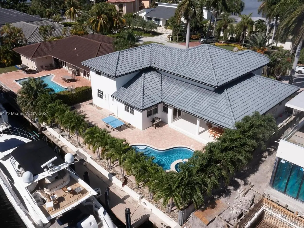 Welcome to this stunning 5-bedroom, 4-bathroom waterfront masterpiece in the prestigious, guard-gated community of Eastern Shores. With direct ocean access and no fixed bridges, this property offers the ultimate in luxury and convenience for boating enthusiasts, featuring a private dock capable of accommodating an 80-foot yacht and a Wave runner elevator lift for added water sport enjoyment. Designed with modern elegance, this home boasts soaring high ceilings, exquisite marble flooring, and premium granite countertops throughout. Hurricane-impact windows ensure safety and peace of mind, while the home is also equipped with 4 separate A/C zones, a heated pool, and a relaxing spa to elevate your living experience.