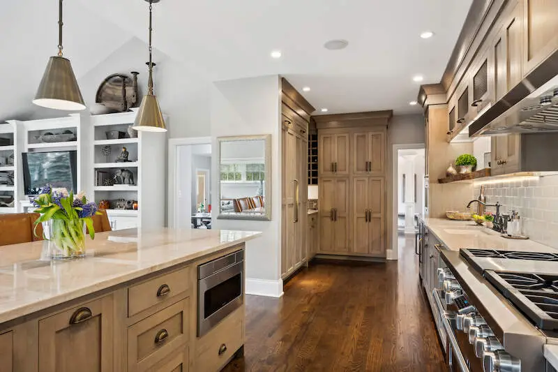 Custom kitchen with Taj Mahal c-tops & oak cabinetry