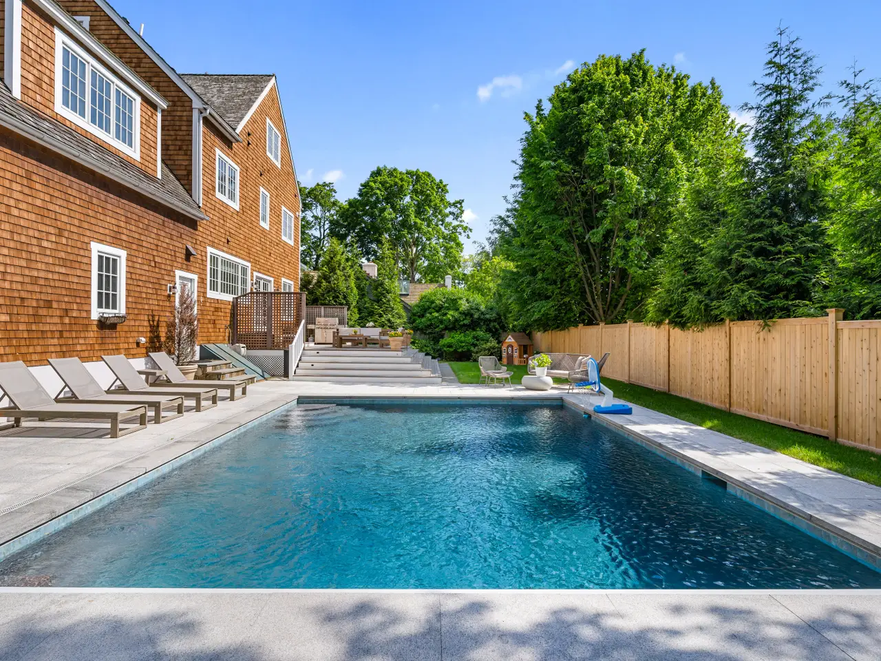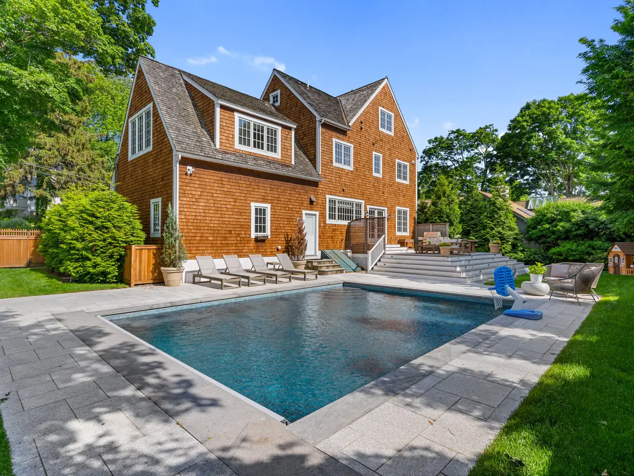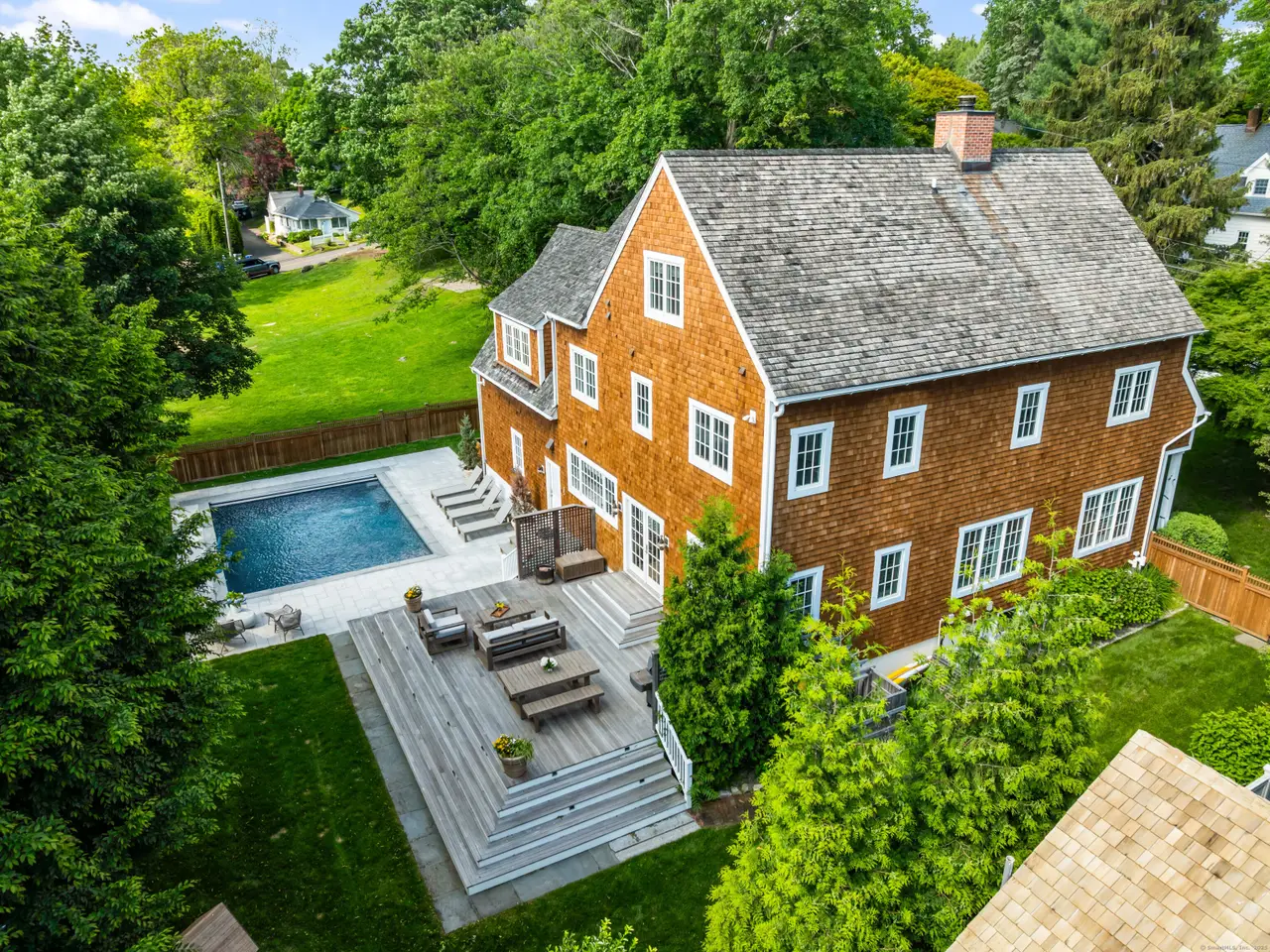 This is the one you've been waiting for in Rowayton! Walk to town with sea breezes guiding the way. Freshly painted and professionally staged, this sun-filled Colonial with many updates and in-ground pool is perfect for those who want extra room for friends and family, but offers a cozy feel when it's 'just you'! The open-concept kitchen and spacious dining area overlook the private backyard and pool, with French doors opening to lushly landscaped grounds-perfect for indoor-outdoor living. The main level features a generous living room with fireplace and an inviting sitting room with desk area, plus ample mudroom. Upstairs, the second floor offers four large bedrooms, including a fully renovated primary suite with vaulted ceilings, large walk-in closet, and a luxurious spa-like bath. All bathrooms have been updated, and two additional bedrooms are ensuite. The third floor provides a fifth bedroom with beautiful full bath, and office. The finished basement includes a bright playroom with climbing wall plus TV room, enhanced by a professional waterproofing system and lots of storage space. Additional updates include: new A/C condensers, pool and patio improvements, irrigation system, new fencing, outdoor shower, new washer/dryer. This is the trifecta of beautiful space, both indoor and outdoor, great location and amazing price in gorgeous Rowayton. Don't wait to see it!