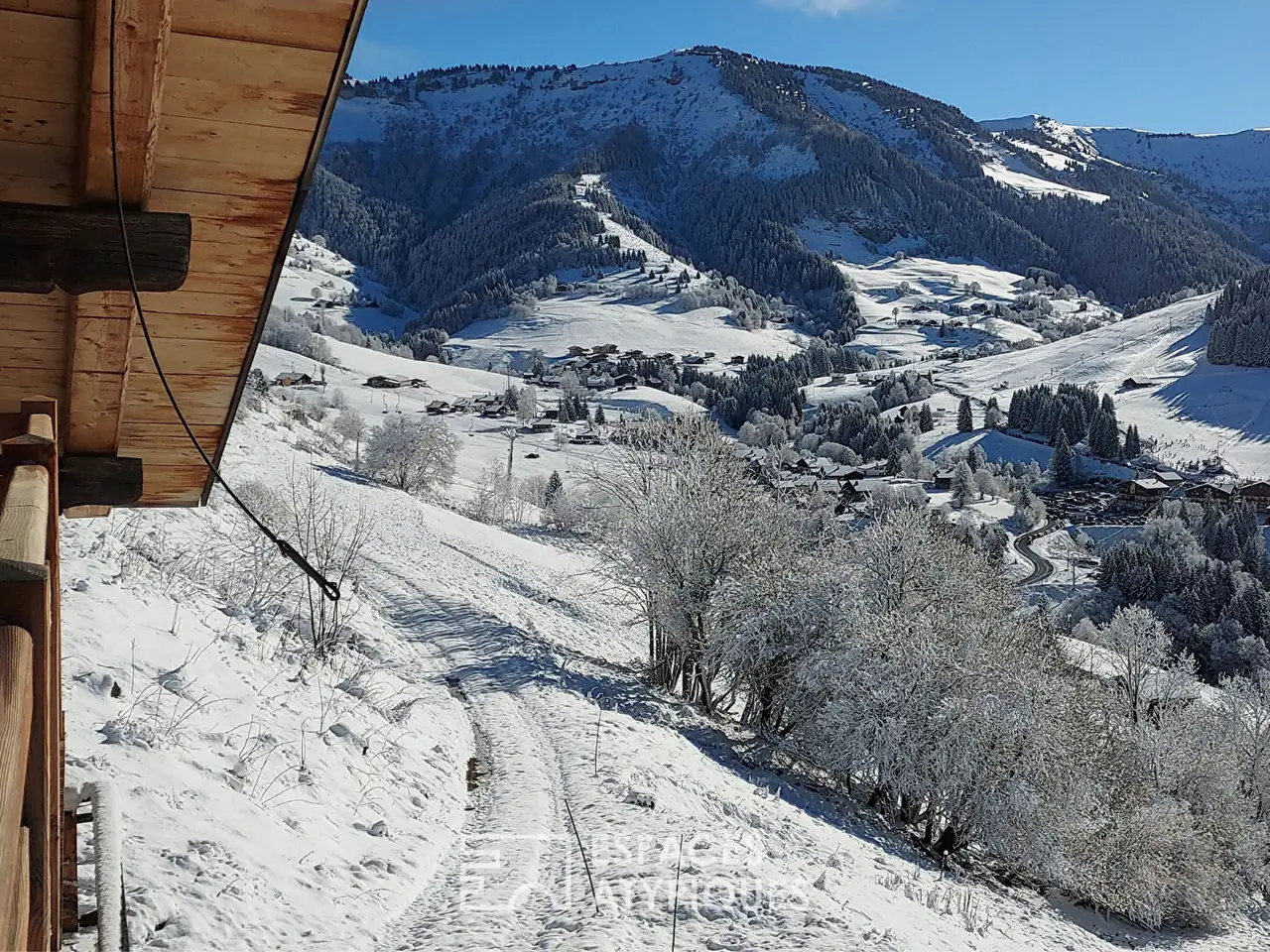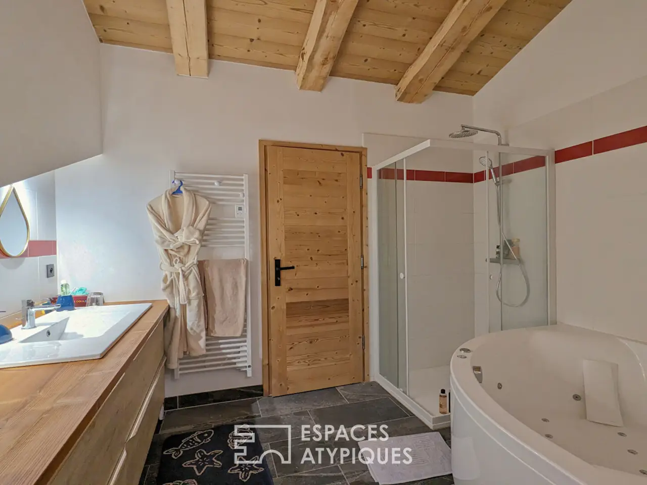 L'escalier conduit au premier etage, lequel a ete agrandi en 2021 par les proprietaires actuels. Celui-ci comprend un vaste espace de vie avec vue degagee sur la nature environnante, offrant un panorama exceptionnel sur les montagnes du Beaufortain. Ce niveau abrite egalement trois chambres, une salle d'eau, ainsi qu'une suite parentale avec salle de bain.