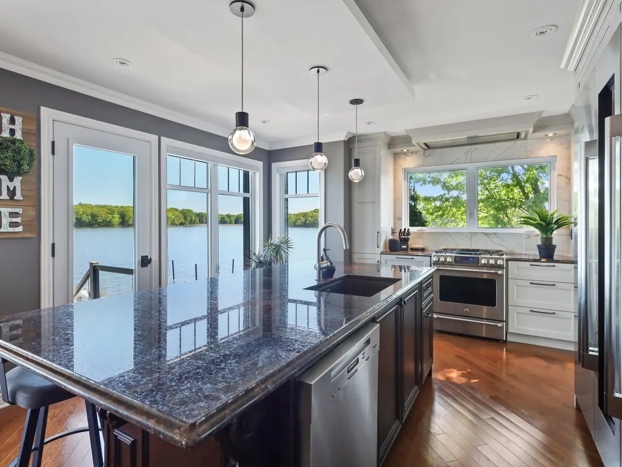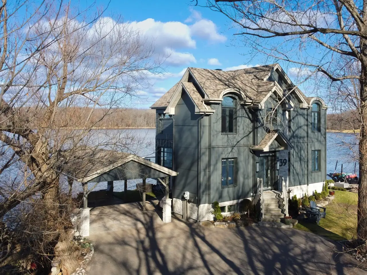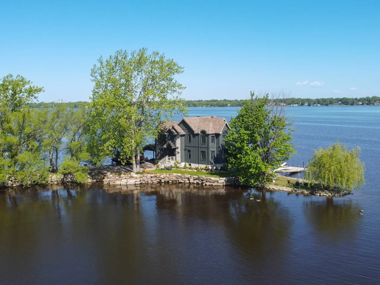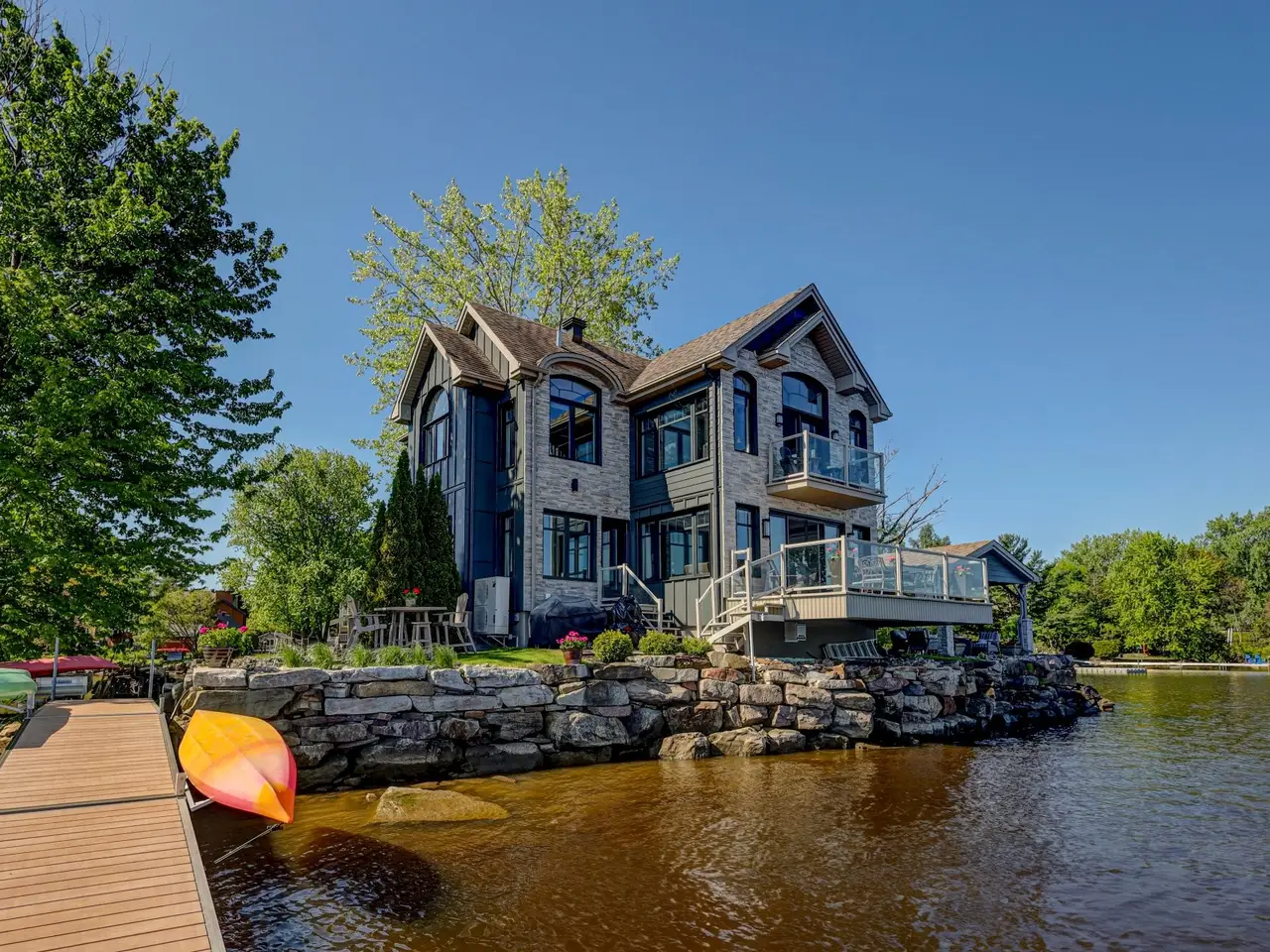 Experience unparalleled waterfront living on a private peninsula with 360-degree views of Lac St-Louis, gated entrance, and a stunning unistone driveway. This exceptional home features three fireplaces and an open-concept main floor with breathtaking views. The chef's kitchen boasts granite counters and a butler's pantry. Upstairs, the retreat-style primary suite offers walls of windows, 10-foot ceilings, a spacious walk-in closet, and an ensuite. 2 bedrooms with basement or office that can be converted into a 3rd bedroom. Built in 2008 and beautifully rejuvenated in 2021 with new siding, triple-pane windows, and exterior doors. A rare gem.
