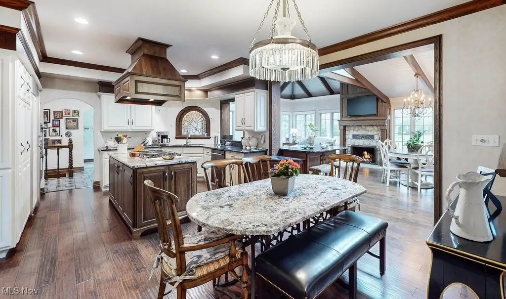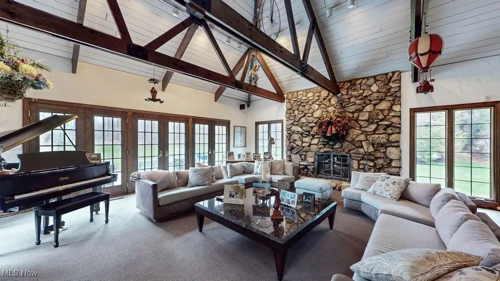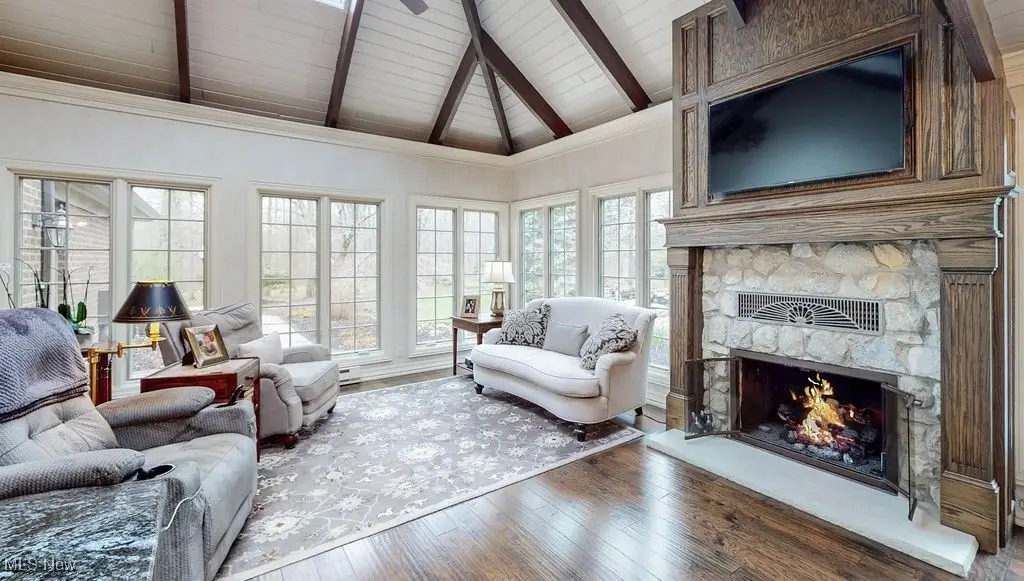 Multiple fireplaces including custom-crafted, stone, and sunroom