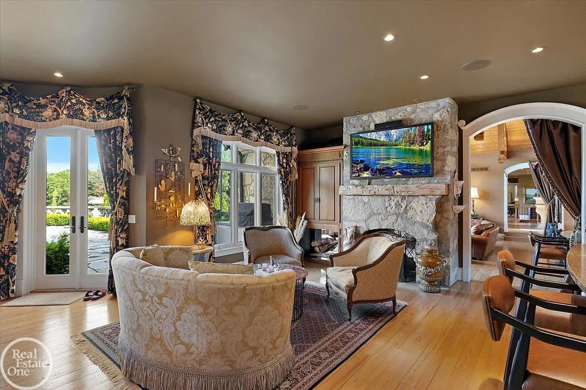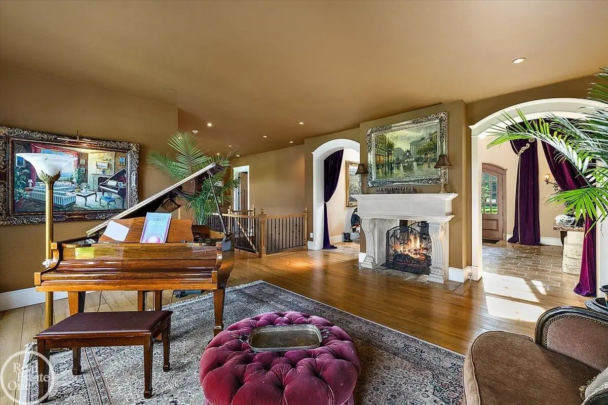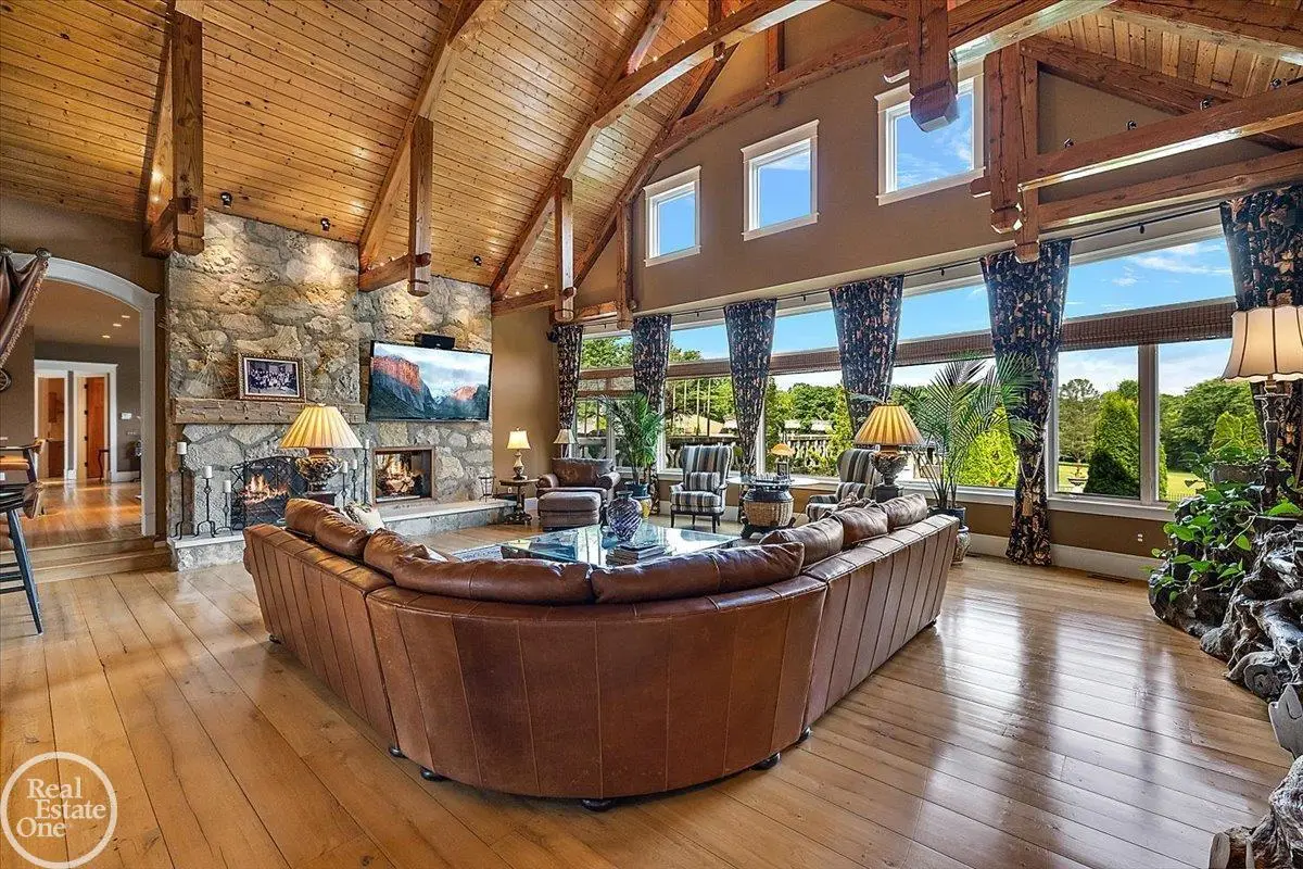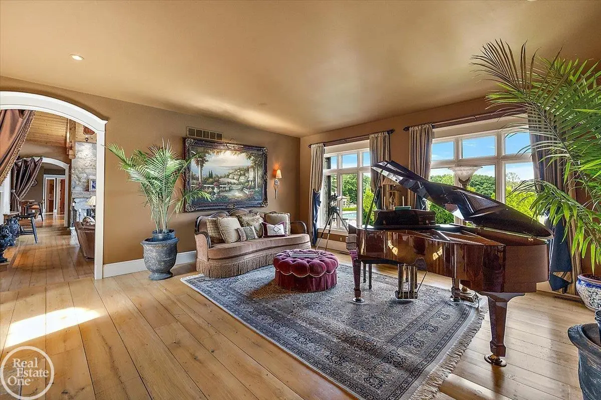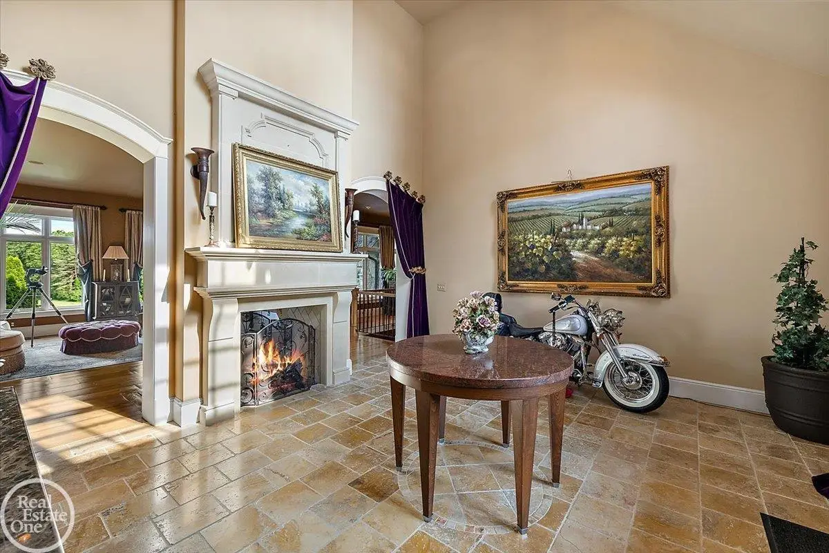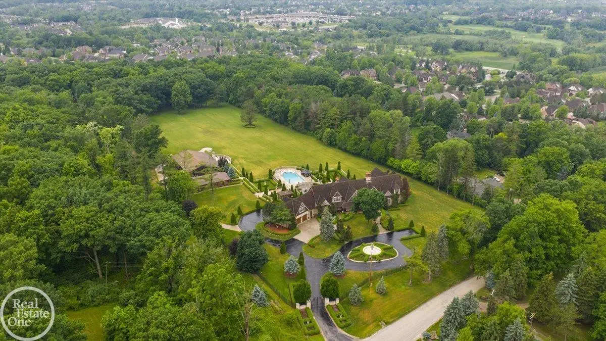 Discover an exceptional opportunity with this private 12-acre French Country Manor Estate in Oakland Township, offering over 12,000 square feet of stunning living space. Enjoy expansive terraced patios leading to beautifully designed Parterre Gardens and a built-in swimming pool measuring 25 feet by 55 feet. A helipad adds convenience for helicopter access right in your backyard, along with a state-of-the-art helicopter hangar. The property features extensive landscaping and an irrigation system covering all 12 acres, a 6-car garage, ample hangar storage for car enthusiasts, and a horse barn equipped with 6 stalls. The gourmet kitchen is a chef's dream, complete with a separate pizza oven and commercial-grade appliances. The spacious great room boasts beamed ceilings and large windows that offer views of the grounds. The estate includes 6 fireplaces, 6 bedrooms, a private loft area, maple-planked flooring, and a finished walk-out lower level with a 15-foot by 10-foot indoor lap pool and gaming spaces.