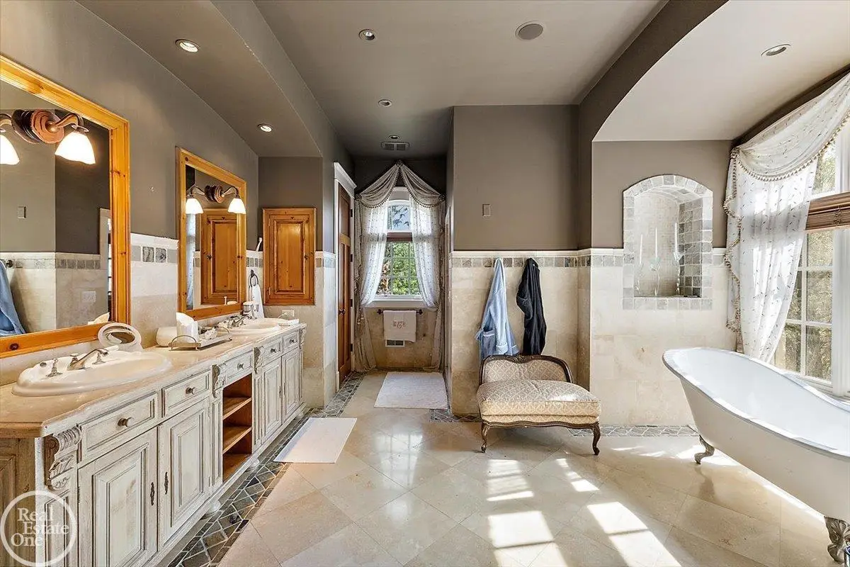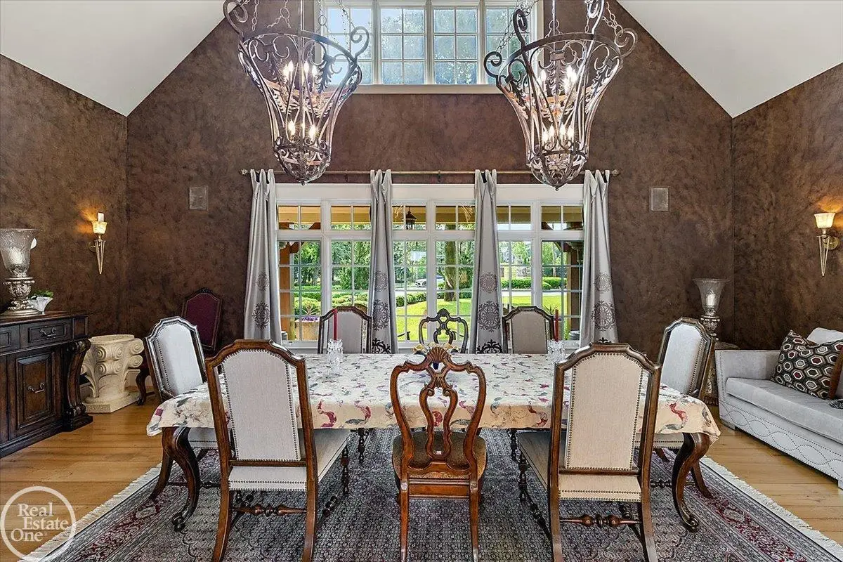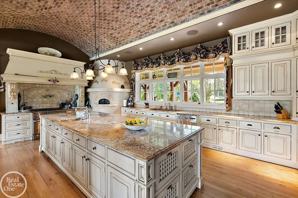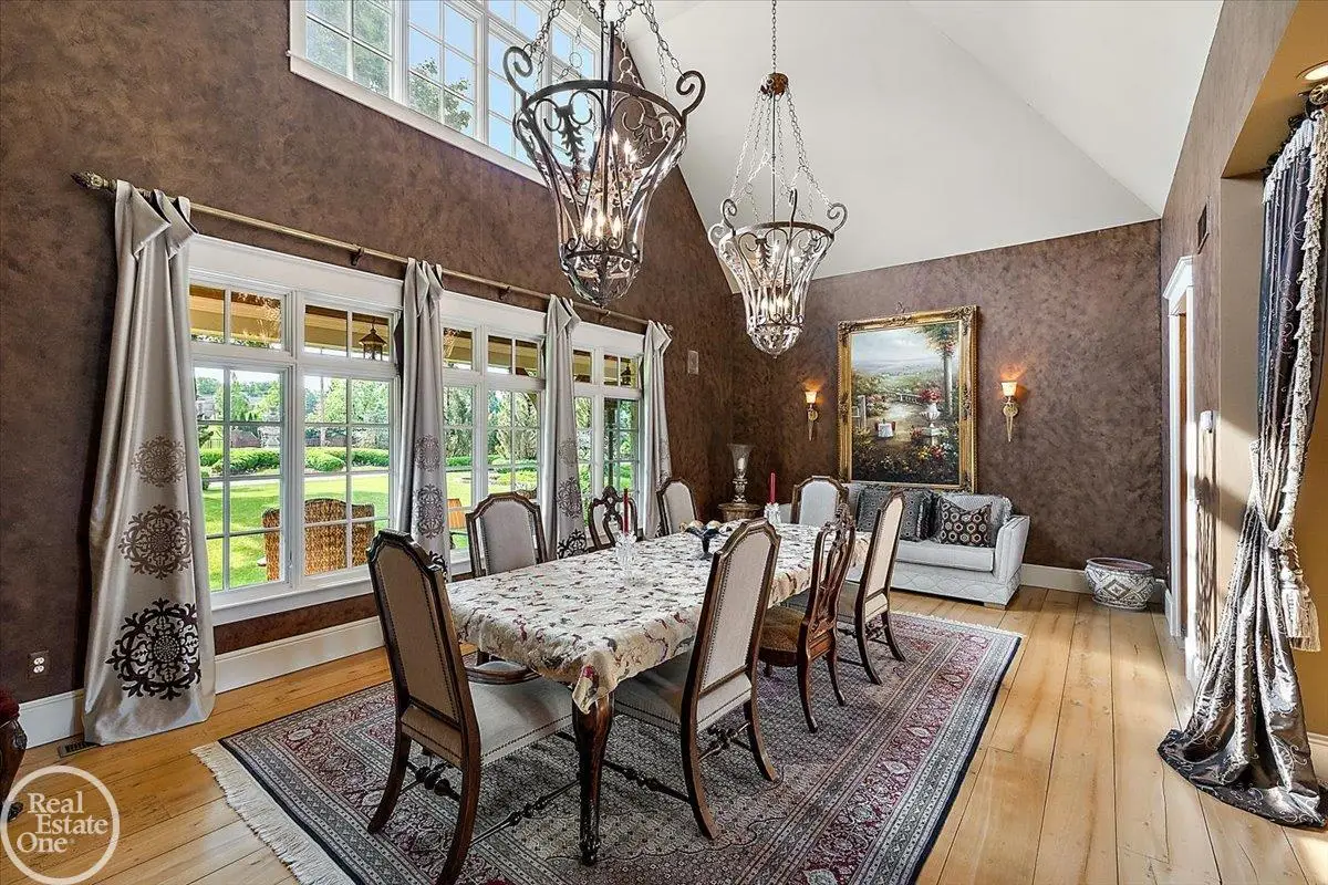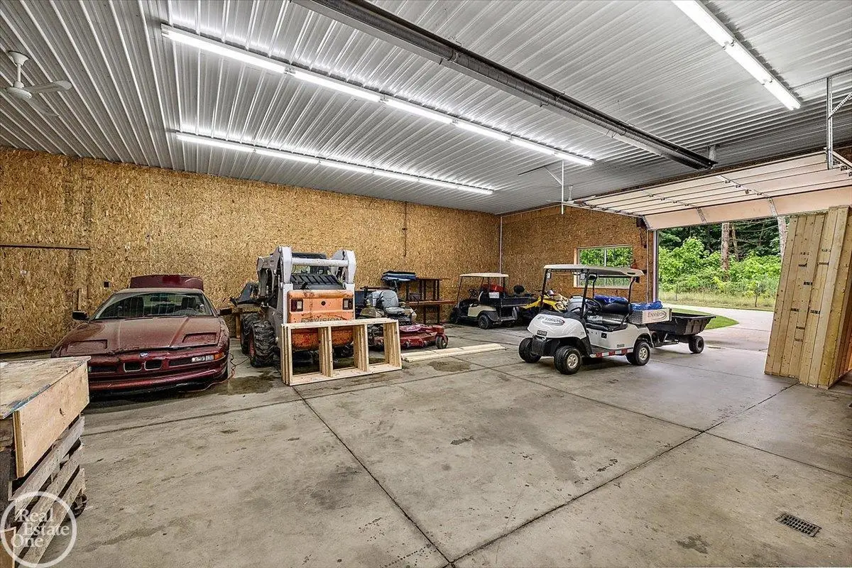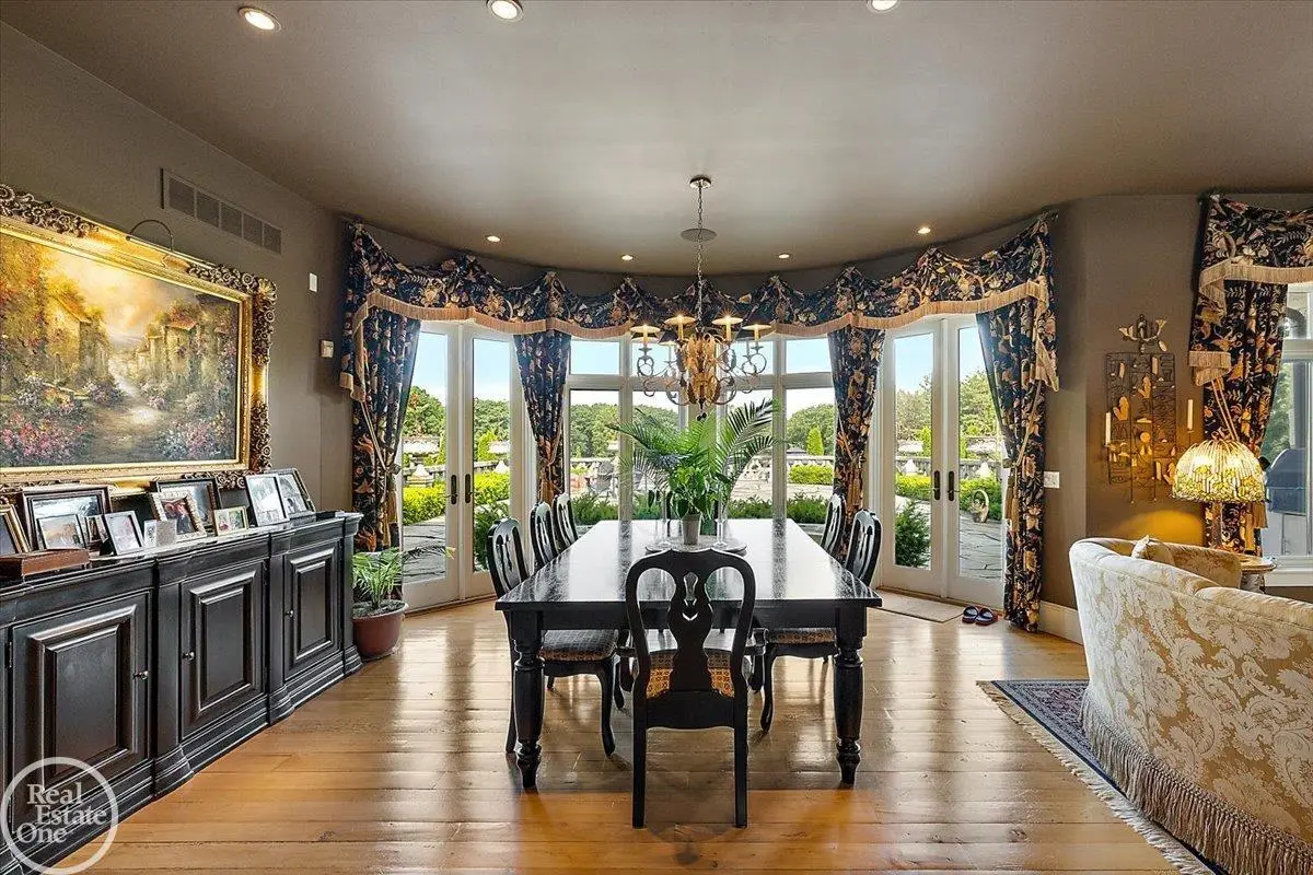 Discover an exceptional opportunity with this private 12-acre French Country Manor Estate in Oakland Township, offering over 12,000 square feet of stunning living space. Enjoy expansive terraced patios leading to beautifully designed Parterre Gardens and a built-in swimming pool measuring 25 feet by 55 feet. A helipad adds convenience for helicopter access right in your backyard, along with a state-of-the-art helicopter hangar. The property features extensive landscaping and an irrigation system covering all 12 acres, a 6-car garage, ample hangar storage for car enthusiasts, and a horse barn equipped with 6 stalls. The gourmet kitchen is a chef's dream, complete with a separate pizza oven and commercial-grade appliances. The spacious great room boasts beamed ceilings and large windows that offer views of the grounds. The estate includes 6 fireplaces, 6 bedrooms, a private loft area, maple-planked flooring, and a finished walk-out lower level with a 15-foot by 10-foot indoor lap pool and gaming spaces.