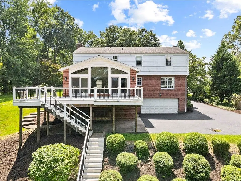 Spacious five-bedroom Brick Colonial backing to a Nature Preserve. Welcome to this beautiful American Dream Home! Two-story colonial on a desirable lot. From the entry with a wood & painted spindle staircase you'll find a gracious place to welcome your guests with a convenient powder room & guest closet. Gleaming hardwood floor throughout the home. The exciting family room features a distinctive wood burning fireplace, beamed ceilings that expands to a larger room with vaulted ceilings & dramatic window wall overlooking the private tiered yard & expansive deck, for outdoor enjoyment with a view of Falling Springs Park. Kitchen boasts granite counters, wood cabinets & stainless steel appliances, make it a functional works space for the home cook. Formal Dining Room adjoins the living room with a gas fireplace & large picture window. Upstairs finds the primary suite & four sizable bedrooms & hall bath. Finished lower level with wet bar & full bath, perfect for playroom or home office. 3 car garage!