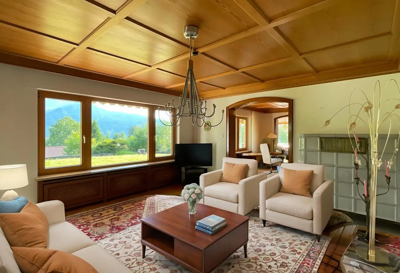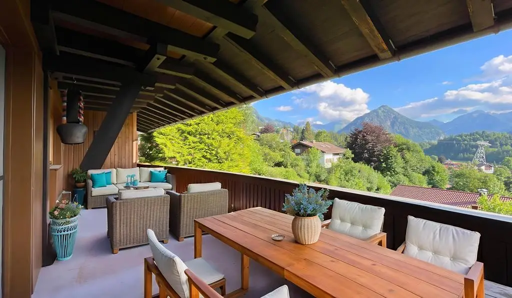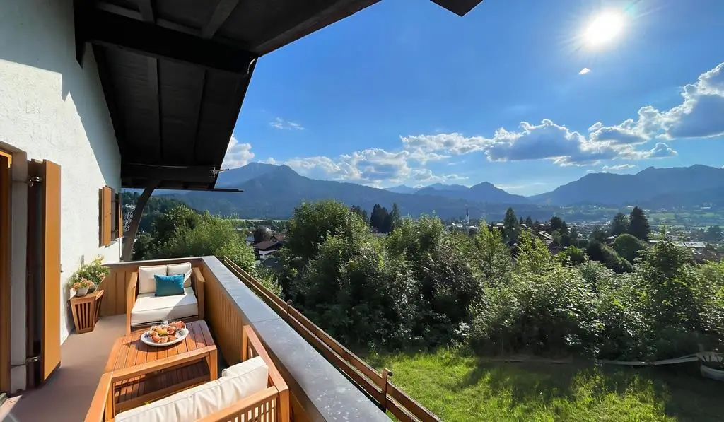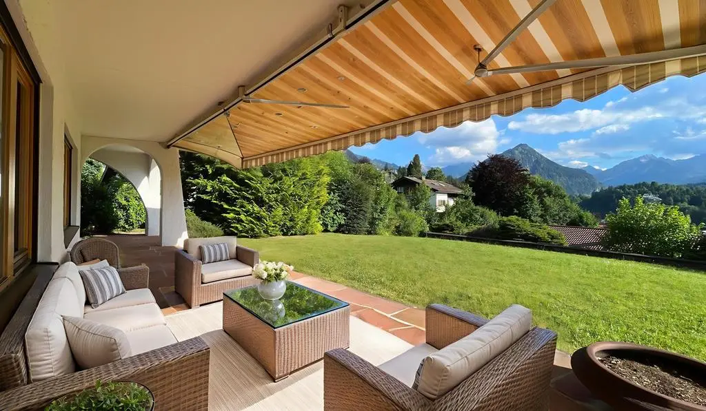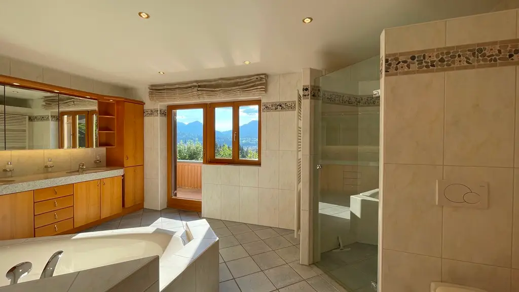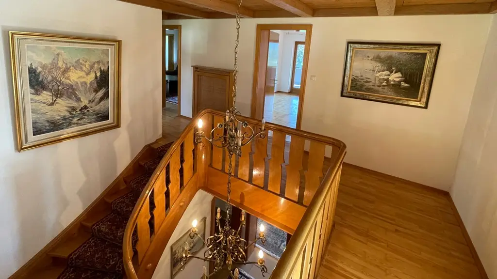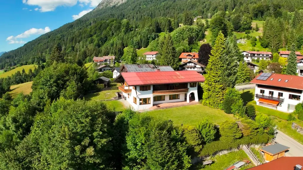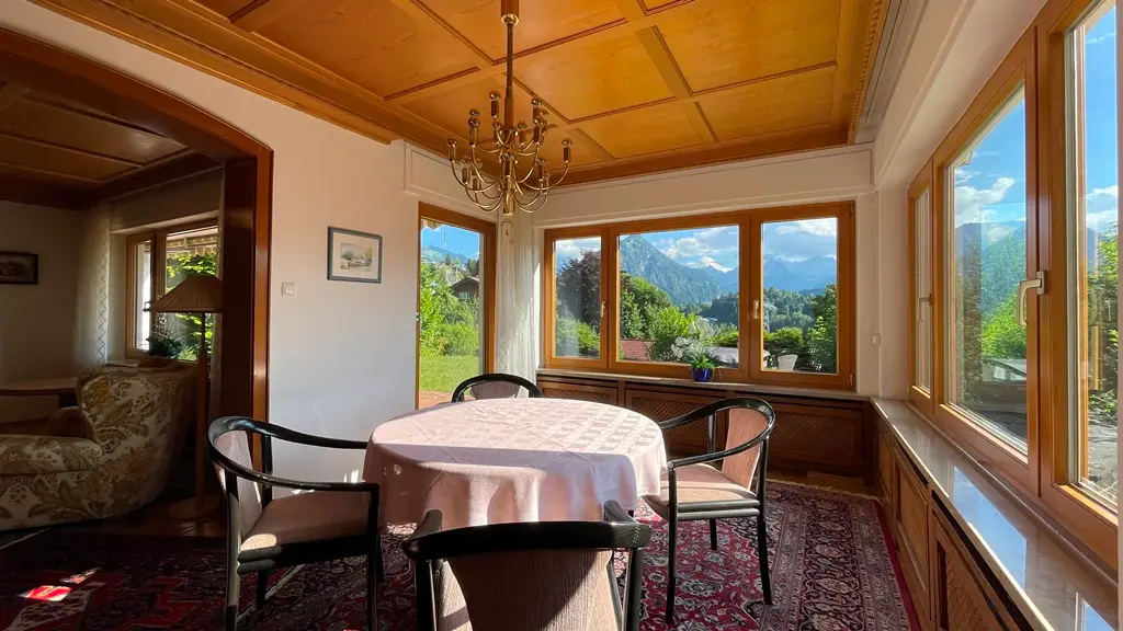 In one of the most sought-after and at the same time rarest locations that Oberstdorf has to offer, this detached house presents itself as a real gem - a property that only comes on the market once in a generation. The address "Am First" is already one of the village's premium locations per se, but this property occupies an absolute top position among them. In the middle of the exclusive residential areas "Plattenbichl" and "Am First", this property stands out as a top location - with an unobstructable panorama, absolute tranquillity and a plot size that is hard to find today. The special atmosphere greets you as soon as you enter: stylish architecture, lovingly preserved elements from the 1959 construction year and a condition that impresses with continuous maintenance and high-quality modernization. The exterior is characterized by mature structures and an elegance that is never loud, but always present. The property offers breathtaking views of the surrounding mountains - including unobstructed views of the ski jump - while at the same time offering absolute privacy. The spacious outdoor seating areas on both floors have been designed with a keen sense of orientation and panorama and invite you to linger at any time of day. The interior of the house is characterized by fine materials, extraordinary details and furnishings that are above average even for the year of construction. High-quality parquet flooring (partly in a herringbone pattern), elaborate solid wood ceilings, coffered ceilings and well thought-out fixtures run through the entire house. Windows and shutters have been continuously modernized - the stylish folding shutters on the upper floor in particular underline the charming overall appearance. With three bedrooms and three bathrooms on two floors, the room layout offers an ideal setting for families, guests or retreats. Particularly noteworthy is the integrated wellness area with sauna, large shower and relaxation zone - an oasis of relaxation with direct access to the outdoor seating area. The technical infrastructure has been extensively renovated and future-proofed: a modern pellet heating system was installed just last year - a reliable and efficient heating system with generous buffer storage. In addition, the basement area was professionally protected and structurally upgraded to ensure a dry, stable indoor climate - discreetly and sustainably implemented without visibly interfering with the fabric of the building. The garage is directly connected to the house, heated and accessible via a garage forecourt, which is also suitable as an additional parking space. This property is not just a house - it is a rare piece of Oberstdorf living culture that offers its new owners much more than just a home: a retreat, a center of life, a place for lasting memories. Such properties are not usually sold - they are inherited. The fact that it is now coming onto the market is a unique opportunity for lovers of exclusive properties in exceptional locations. An offer of exceptional quality - for people who are looking for something special and appreciate the rare.