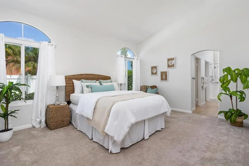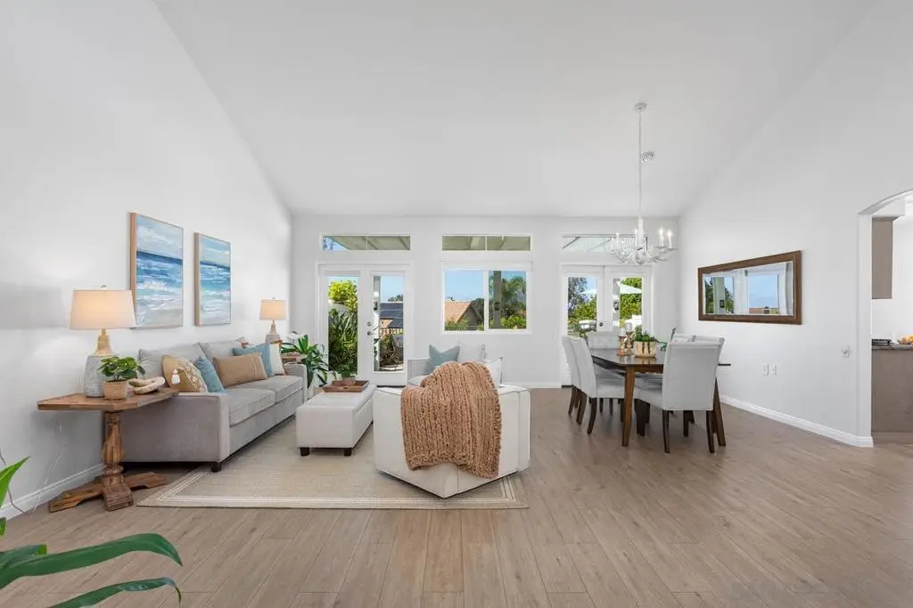 Experience coastal living at Villa Trieste, a desirable 55+ gated community in Oceanside. This 1,860 sq. ft. single-story townhouse with a versatile loft (optional 3rd bedroom) offers 2 bedrooms, 2 bathrooms, and a bright, open floor plan. Natural light pours through soaring ceilings and three sets of French doors--two opening from the family/dining room and another from the kitchen--inviting ocean breezes inside. The kitchen blends function and charm with granite counters, stainless steel appliances, and a cheerful breakfast nook framed by windows. The spacious primary suite includes vaulted ceilings, dual sinks, a large walk-in closet, and a beautifully tiled shower. A comfortable guest bedroom and bathroom complete the main floor, while the loft provides flexible space for an office, hobby room, or visiting family. Step outside to your private backyard oasis with a pergola-covered patio, lush landscaping, and distant ocean views peeking over rooftops--perfect for relaxing with friends or enjoying quiet mornings. Additional highlights include central A/C, indoor laundry, and an attached 2-car garage. Villa Trieste offers resort-style amenities including a clubhouse, pool, and spa, all just minutes from shopping, dining, and the beach.