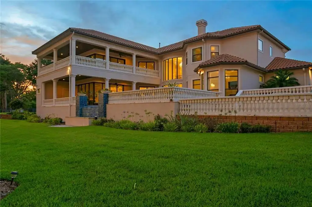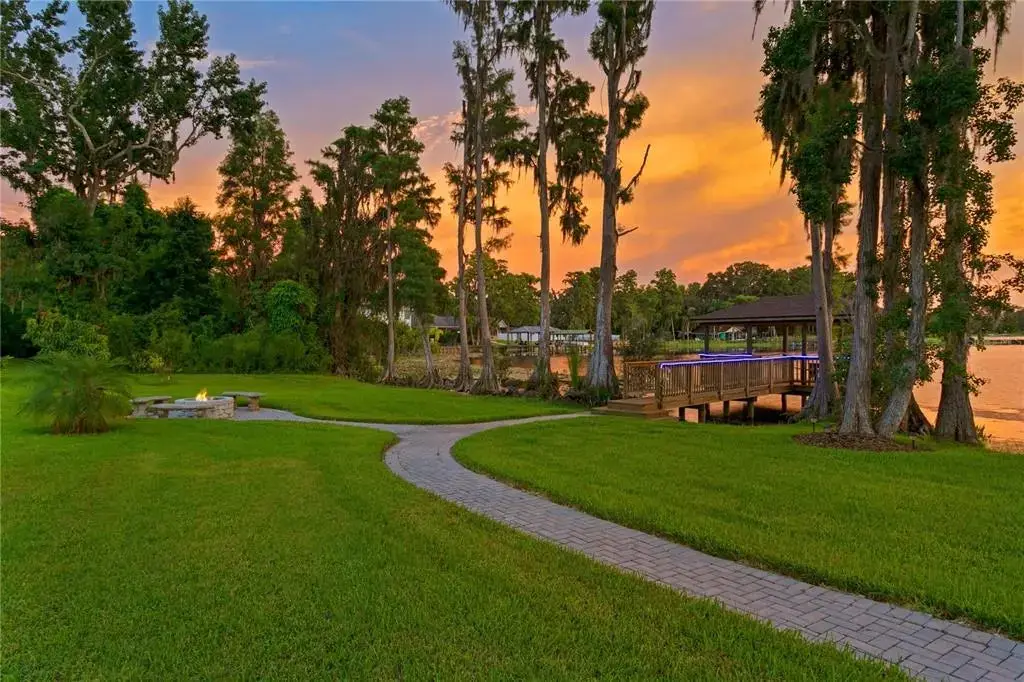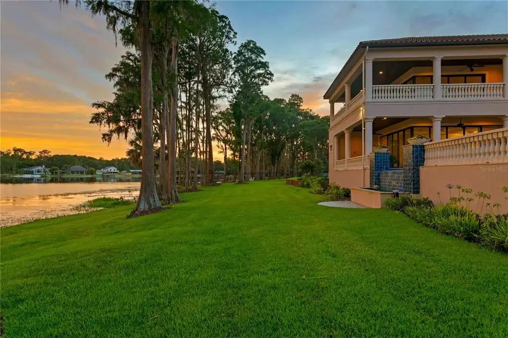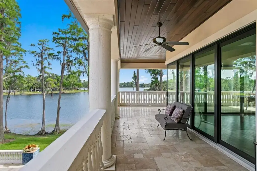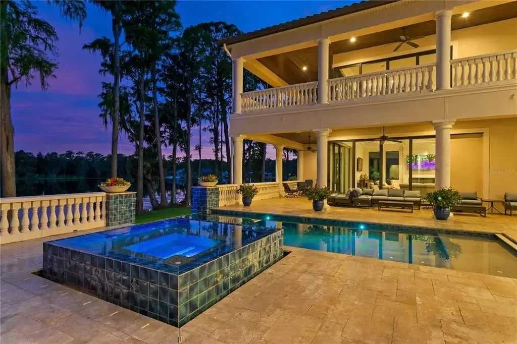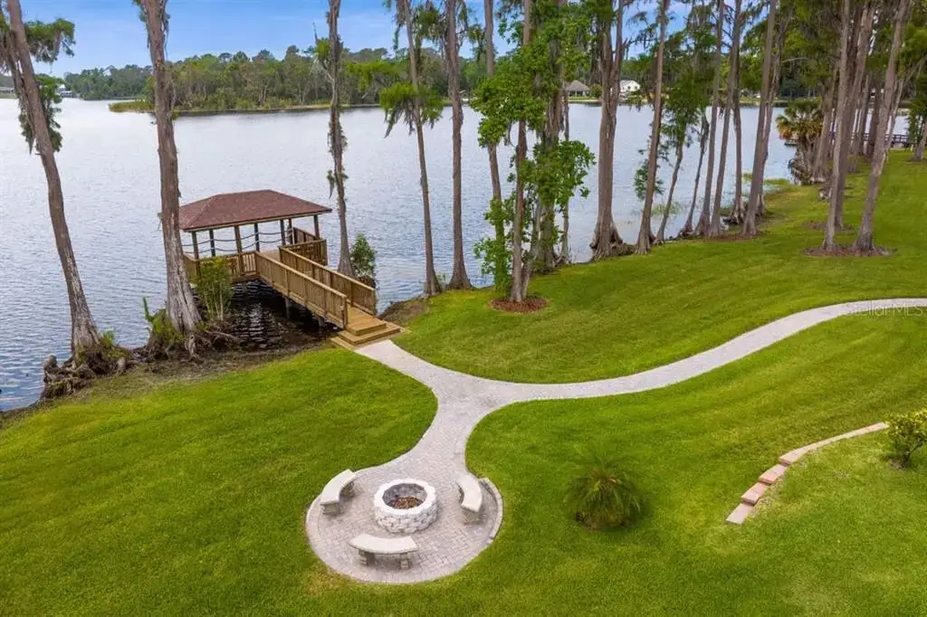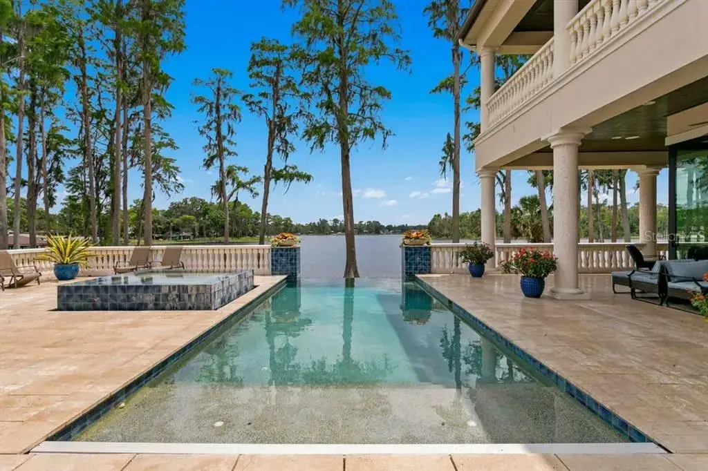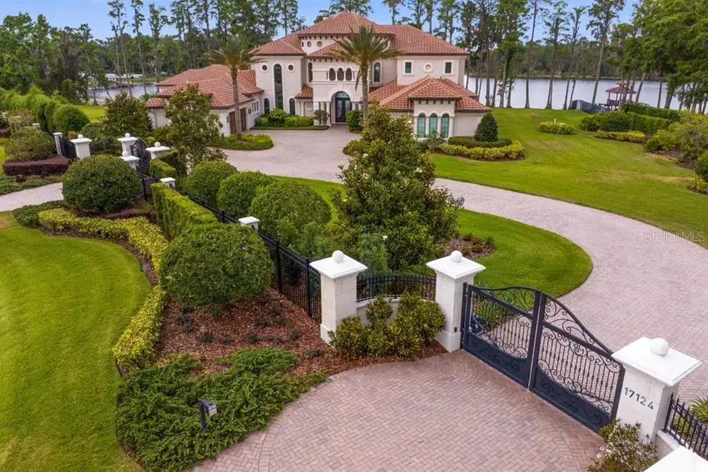 Gated lakefront estate offering space, privacy, and a stunning natural setting—17124 Crawley Road in Odessa is a rare opportunity to live expansively on nearly 6 acres along the tranquil shoreline of Rainbow Lake. With 300 feet of private lake frontage, this custom residence offers 10,545 square feet of living space. Built for both comfort and entertaining, the main house includes 5 bedrooms, 6 full baths, 2 half baths, entertainment space, gym, study, and 2 attached garages—one on each side of the home—designed for convenience and symmetry. Separate guest house features 1 bedroom and 1 full bath. The estate is finished with a pool, spa, and private dock—all with no HOA or CDD fees. Step through the grand double doors into a sweeping foyer with a dramatic double staircase. Straight ahead, the formal living room welcomes you with nearly 24-foot ceilings, gas fireplace, and open view to the pool and lake beyond. The spacious family room serves as a relaxed space with TV, electric fireplace, and sliding glass doors that lead seamlessly to the outdoor terrace. At the heart of the home, the kitchen is both stylish and functional—featuring a striking Cianitus granite island and Cambria Menai quartz on the perimeter, along with a gas range with 1.5 ovens, a separate wall oven, pot filler, microwave and refrigerator, and thoughtful storage. Nearby butler’s pantry with granite countertops and wine refrigerator connects the kitchen to the formal dining room, ideal for entertaining or daily living. Downstairs also includes a primary suite with a fireplace and sitting area, dual custom closets, and a spa-style bath with freestanding tub and oversized walk-in shower. 2 additional ensuite bedrooms are located on the main level. A dedicated study with soaring ceilings and separate gym complete the thoughtful main-level layout. Upstairs, 2 large suites offer the flexibility of dual primary bedrooms, each with its own full bath and walk-in closet. Just beyond, a large entertainment area includes a sunken game room, wet bar with refrigerator, and balcony with balustrades—perfect for entertaining or relaxing. Throughout the home, 8-foot doors, wood flooring, detailed crown and tray ceilings, and custom-finished walk-in closets in every bedroom enhance the design, while both upstairs and downstairs laundry rooms and electric vehicle charging station in the garage add everyday convenience. The separate guest cabana offers a refined yet relaxed extension of the home’s living space. Located just off the pool, it includes a built-in TV, crown and tray ceilings, and walk-in closet, along with full bath and bar with refrigerator. The grounds are the heart of this property. Designed by Ryan Hughes Design Build, the outdoor spaces are a blend of texture, scale, and serenity. Stacked stone retaining walls, lush gardens, fruit trees, and paver walkways surround a heated saltwater pool and spa, fire pit, covered terrace, full summer kitchen, and a separate outdoor full bath for added convenience. At the water’s edge, a private dock features electricity and nautical rope detailing, offering direct access to Rainbow Lake. Located in the heart of Odessa—where luxury homes, wide-open spaces, and natural beauty converge—this estate captures the essence of lakefront living with the convenience of being just minutes from Tampa, major roadways, and top-tier amenities. A rare opportunity to live expansively, privately, and beautifully.