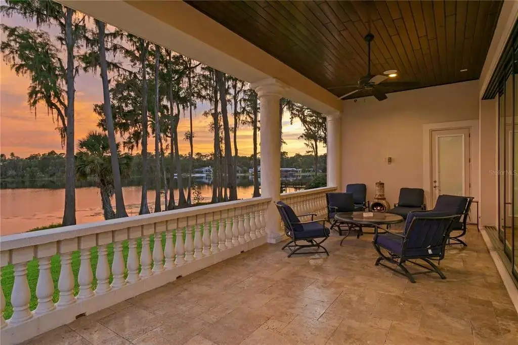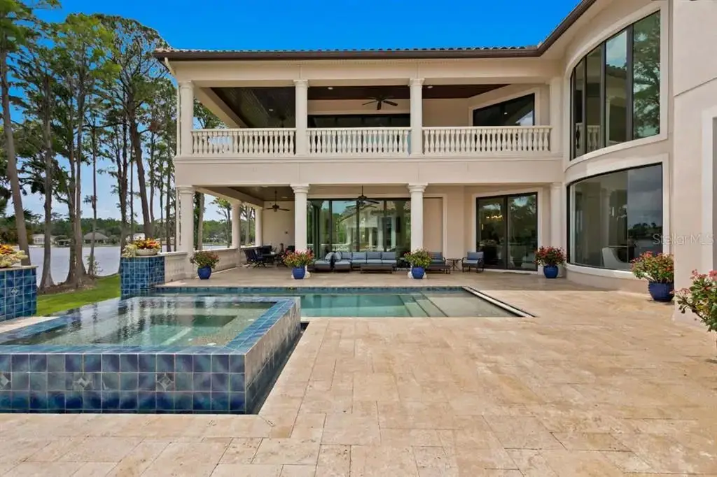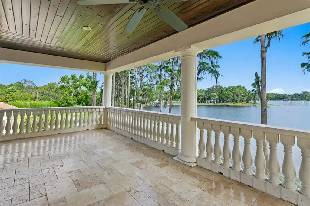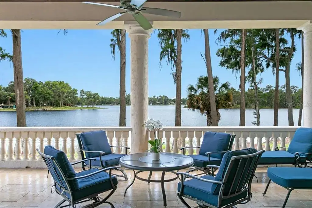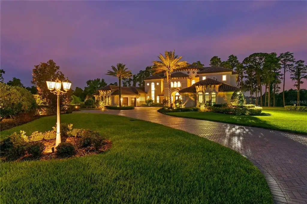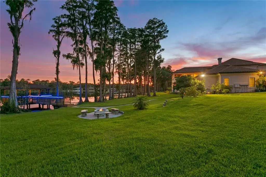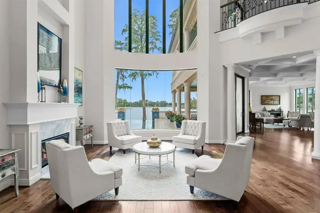 Gated lakefront estate offering space, privacy, and a stunning natural setting—17124 Crawley Road in Odessa is a rare opportunity to live expansively on nearly 6 acres along the tranquil shoreline of Rainbow Lake. With 300 feet of private lake frontage, this custom residence offers 10,545 square feet of living space. Built for both comfort and entertaining, the main house includes 5 bedrooms, 6 full baths, 2 half baths, entertainment space, gym, study, and 2 attached garages—one on each side of the home—designed for convenience and symmetry. Separate guest house features 1 bedroom and 1 full bath. The estate is finished with a pool, spa, and private dock—all with no HOA or CDD fees. Step through the grand double doors into a sweeping foyer with a dramatic double staircase. Straight ahead, the formal living room welcomes you with nearly 24-foot ceilings, gas fireplace, and open view to the pool and lake beyond. The spacious family room serves as a relaxed space with TV, electric fireplace, and sliding glass doors that lead seamlessly to the outdoor terrace. At the heart of the home, the kitchen is both stylish and functional—featuring a striking Cianitus granite island and Cambria Menai quartz on the perimeter, along with a gas range with 1.5 ovens, a separate wall oven, pot filler, microwave and refrigerator, and thoughtful storage. Nearby butler’s pantry with granite countertops and wine refrigerator connects the kitchen to the formal dining room, ideal for entertaining or daily living. Downstairs also includes a primary suite with a fireplace and sitting area, dual custom closets, and a spa-style bath with freestanding tub and oversized walk-in shower. 2 additional ensuite bedrooms are located on the main level. A dedicated study with soaring ceilings and separate gym complete the thoughtful main-level layout. Upstairs, 2 large suites offer the flexibility of dual primary bedrooms, each with its own full bath and walk-in closet. Just beyond, a large entertainment area includes a sunken game room, wet bar with refrigerator, and balcony with balustrades—perfect for entertaining or relaxing. Throughout the home, 8-foot doors, wood flooring, detailed crown and tray ceilings, and custom-finished walk-in closets in every bedroom enhance the design, while both upstairs and downstairs laundry rooms and electric vehicle charging station in the garage add everyday convenience. The separate guest cabana offers a refined yet relaxed extension of the home’s living space. Located just off the pool, it includes a built-in TV, crown and tray ceilings, and walk-in closet, along with full bath and bar with refrigerator. The grounds are the heart of this property. Designed by Ryan Hughes Design Build, the outdoor spaces are a blend of texture, scale, and serenity. Stacked stone retaining walls, lush gardens, fruit trees, and paver walkways surround a heated saltwater pool and spa, fire pit, covered terrace, full summer kitchen, and a separate outdoor full bath for added convenience. At the water’s edge, a private dock features electricity and nautical rope detailing, offering direct access to Rainbow Lake. Located in the heart of Odessa—where luxury homes, wide-open spaces, and natural beauty converge—this estate captures the essence of lakefront living with the convenience of being just minutes from Tampa, major roadways, and top-tier amenities. A rare opportunity to live expansively, privately, and beautifully.