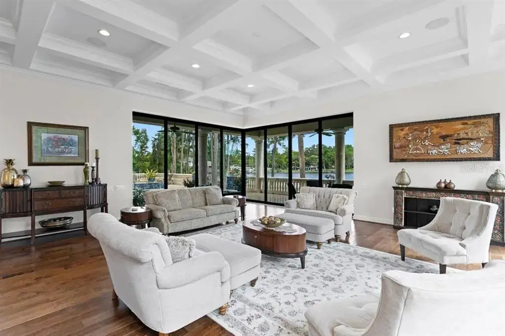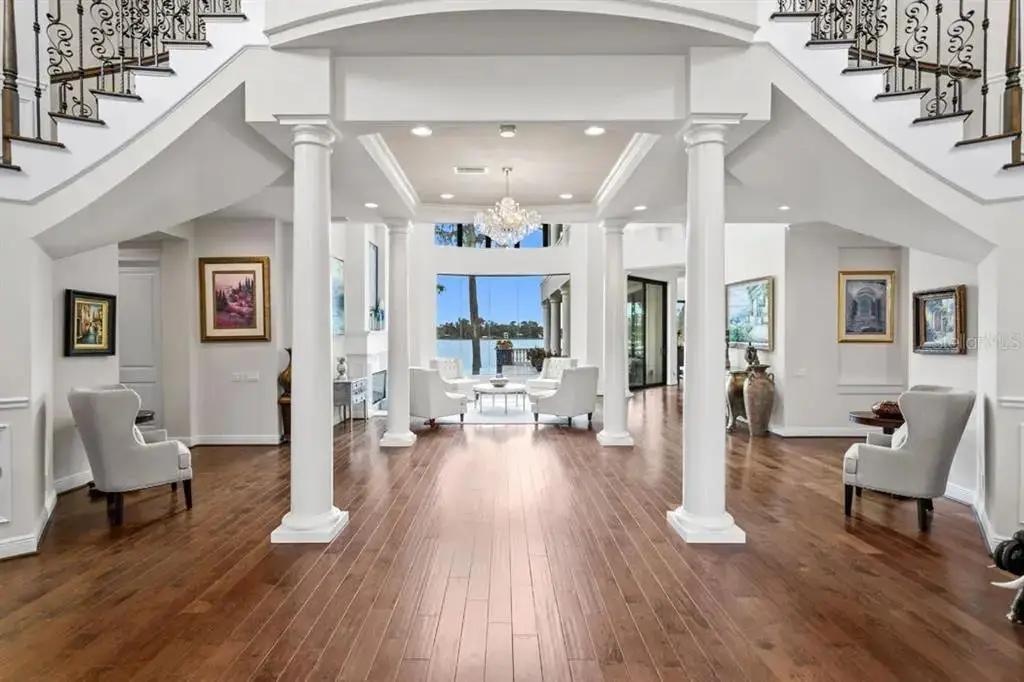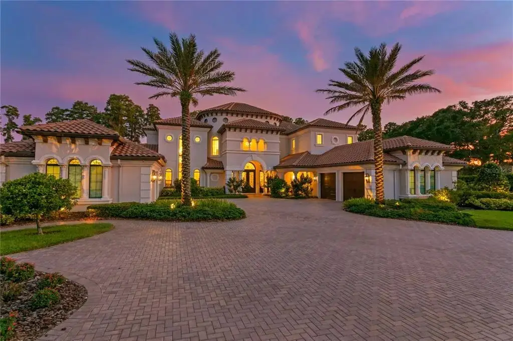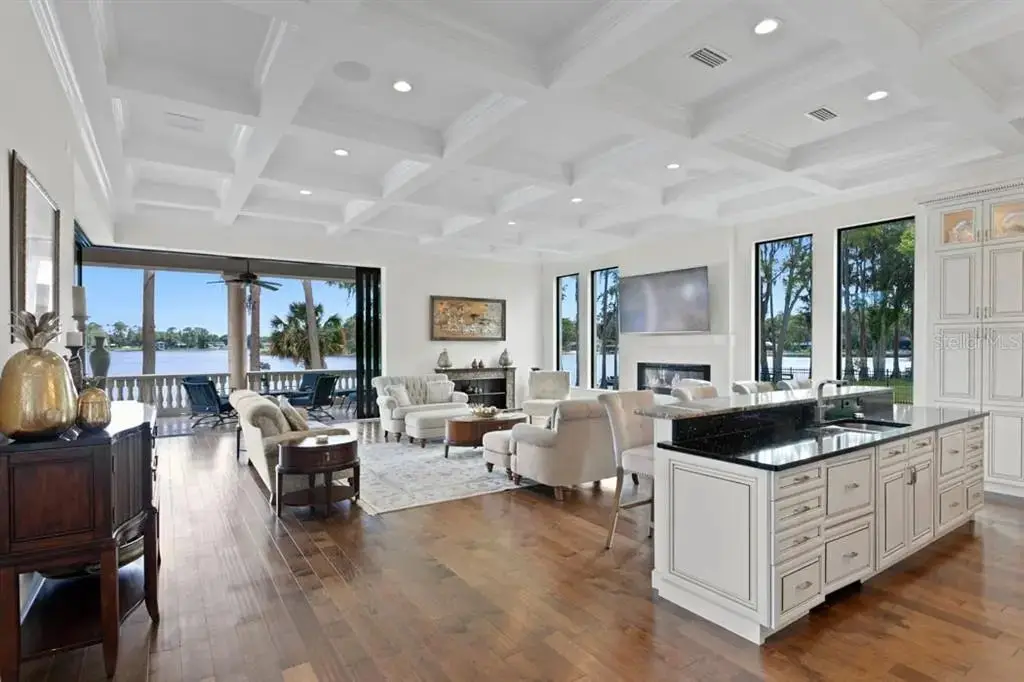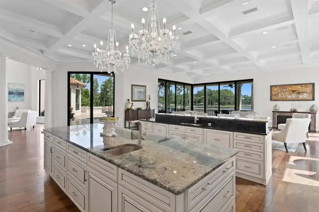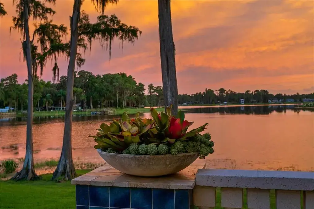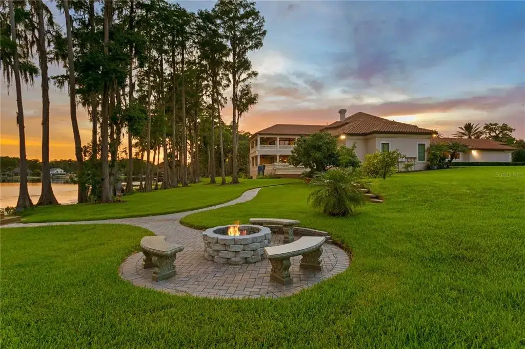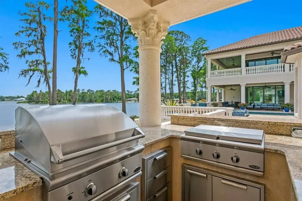 Gated lakefront estate offering space, privacy, and a stunning natural setting—17124 Crawley Road in Odessa is a rare opportunity to live expansively on nearly 6 acres along the tranquil shoreline of Rainbow Lake. With 300 feet of private lake frontage, this custom residence offers 10,545 square feet of living space. Built for both comfort and entertaining, the main house includes 5 bedrooms, 6 full baths, 2 half baths, entertainment space, gym, study, and 2 attached garages—one on each side of the home—designed for convenience and symmetry. Separate guest house features 1 bedroom and 1 full bath. The estate is finished with a pool, spa, and private dock—all with no HOA or CDD fees. Step through the grand double doors into a sweeping foyer with a dramatic double staircase. Straight ahead, the formal living room welcomes you with nearly 24-foot ceilings, gas fireplace, and open view to the pool and lake beyond. The spacious family room serves as a relaxed space with TV, electric fireplace, and sliding glass doors that lead seamlessly to the outdoor terrace. At the heart of the home, the kitchen is both stylish and functional—featuring a striking Cianitus granite island and Cambria Menai quartz on the perimeter, along with a gas range with 1.5 ovens, a separate wall oven, pot filler, microwave and refrigerator, and thoughtful storage. Nearby butler’s pantry with granite countertops and wine refrigerator connects the kitchen to the formal dining room, ideal for entertaining or daily living. Downstairs also includes a primary suite with a fireplace and sitting area, dual custom closets, and a spa-style bath with freestanding tub and oversized walk-in shower. 2 additional ensuite bedrooms are located on the main level. A dedicated study with soaring ceilings and separate gym complete the thoughtful main-level layout. Upstairs, 2 large suites offer the flexibility of dual primary bedrooms, each with its own full bath and walk-in closet. Just beyond, a large entertainment area includes a sunken game room, wet bar with refrigerator, and balcony with balustrades—perfect for entertaining or relaxing. Throughout the home, 8-foot doors, wood flooring, detailed crown and tray ceilings, and custom-finished walk-in closets in every bedroom enhance the design, while both upstairs and downstairs laundry rooms and electric vehicle charging station in the garage add everyday convenience. The separate guest cabana offers a refined yet relaxed extension of the home’s living space. Located just off the pool, it includes a built-in TV, crown and tray ceilings, and walk-in closet, along with full bath and bar with refrigerator. The grounds are the heart of this property. Designed by Ryan Hughes Design Build, the outdoor spaces are a blend of texture, scale, and serenity. Stacked stone retaining walls, lush gardens, fruit trees, and paver walkways surround a heated saltwater pool and spa, fire pit, covered terrace, full summer kitchen, and a separate outdoor full bath for added convenience. At the water’s edge, a private dock features electricity and nautical rope detailing, offering direct access to Rainbow Lake. Located in the heart of Odessa—where luxury homes, wide-open spaces, and natural beauty converge—this estate captures the essence of lakefront living with the convenience of being just minutes from Tampa, major roadways, and top-tier amenities. A rare opportunity to live expansively, privately, and beautifully.