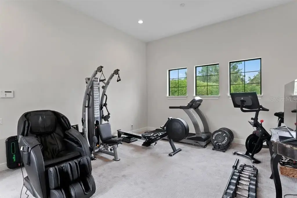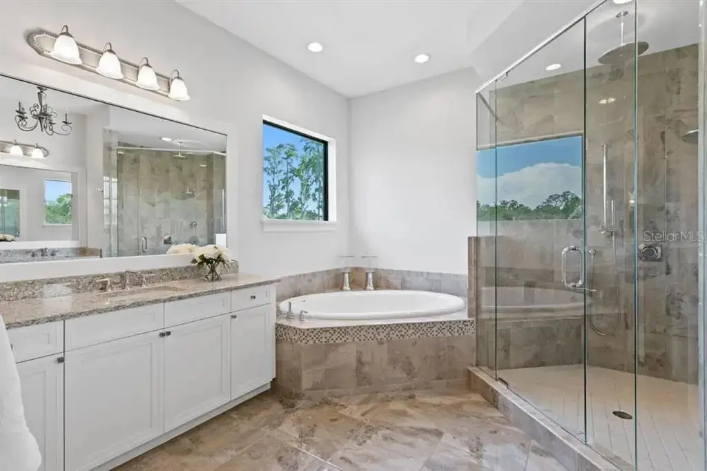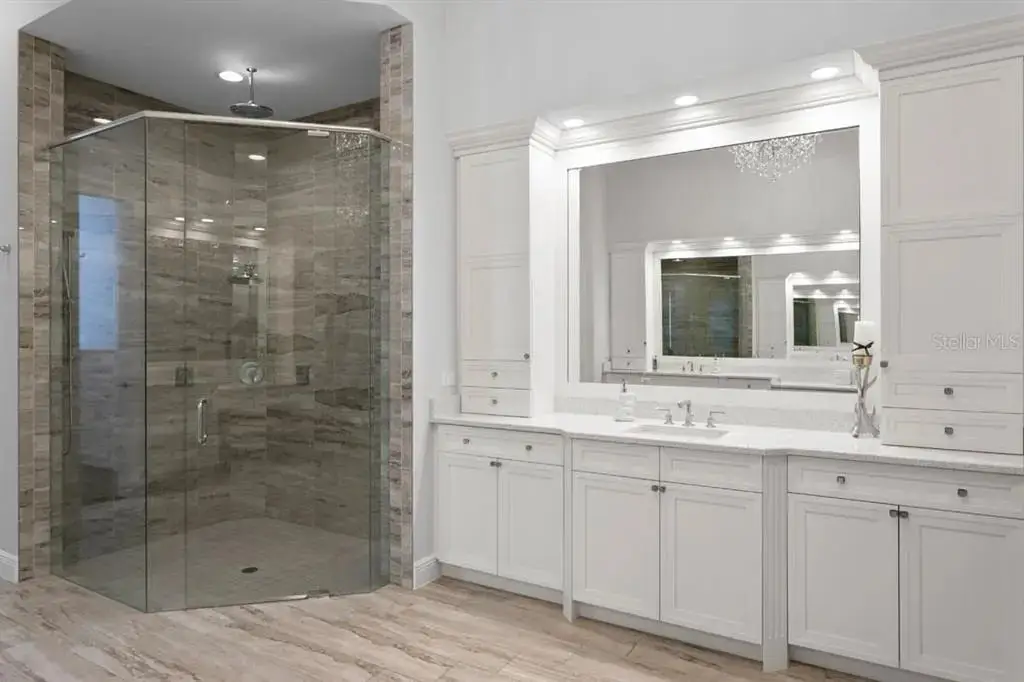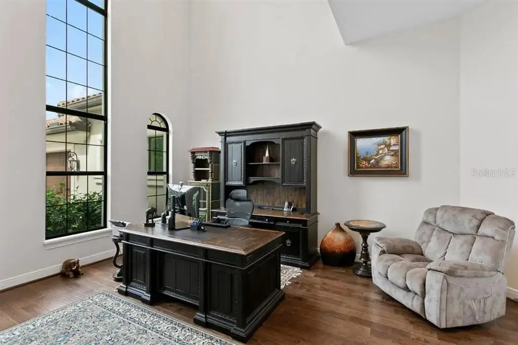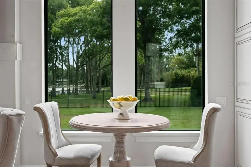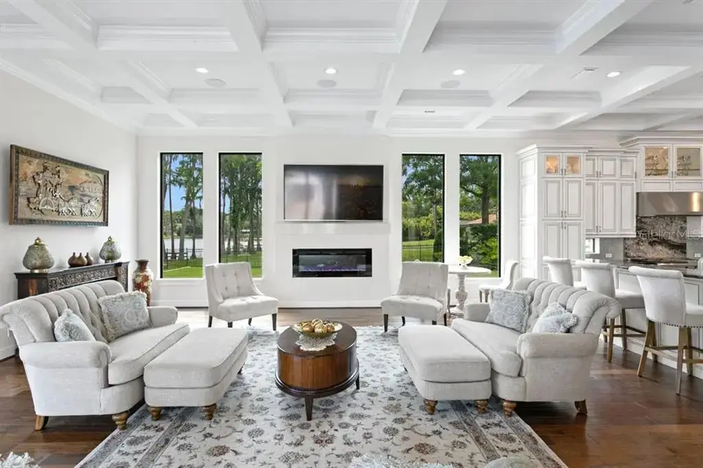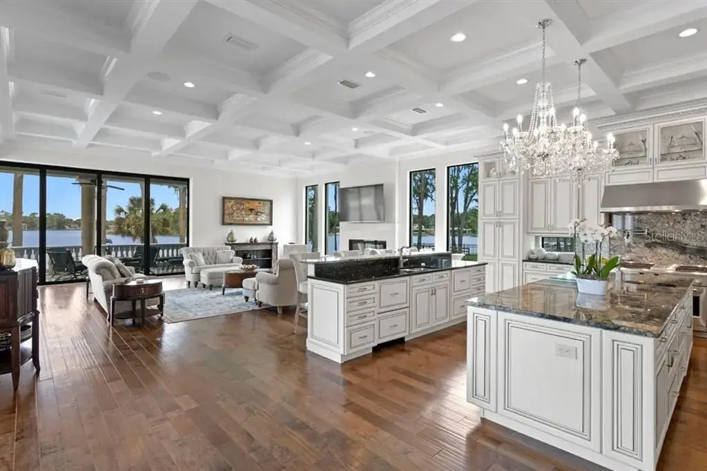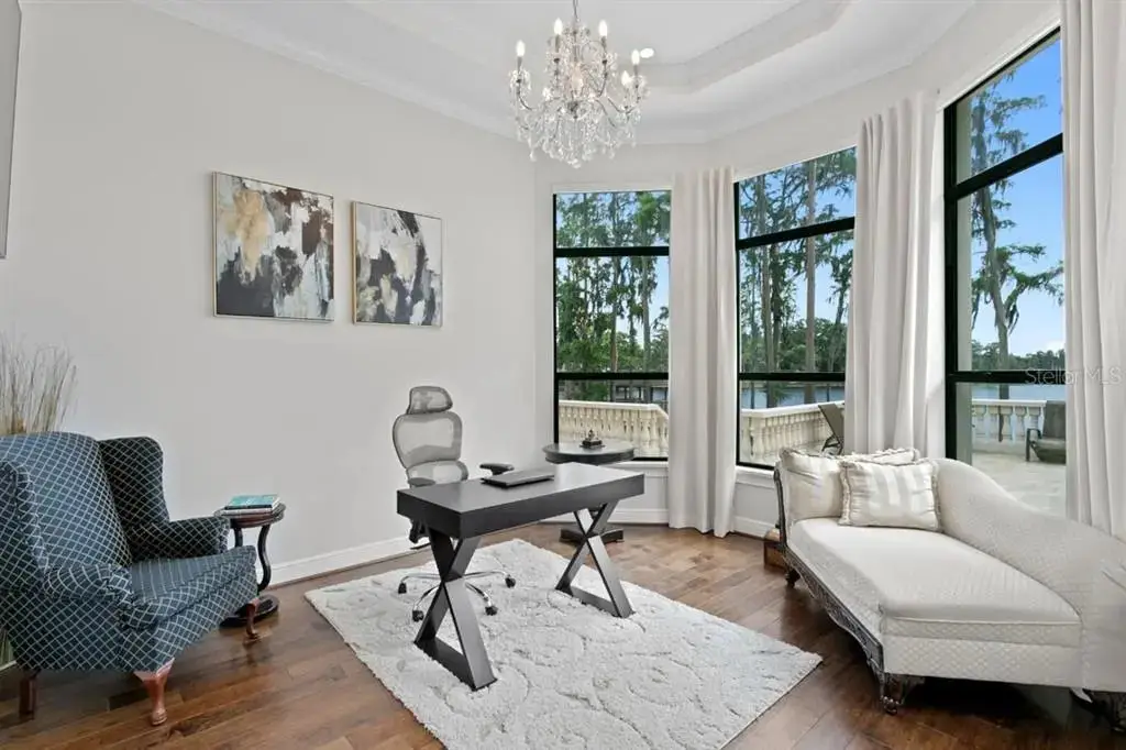 Gated lakefront estate offering space, privacy, and a stunning natural setting—17124 Crawley Road in Odessa is a rare opportunity to live expansively on nearly 6 acres along the tranquil shoreline of Rainbow Lake. With 300 feet of private lake frontage, this custom residence offers 10,545 square feet of living space. Built for both comfort and entertaining, the main house includes 5 bedrooms, 6 full baths, 2 half baths, entertainment space, gym, study, and 2 attached garages—one on each side of the home—designed for convenience and symmetry. Separate guest house features 1 bedroom and 1 full bath. The estate is finished with a pool, spa, and private dock—all with no HOA or CDD fees. Step through the grand double doors into a sweeping foyer with a dramatic double staircase. Straight ahead, the formal living room welcomes you with nearly 24-foot ceilings, gas fireplace, and open view to the pool and lake beyond. The spacious family room serves as a relaxed space with TV, electric fireplace, and sliding glass doors that lead seamlessly to the outdoor terrace. At the heart of the home, the kitchen is both stylish and functional—featuring a striking Cianitus granite island and Cambria Menai quartz on the perimeter, along with a gas range with 1.5 ovens, a separate wall oven, pot filler, microwave and refrigerator, and thoughtful storage. Nearby butler’s pantry with granite countertops and wine refrigerator connects the kitchen to the formal dining room, ideal for entertaining or daily living. Downstairs also includes a primary suite with a fireplace and sitting area, dual custom closets, and a spa-style bath with freestanding tub and oversized walk-in shower. 2 additional ensuite bedrooms are located on the main level. A dedicated study with soaring ceilings and separate gym complete the thoughtful main-level layout. Upstairs, 2 large suites offer the flexibility of dual primary bedrooms, each with its own full bath and walk-in closet. Just beyond, a large entertainment area includes a sunken game room, wet bar with refrigerator, and balcony with balustrades—perfect for entertaining or relaxing. Throughout the home, 8-foot doors, wood flooring, detailed crown and tray ceilings, and custom-finished walk-in closets in every bedroom enhance the design, while both upstairs and downstairs laundry rooms and electric vehicle charging station in the garage add everyday convenience. The separate guest cabana offers a refined yet relaxed extension of the home’s living space. Located just off the pool, it includes a built-in TV, crown and tray ceilings, and walk-in closet, along with full bath and bar with refrigerator. The grounds are the heart of this property. Designed by Ryan Hughes Design Build, the outdoor spaces are a blend of texture, scale, and serenity. Stacked stone retaining walls, lush gardens, fruit trees, and paver walkways surround a heated saltwater pool and spa, fire pit, covered terrace, full summer kitchen, and a separate outdoor full bath for added convenience. At the water’s edge, a private dock features electricity and nautical rope detailing, offering direct access to Rainbow Lake. Located in the heart of Odessa—where luxury homes, wide-open spaces, and natural beauty converge—this estate captures the essence of lakefront living with the convenience of being just minutes from Tampa, major roadways, and top-tier amenities. A rare opportunity to live expansively, privately, and beautifully.