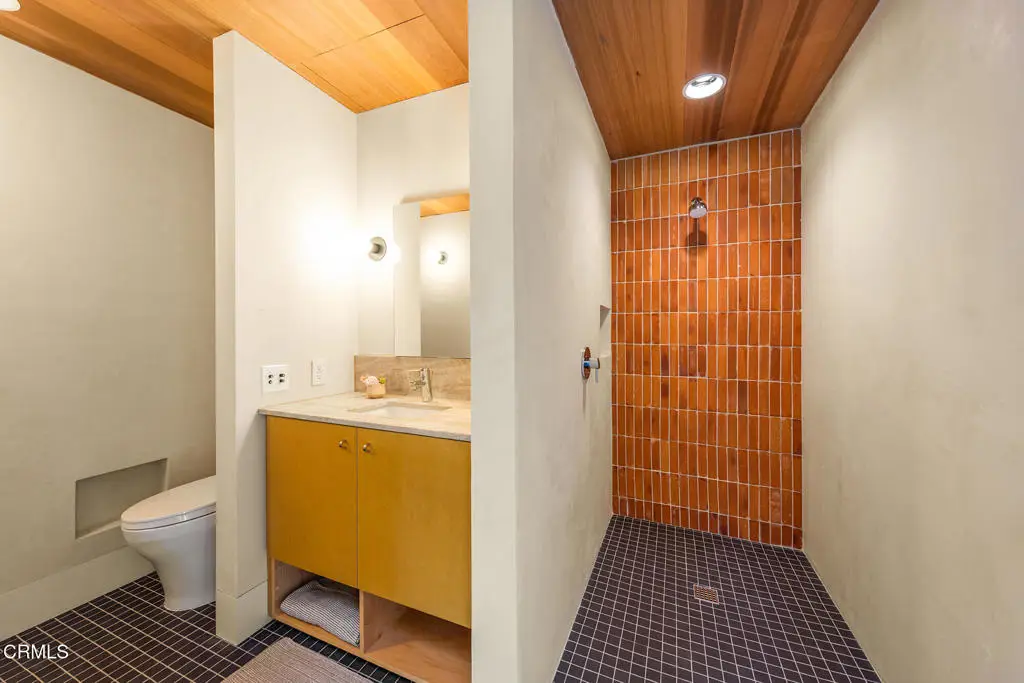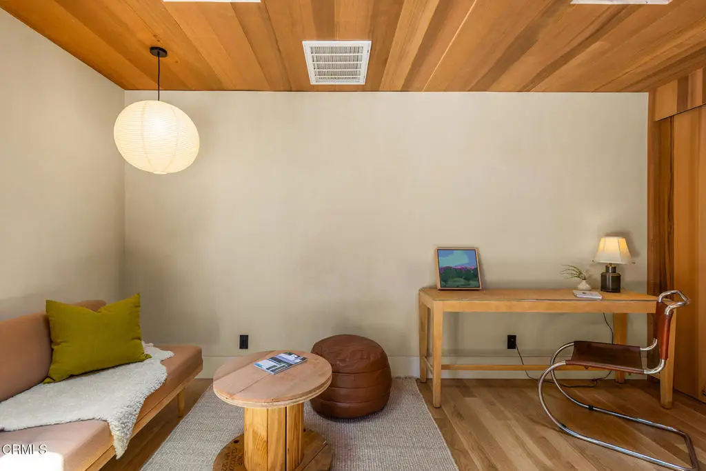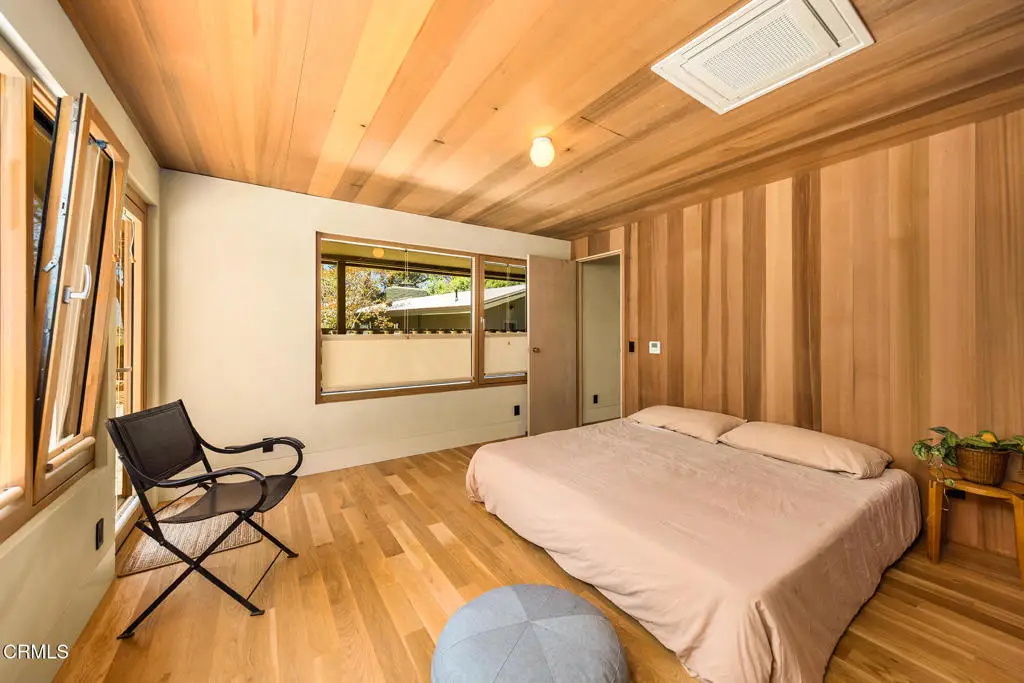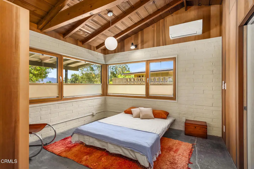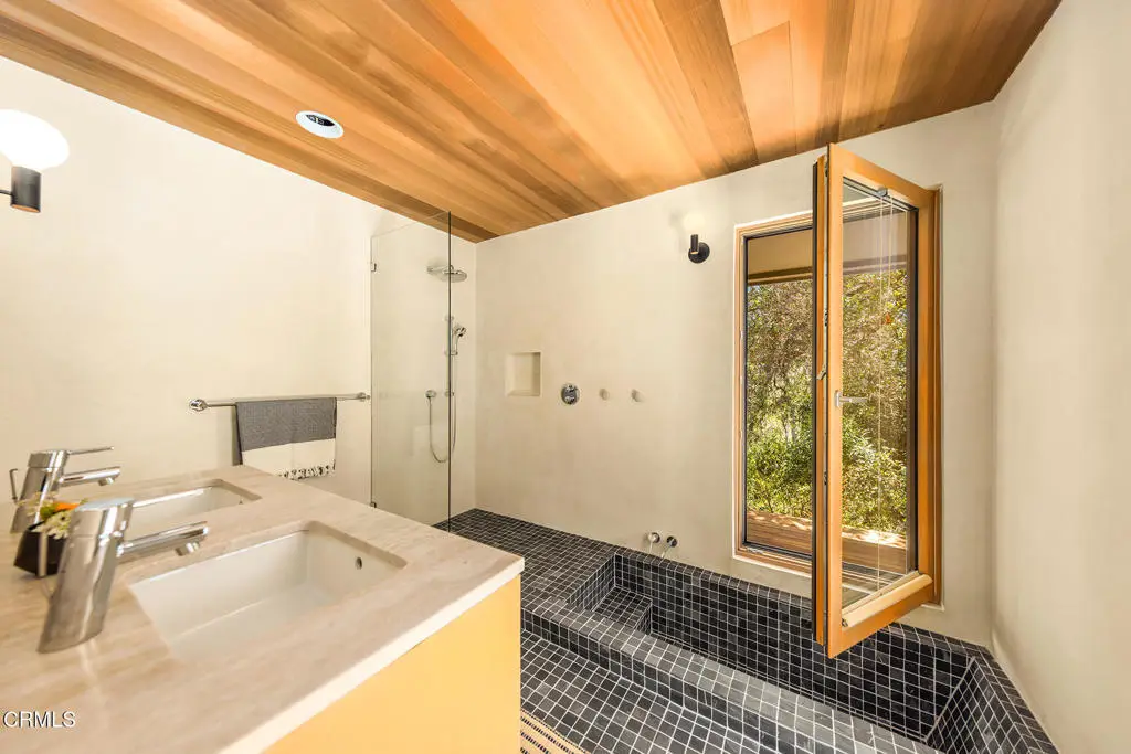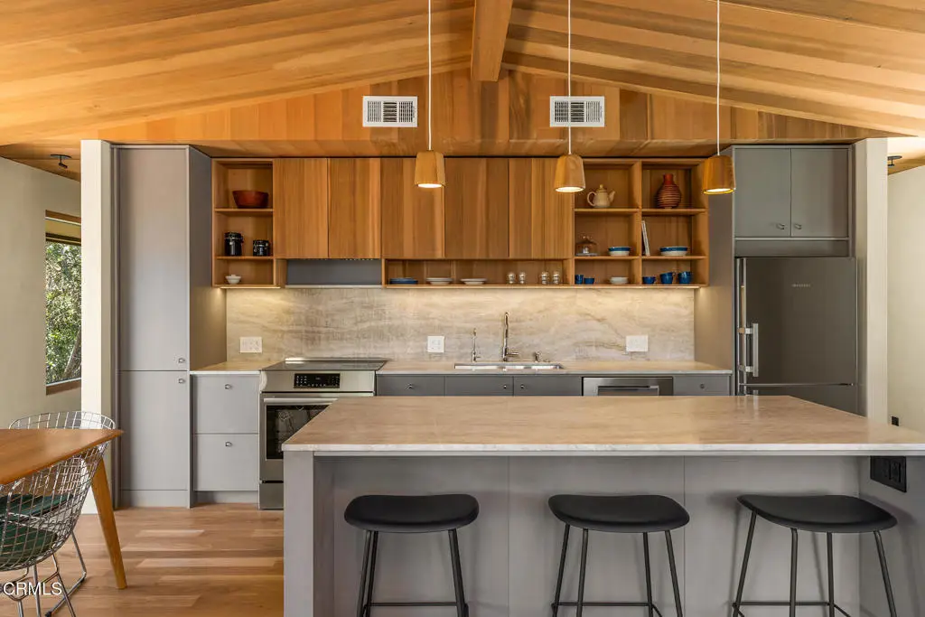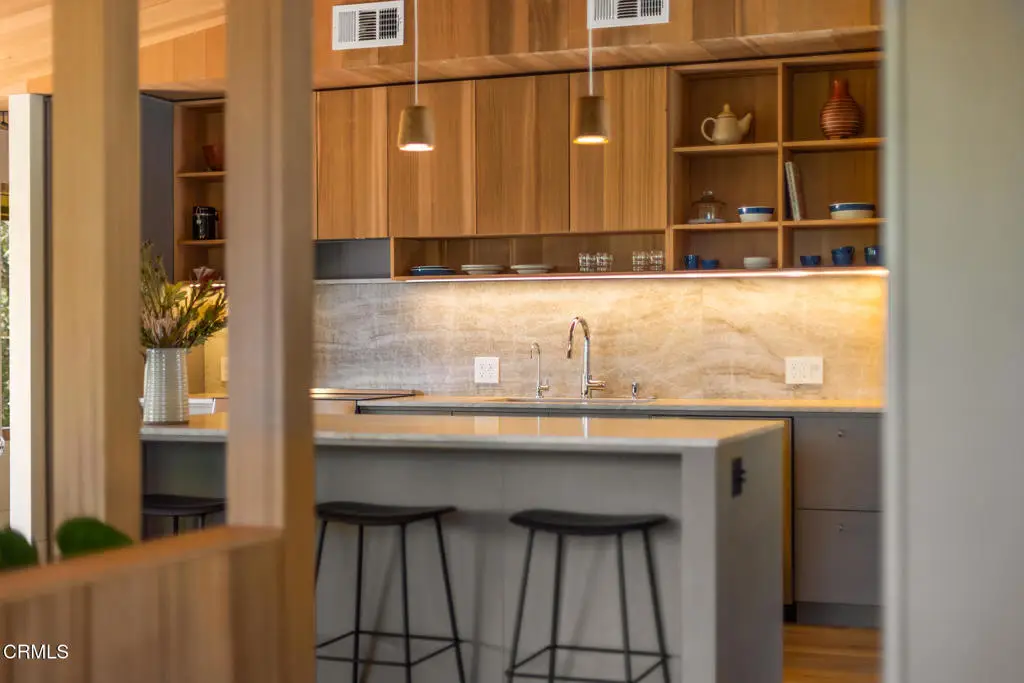This extraordinary 2.5-acre estate is one of Ojai's most rare and refined offerings, located in a stunning ridge-top setting within the heart of the valley. Just minutes from downtown, the Ojai Valley Inn, and Villanova School, this private hilltop retreat offers panoramic 360-degree views, unmatched privacy, and a masterfully curated renovation that blends natural beauty with elevated living. Completed in 2025, every inch of the property has been meticulously renovated inside and out, combining timeless materials with modern craftsmanship. The main residence spans 1,450 square feet and is a stunning 3-bedroom, 2.5-bath. Thoughtful details are everywhere, from the solid oak floors and cedar-lined walls and ceilings, to handcrafted porcelain towel hooks, push-button light switches, and imported European tile at the entry. The chef's kitchen features honed Brazilian quartzite countertops, all-new appliances, and tilt-and-turn windows that open to a teak wraparound deck framing iconic views of the Topa Topa mountains. Bathrooms are finished with radiant heated floors, hand-selected tile work, and custom lighting. The home also includes brand-new HVAC, plumbing, electrical, and a fire-resistant metal roof. Just beyond the main house, the 623-square-foot guest house offers a studio-style layout with cedar interiors, polished concrete floors, a full kitchen, bath, and fireplace, ideal for guests, extended stays, or creative space. The third structure, a 599-square-foot finished two-car garage, continues the design language with polished concrete floors, cedar finishes, a half bath and outdoor shower, perfect as a gym, workspace, or overflow guest suite. The land itself is a sanctuary, dotted with mature trees, sculpted landscaping, and private walking paths that weave through the property. Perched high above the valley, the ridge-line setting catches a gentle, year-round breeze, creating a perfect microclimate. A private well services the entire 2.5 acres, supplying water for all landscaping needs, while a state-of-the-art water filtration system supports all three structures. This is more than a home, it's a private, architectural retreat designed for those who appreciate privacy, beauty, and an effortless connection to nature. A property like this comes along once in a generation, a true Ojai original.