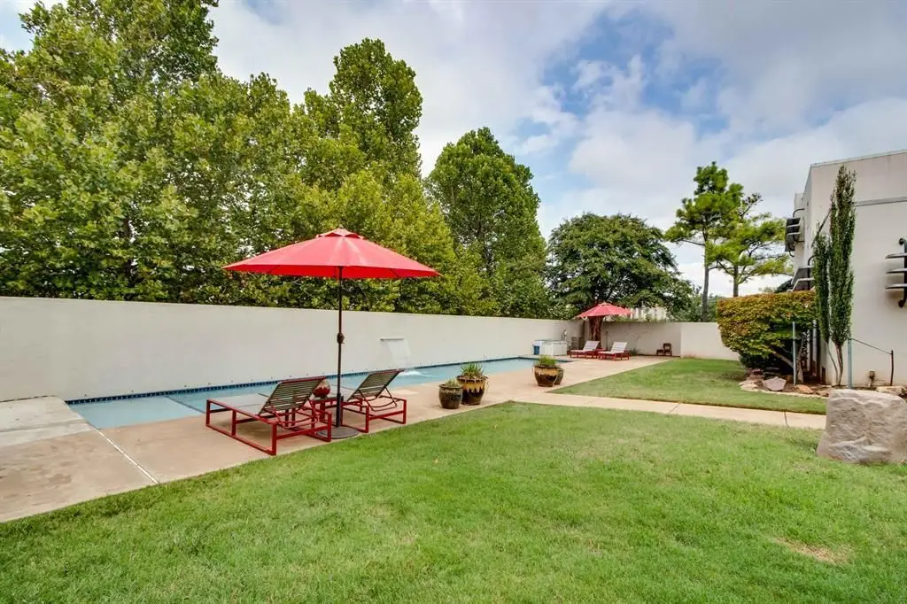 - Lush landscaping, outdoor fireplace, and lap pool in backyard