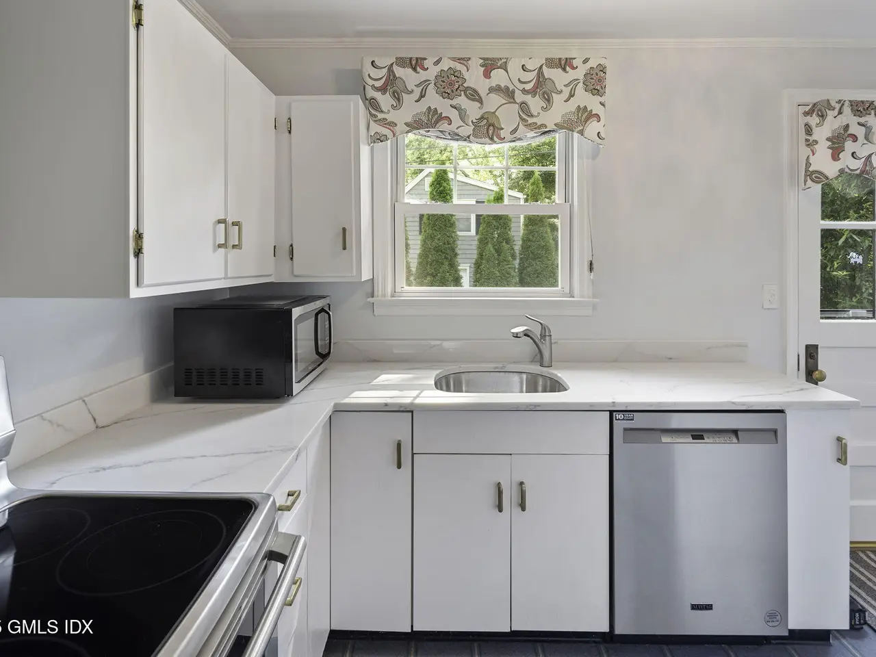 This charming Old Greenwich home in the highly sought-after North Mianus/ Eastern school district is the perfect starter or the best condo alternative. A picturesque setting, this single-family dwelling comes with low property taxes, low maintenance responsibilities and costs. The first floor offers comfortable living and family room spaces, a newer kitchen with quartz countertop and stainless steel appliances, along with 1 bedroom and a new hall bath. The 2nd floor consists of 2 bedrooms (one with spacious cedar closet) and another newer full bath. The private backyard with a bluestone patio provides a serene outdoor environment, surrounded by mature trees and plantings. Many updates throughout the house; all public utilities; home is in R-7 zoning and can be expanded. The location is wonderful as it is quiet and convenient to all that Greenwich has to offer.