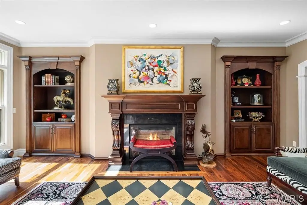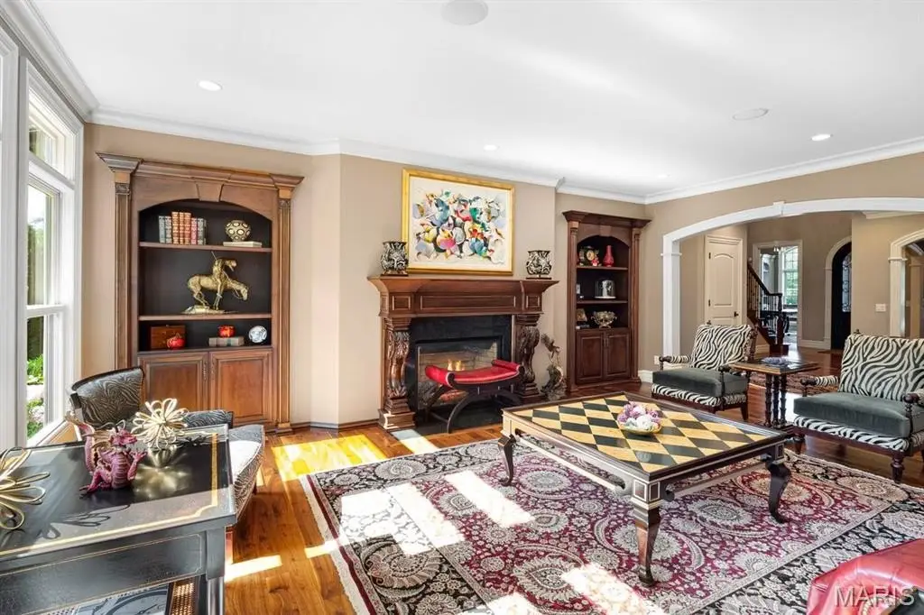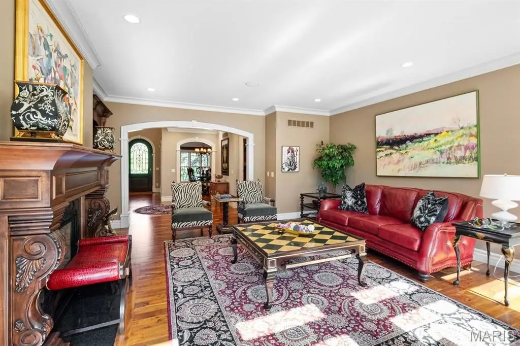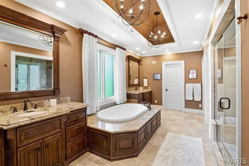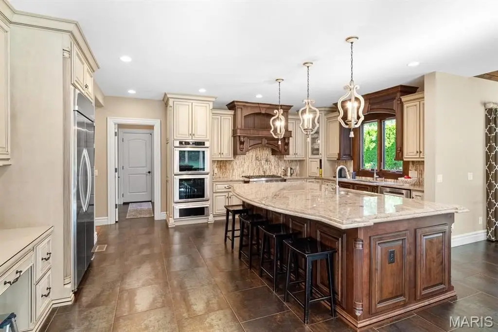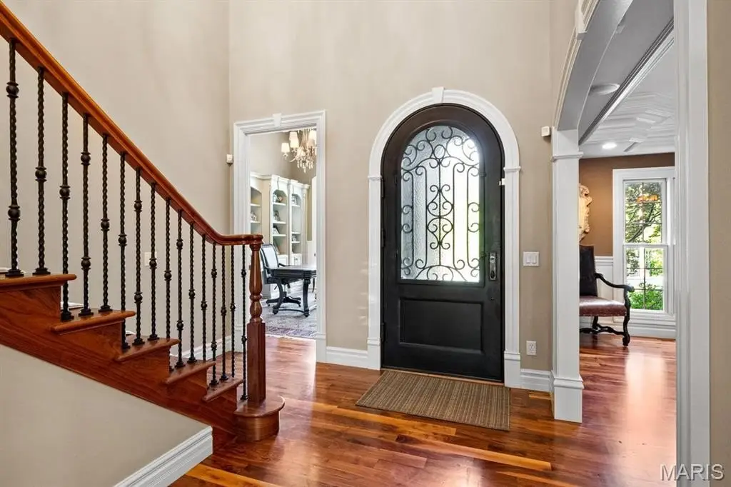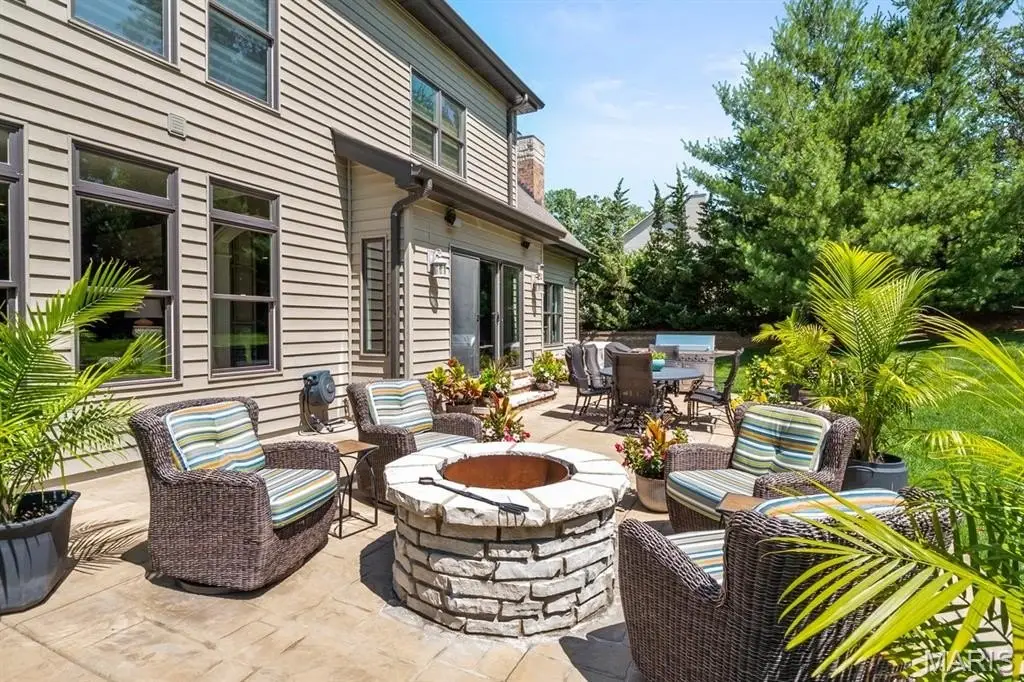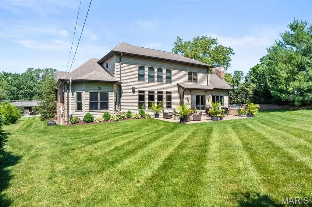 Price Improved. This spectacular custom built 13 year old home is situated on a lushly landscaped .5 acre lot on a private lane close to Old Bonhomme Elementary and Stacy Park. This home has all the right spaces to live & entertain effortlessly. The home is filled with custom touches like in-ceiling speakers, crown molding, wainscoting & high end flooring throughout.The gourmet eat-in kitchen has top of the line appliances & a huge center island that includes seating, a sink & plenty of storage. Off the kitchen, you will find a mudroom with built-in cubbies, door to the oversized 3 car garage & separate laundry room. The main floor master suite is grand & includes a gorgeous granite-clad bathroom with his & her vanities, air jetted whirlpool tub, two custom closets & a large walk-in shower w/ dual shower heads. Upstairs you will find a big bonus room complete w/ gas fireplace, built-in bookcases & speakers. There are 3 additional bedrooms, one of which is en-suite while the other two share a jack-n-jill bathroom. Plus there is an upstairs laundry closet that fits a full-size stackable washer/dryer. The finished lower level includes a walk behind bar, HUGE flex space for entertaining, a possible 5th bedroom, a full bathroom and great storage. The lot is private and features a large patio with built in firepit, sprinkler system and outdoor speakers. A home for all ages and stages.