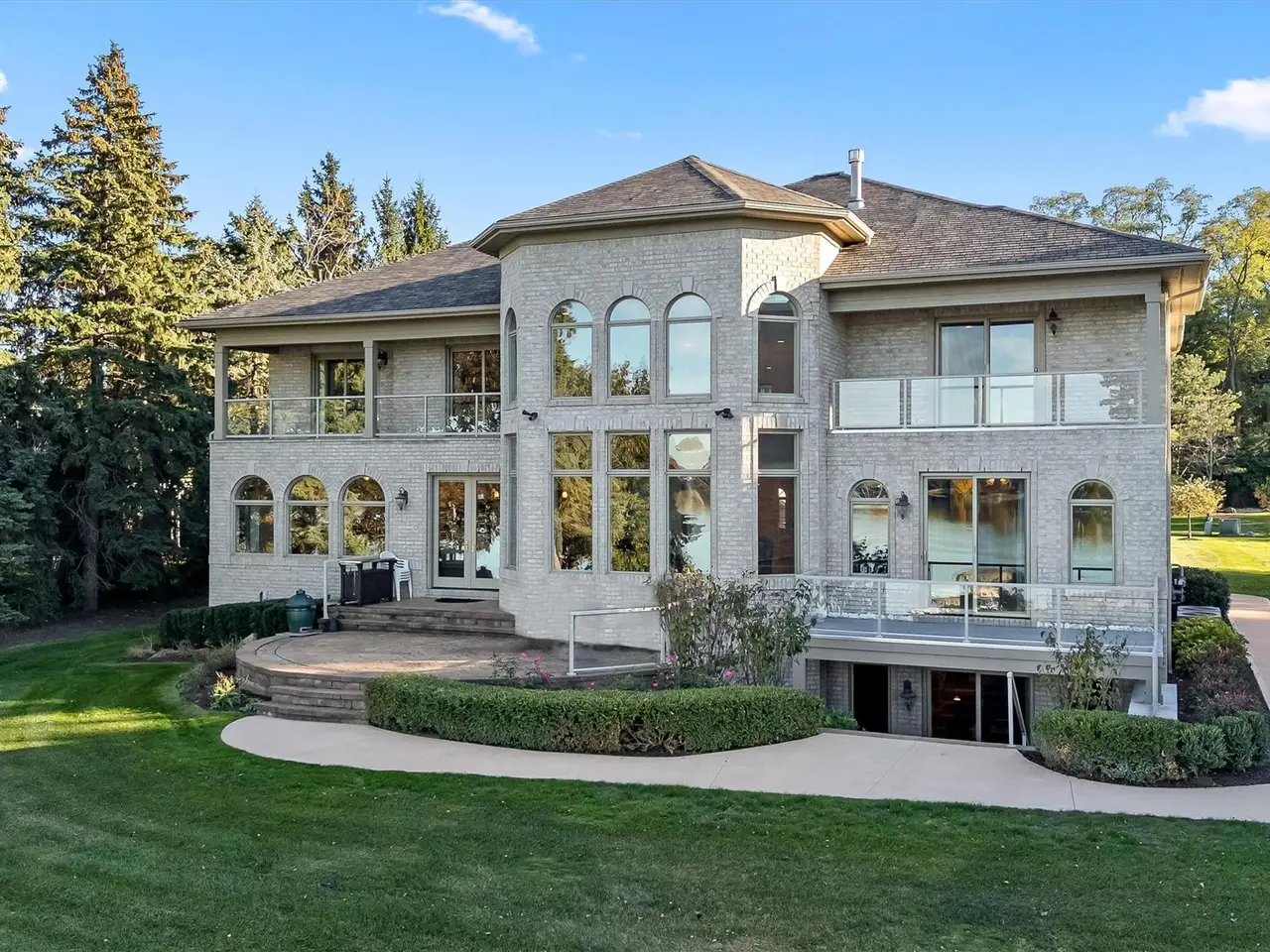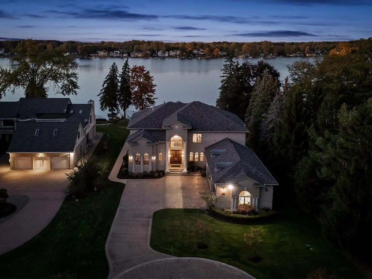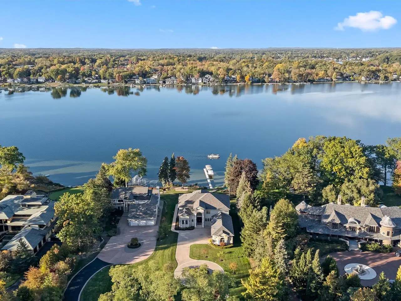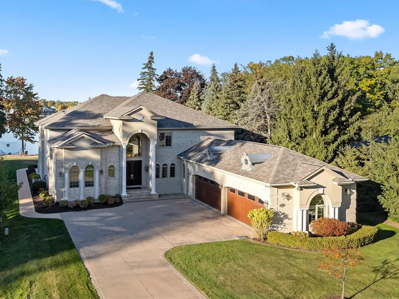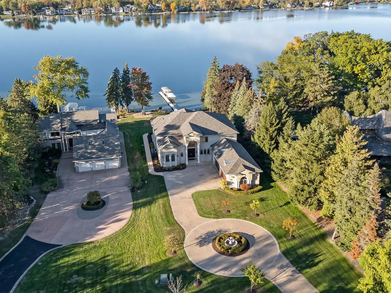 Situated on Dow Ridge Road, one of the most prestigious streets in Oakland County, and certainly the epitome of Cass Lake living. Perched above the shoreline on just over three quarters of an acre lot. 108' of crystal clear, sandy shoreline. Newer built in 2012. Long double-wide driveway, with circular fountain area, provides ample parking for large gatherings. Grand two-story foyer and great room. The great room offers floor-to-ceiling windows with magnificent unobstructed views of the lake. Library/office with custom built-ins. Bright, white gourmet granite kitchen, oversized island with countertop seating, and premium stainless steel appliances: SubZero refrigerator and freezer, Wolf gas range, KitchenAid dishwasher. Walk-in pantry. Full back hall bath, great when coming off a day on the lake. Desirable first-floor primary suite, doorwall to deck, dual walk-in closets. Curved hardwood and wrought iron staircase. Three en-suites upstairs all facing the lake with their own balconies, granite baths and walk-in closets. The second floor loft/office area could easily be enclosed to create an additional bedroom. Lower-level walk-up, second full kitchen, exercise area, 5th en-suite. Lower level kitchen has two side-by-side six burner gas ranges. Dual staircases, solid core doors, palladium windows, Generator, new roof 2025, interior freshly painted 2025. New tile balcony with a glass railing. Unable to duplicate lot and home for this price. Room for a pool in the backyard. Large brick-paver lakefront patio. Four car garage. West Bloomfield Schools: Gretchko Elementary, new West Bloomfield Middle & West Bloomfield High. Experience lakefront living at its finest!