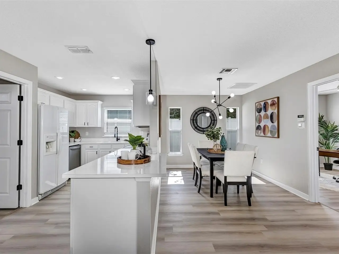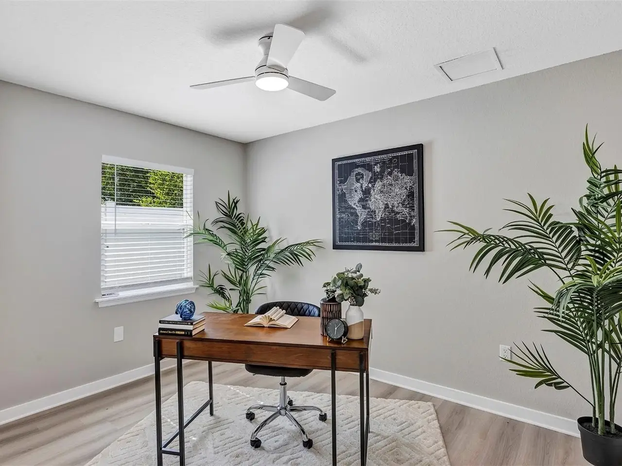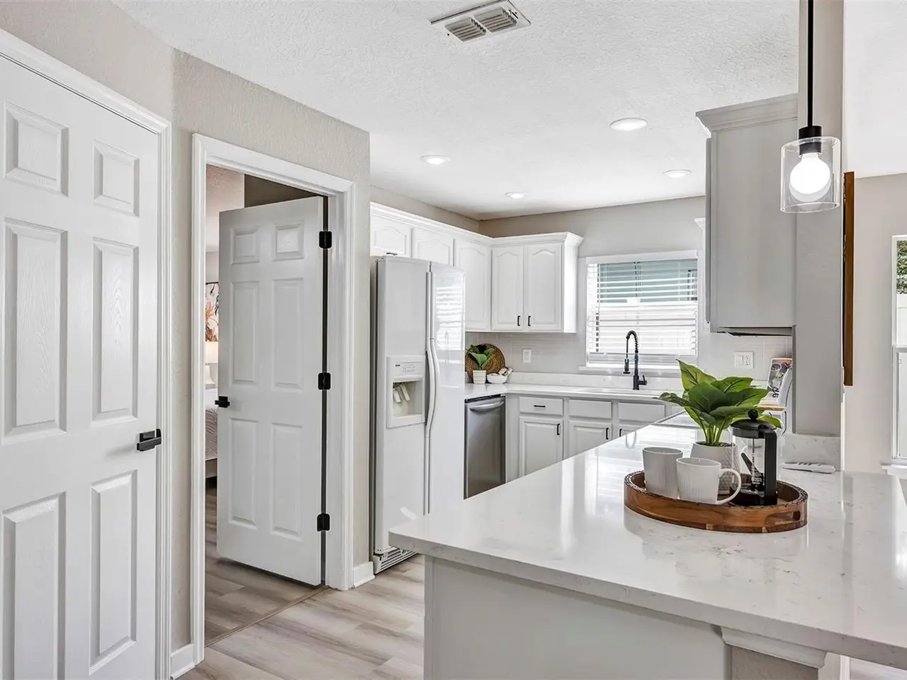 Welcome to this beautifully updated 4-bedroom, 2.5-bathroom single-family home, From the moment you walk in, you'll notice the luxury vinyl plank flooring flows seamlessly throughout, offering durability and elegance in every room. The open-concept living area is filled with natural light, enhanced by new ceiling fans and designer light fixtures that bring warmth and style to every gathering. At the heart of the home is the recently upgraded kitchen, featuring sparkling white Carrara quartz countertops and a sleek 4 inch tall backsplash. Need a quiet place to work from home? You’ll love the dedicated home office, thoughtfully designed for focus and productivity. When it's time to unwind, retreat to your private back patio, ideal for morning coffee or sunset dinners while providing great shade from the Florida heat. All bathrooms have been completely renovated with custom tile flooring and contemporary touches. With the split bedroom floorplan, you will find the primary bedroom on the main floor and on the second floor you are greeted by yet another living room space and the remaining 3 bedrooms. There’s plenty of room for your growing family, guests, or creative hobbies. And thanks to thoughtful upgrades throughout, you can move right in without lifting a finger. Rest easy knowing that the roof was just replaced in 2023 (with a transferable warranty) and HVAC was replaced in 2024. Minutes from top-rated schools, parks, shopping, and easy access to I-4, this home offers both convenience and connection to a vibrant community. Visit College Park's most beloved breakfast spot: Shaker's American Cafe; a staple in the community since 1993 that is less than a block away! or take a 3 minute walk in the opposite direction and visit the Jack Kerouac House: a haven for literary enthusiasts. There truly is something for everyone! Don’t miss the opportunity to make this Orlando gem yours.