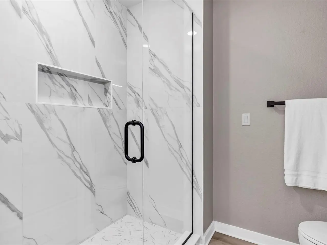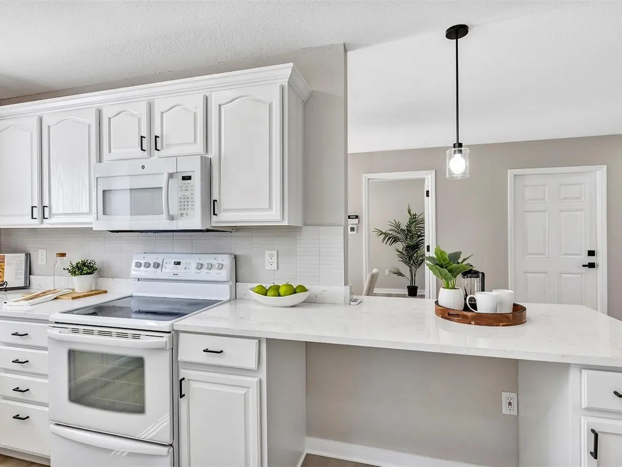 Carrara quartz countertops with tall backsplash