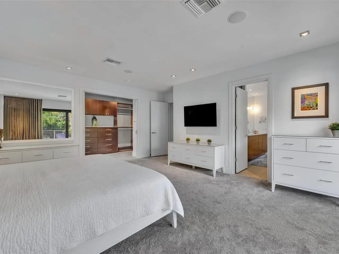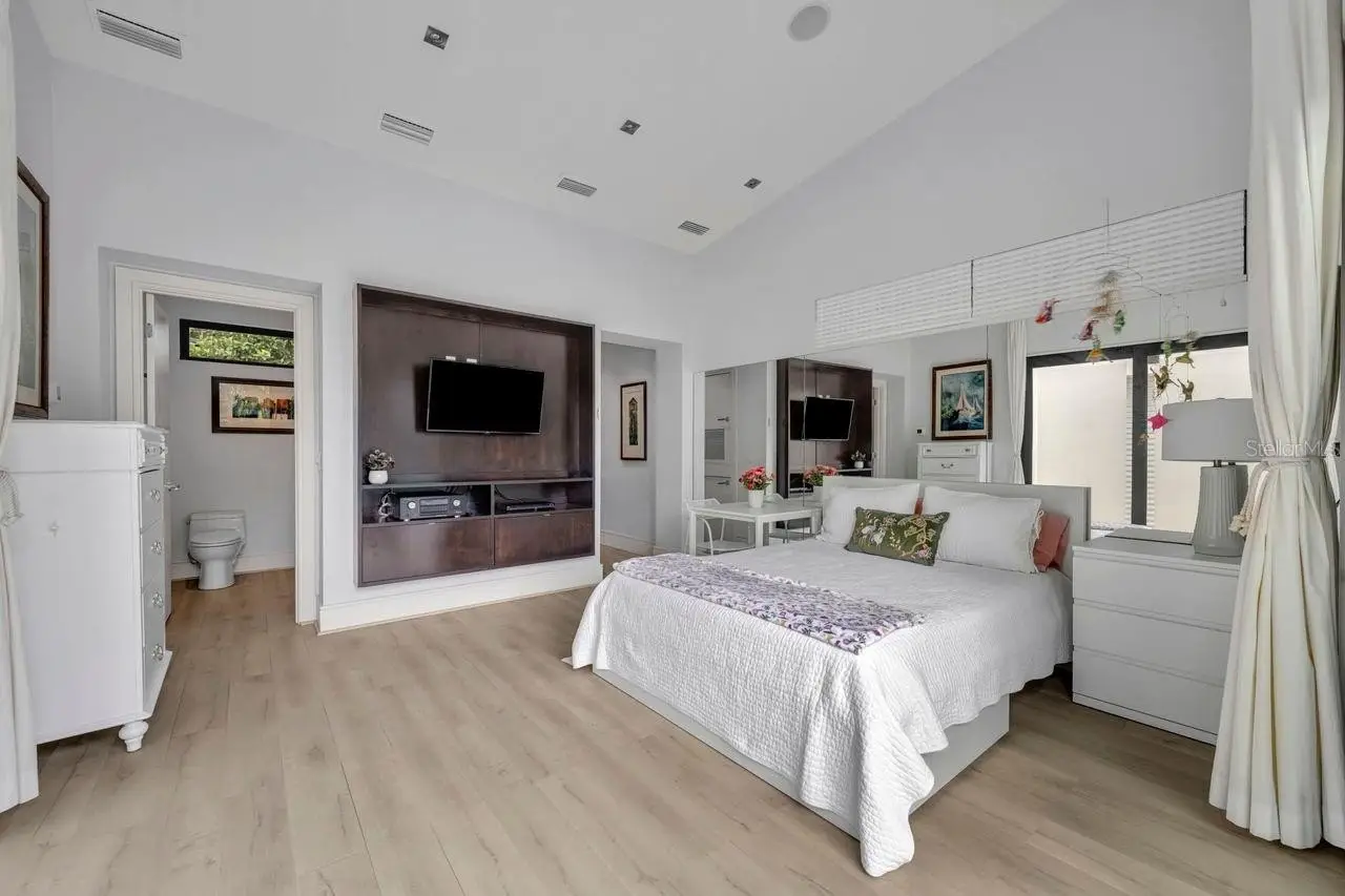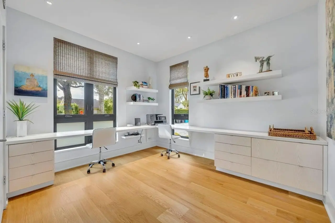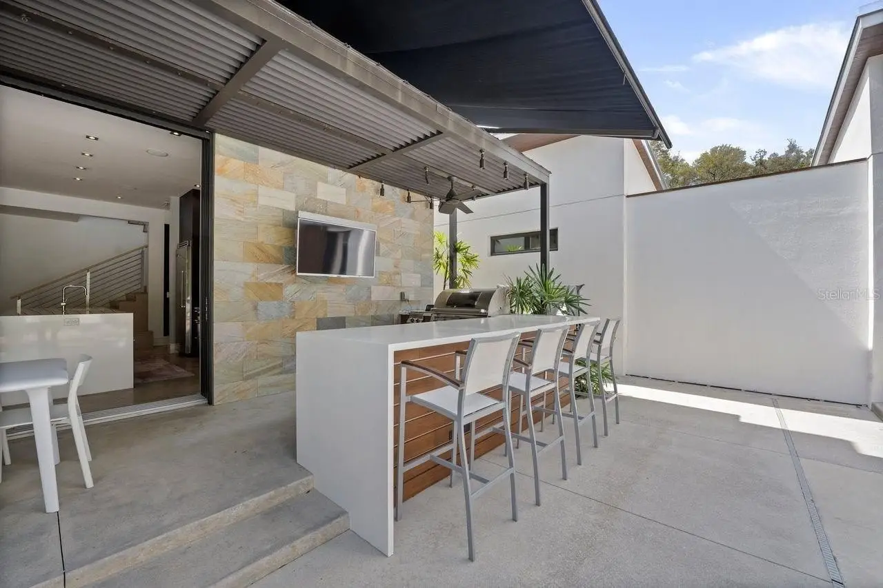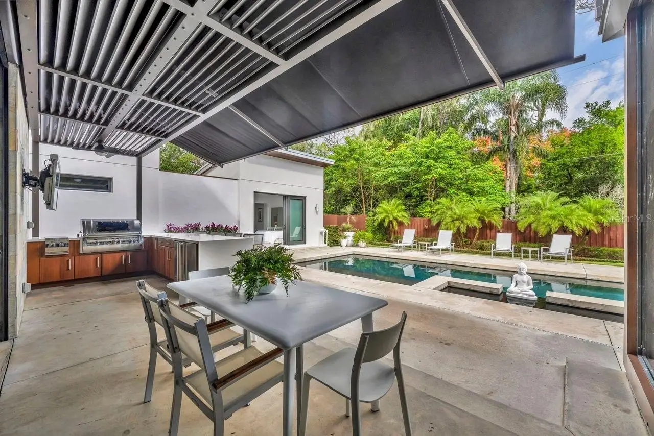 This contemporary four-bedroom, three-and-a-half-bath home with a detached 384 SF cabana in desirable Beverly Shores/Rose Isle showcases designer-inspired finishes and a resort-style pool retreat. Custom-built with a modern aesthetic and open floor plan, it features a gourmet kitchen with an island, breakfast bar, stainless steel appliances including a Viking refrigerator and separate freezer, espresso cabinetry, and Caesarstone countertops. The open dining area flows seamlessly into the spacious great room, highlighted by polished concrete floors, a custom-built media center, a wine room, bedroom with en-suite bath, and aan office with wrap around desk. Twelve-foot retractable sliding glass doors fill the main living area with natural light and open to spectacular views of the heated saltwater pool and spa. Upstairs, the primary suite offers a serene retreat with a custom-designed walk-in closet, Caesarstone dual vanities, soaking tub, separate shower, and a private balcony overlooking the pool and Mead Gardens. Two additional bedrooms share a Jack-and-Jill bath, while another flexible space serves perfectly as a media room, gym, or nursery. A secondary washer and dryer upstairs add convenience. The outdoor living area is an entertainer’s dream, complete with a summer kitchen, bar area, gas grill, and retractable awning. Guests will love the detached guest house with its private entrance and pool views. The garage provides flexibility, accommodating either two or four cars. Ideally located near both Orlando and Winter Park, and just steps from scenic Mead Gardens, this home offers luxury living at its finest—a perfect blend of modern design, functionality, and resort-style comfort.