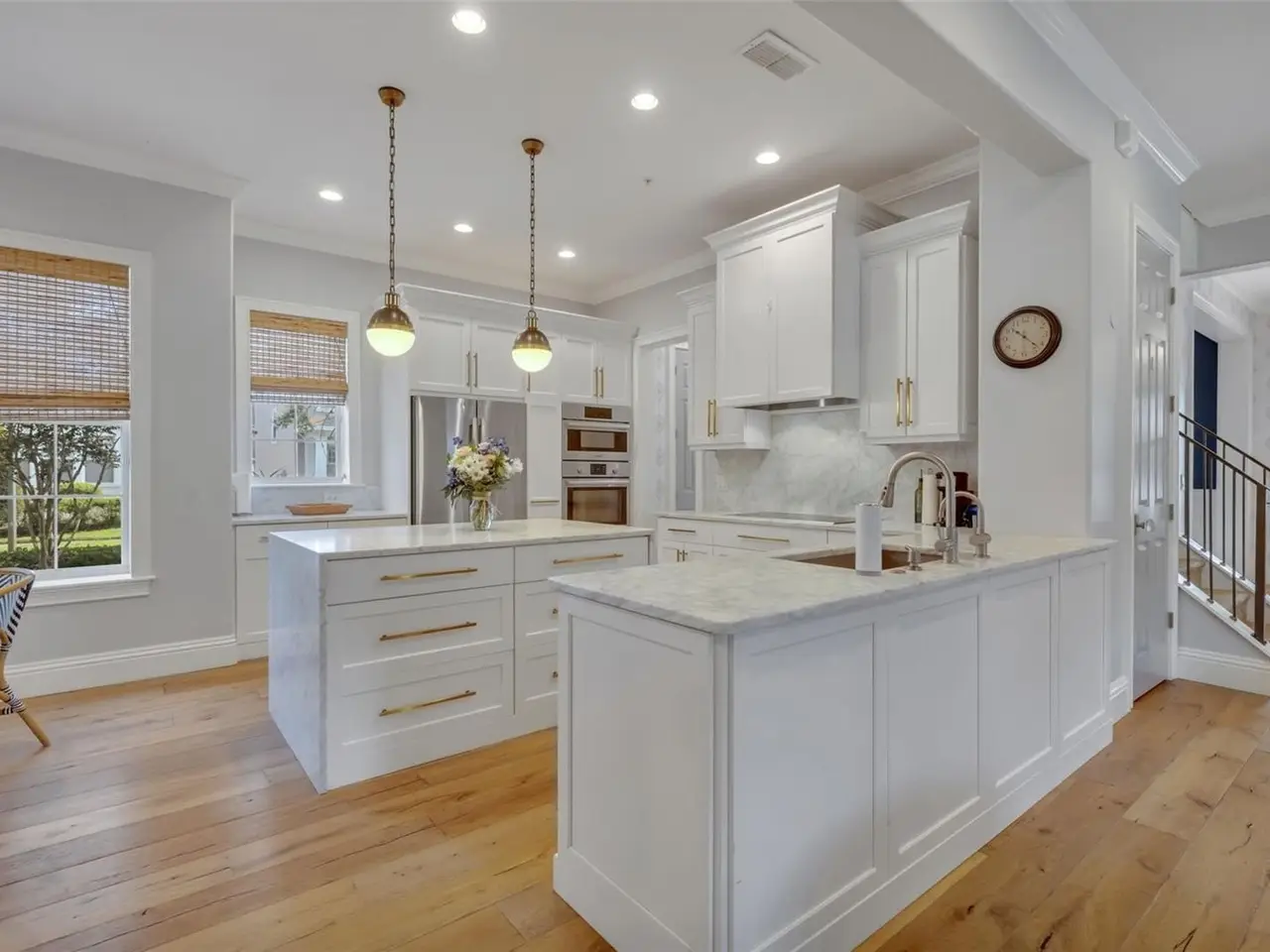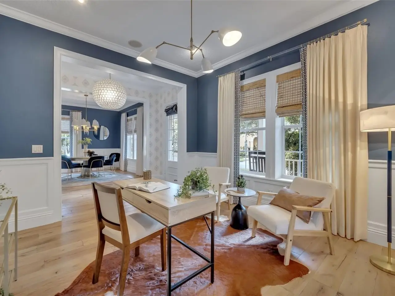 Under contract-accepting backup offers. Come see this stunning 5-bedroom, 4.5-bath, 3,811 sq ft home with a luxurious garage apartment, ideally situated on a prime corner lot in the heart of Baldwin Park. Inspired by the iconic style of Jonathan Adler, this home blends timeless sophistication with bold designer flair. Elegant details abound, including custom moldings, 8-inch wide French oak flooring, wainscoting in the office and dining room, and striking fixtures throughout. The light-filled great room features custom wall paneling, offering a refined yet welcoming space for relaxing or entertaining. The fully remodeled kitchen is a chef’s dream, boasting premium Bosch stainless steel appliances, custom marble countertops, and a show-stopping marble waterfall island with ample storage. Just off the kitchen, you’ll find a spacious walk-in pantry, a built-in office nook, and a custom banquette with hidden storage in the cozy eat-in area. The first-floor primary suite is a tranquil retreat, showcasing a beamed ceiling with tongue-and-groove paneling, crown molding, and French doors that open to a private side porch. The en suite bath feels like a spa, with marble floors and shower walls, a freestanding soaking tub, and a custom quartz-topped vanity. The second floor features two generously sized bedrooms connected by a shared Jack-and-Jill bathroom, an additional bedroom conveniently located next to a full hall bath, and a spacious, light-filled loft—perfect for use as a playroom, media room, or home office. Upstairs flooring has been recently upgraded with stylish laminate throughout, and all upstairs interior walls have been freshly repainted for a crisp, move-in-ready feel. Completing this exceptional property is a beautifully appointed garage apartment—ideal as a guest suite, home office, or rental opportunity—adding flexibility and value to an already incredible home. This is Baldwin Park living at its finest: elegant, functional, and effortlessly stylish. HVAC: 2021. Roof: 2021. New laminate floors and paint in the upstairs area of the main home.