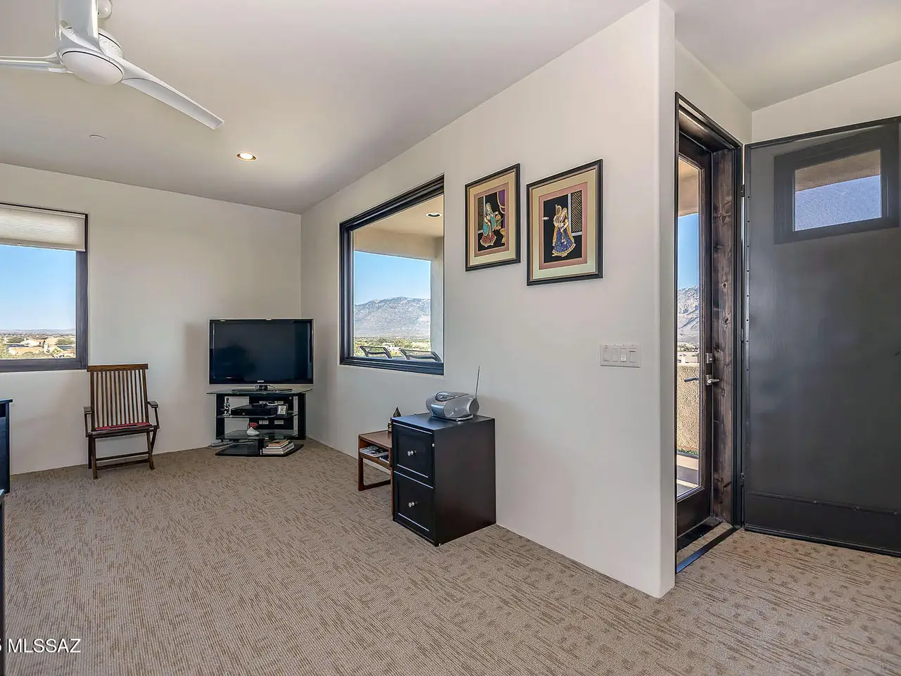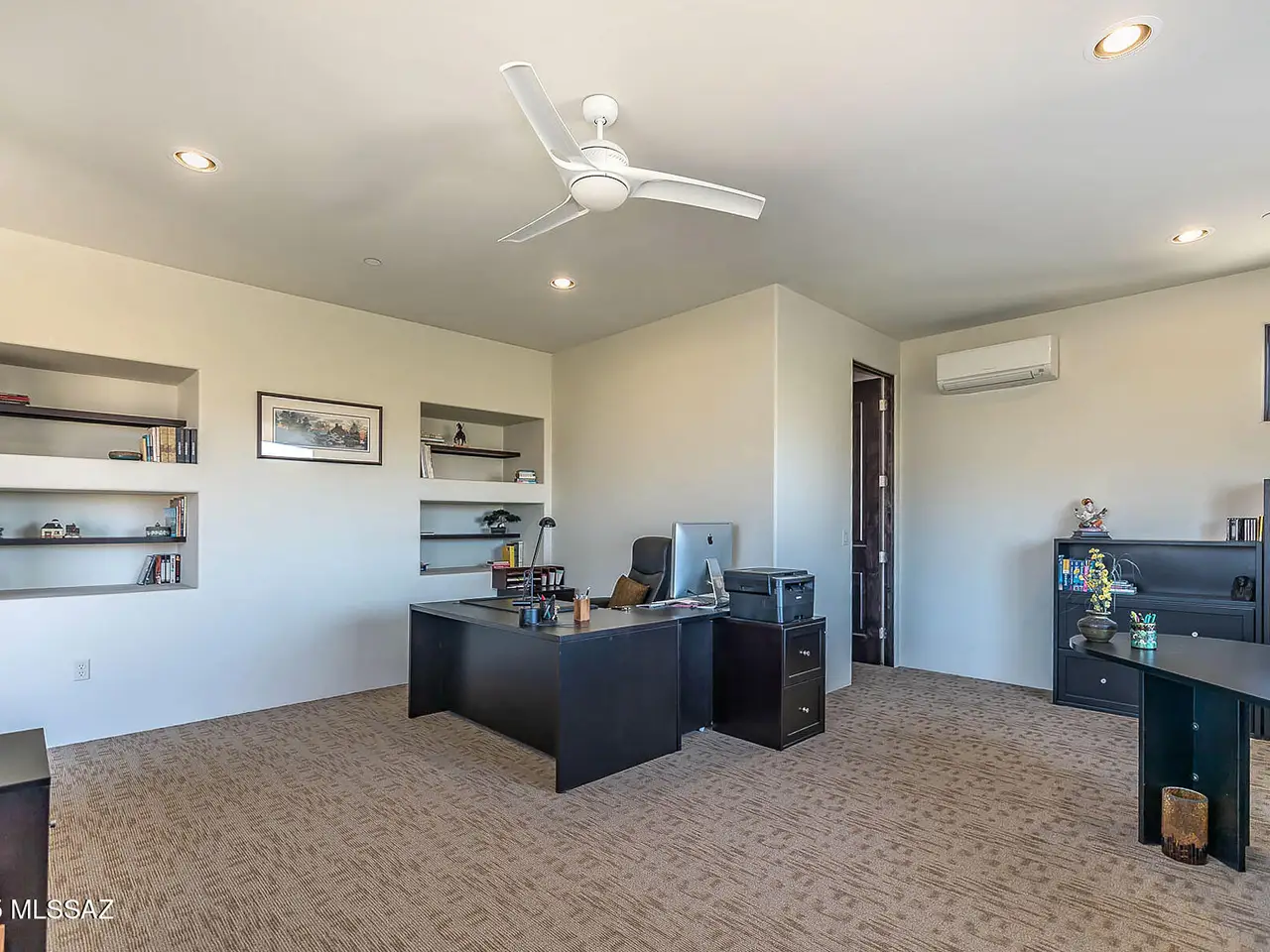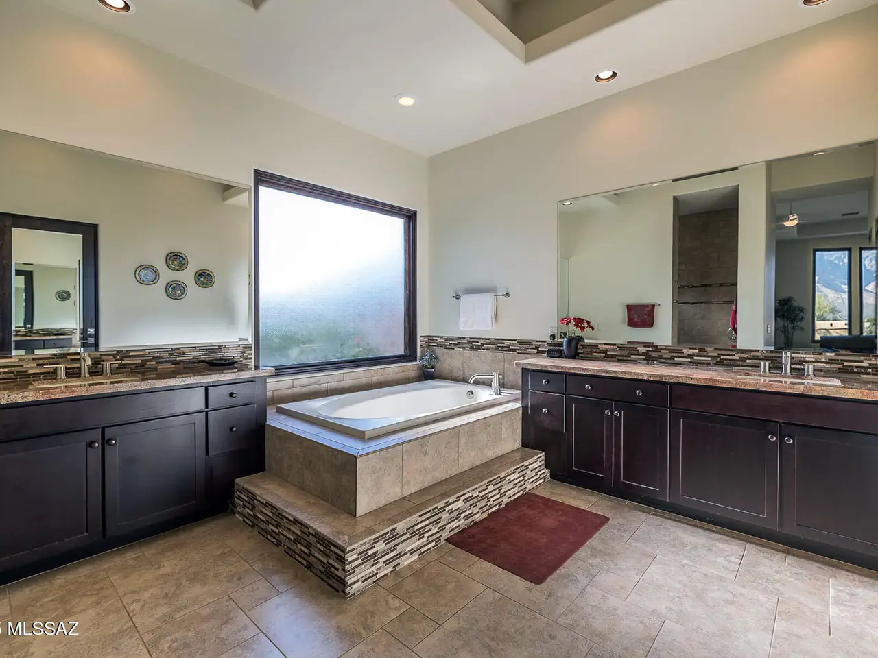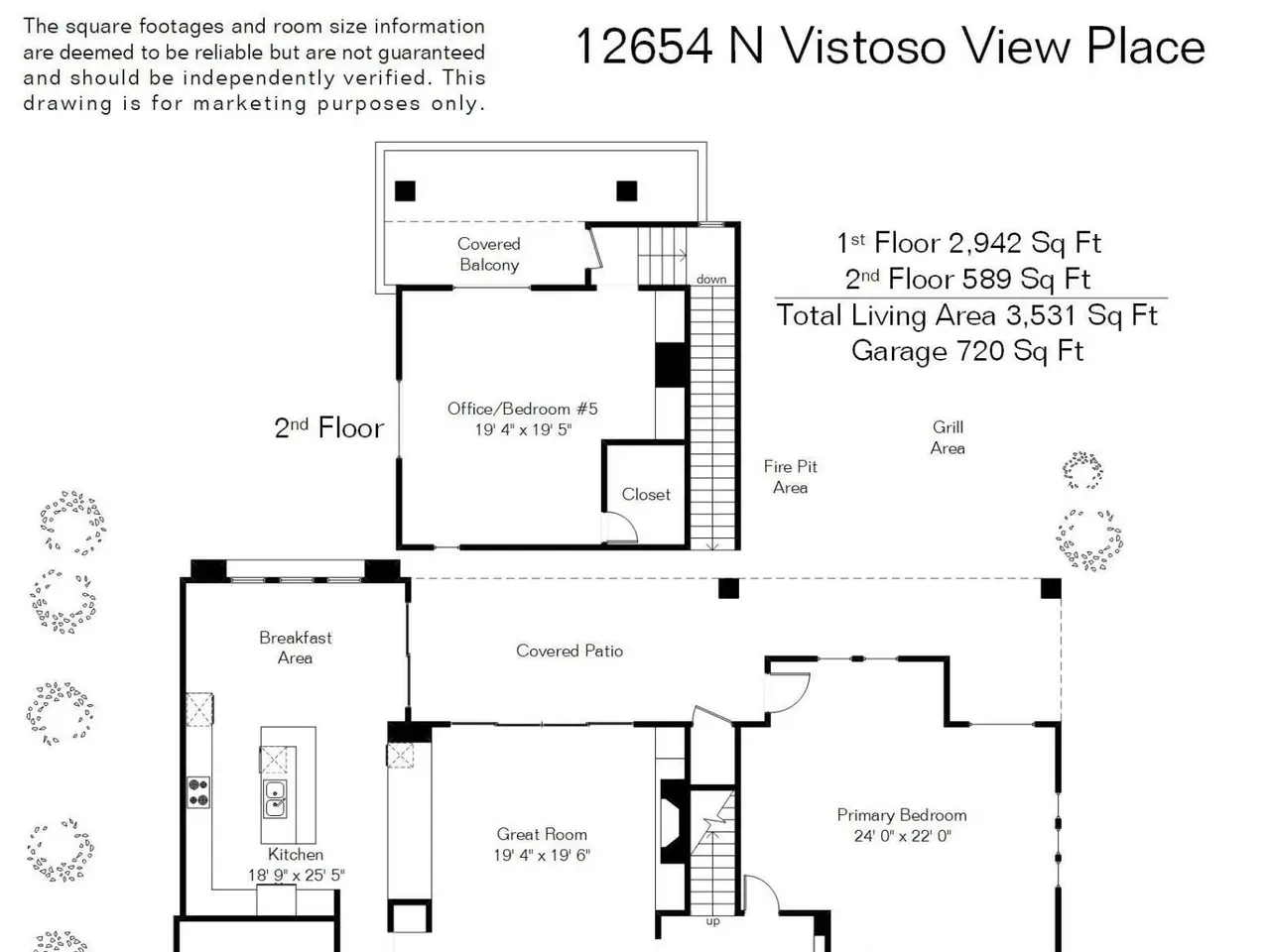 LUXURIOUS CUSTOM ESTATE nestled within the gated, picturesque community of Vistoso Pointe affords architectural detail, flexible living spaces plus uncompromising desert, mountain & city light views. Elevated, Premium East-facing lot with no one directly behind affords ultimate privacy. Featured are 4 bedrooms, 2.5 baths plus 3,531 sq ft of elegant living space including a spacious, upper level office/5th bedroom. Striking courtyard entry displays an expansive wrought iron gate with slate tile surround to welcome your guests. Inviting foyer flows effortlessly to formal dining room and large gathering room displaying a soaring, recessed ceiling, slate tiled fireplace flanked by art shelves, plus walls of windows accentuating the magnificent views. Gourmet kitchen hosts large center island, in-wall ovens and gas cooktop, open dining area with views plus outer island with wine cooler. Neutral stone floors highlight main living areas with granite countertops in kitchen, laundry & baths. Expansive Owner's Suite with rear patio access hosts a luxury spa bath with dual vanities, soaking tub, plus walk-in rain head shower and custom closet. Third bedroom is ideal as a Den/Media room while expansive upper-level Office accesses private balcony touting forever views. Extended laundry with sink adjoins powder room and 3-car garage with rustic iron doors and storage cabinets. Additional amenities include rich-hued cabinetry and doors, carpeted bedrooms, backlit art alcoves, fire sprinklers plus rolling sunshades off dining room. Retreat to a rear covered patio with outer cobblestone pavers, built-in grill station, firepit with curved bench seating, plus professional landscaping and spectacular views. Perfect for the most discerning buyer!