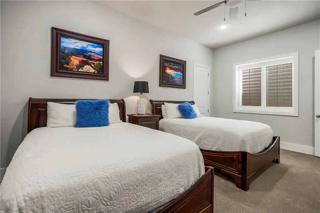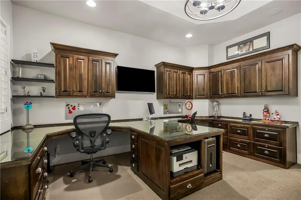This fabulous custom home built by Starr Homes sits nestled on a wonderfully landscaped and private cul-de-sac lot in Leawood's highly sought Highlands Creek Subdivision. The open concept spacious main floor features vaulted ceilings, a cozy fireplace and gorgeous views of your private treed backyard. The kitchen features a stunning under-lit granite island, Thermador appliances and a large breakfast/dining area that opens to a fabulous lanai with built-in grill, fireplace and gas heater offering a wonderful extension of the indoors great for entertaining or just enjoying your private backyard. You'll find a fabulous primary suite on the main floor with a spa-like primary bath with large walk through double shower, adjacent laundry room and large walk-in closet. One additional bedroom on the main currently used as an office walks out to the lanai along with a large pantry, mud room and 1 1/2 additional baths can also be found on the main. The stunning lower level with 11' ceilings walks out to a spacious patio and features a full bar, wine cellar, rec/media room and 23x17 HD golf simulator. Three large bedrooms with private baths and plenty of storage space complete the lower level. This home has so much to offer with a 4-car side-entry garage with epoxy floors that is wired for an EV charger. At 5,848 finished sq ft and an overall sq ft of 7,869 and complete with an elevator and zero entry from the garage, this home truly offers something for everyone!