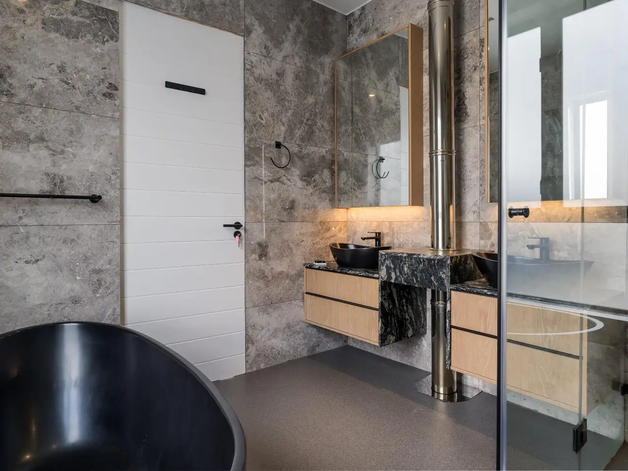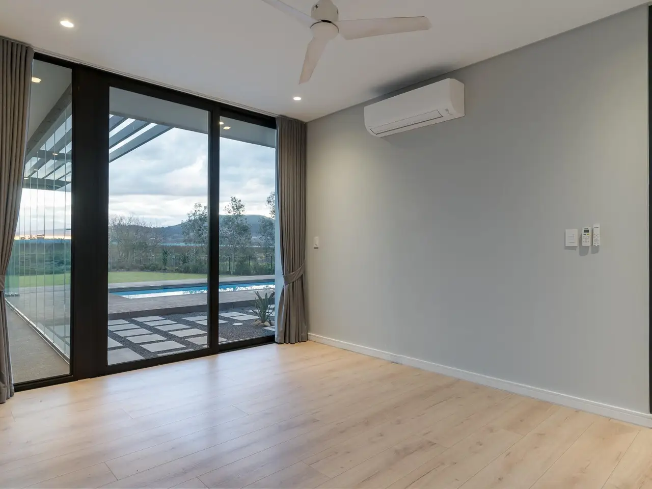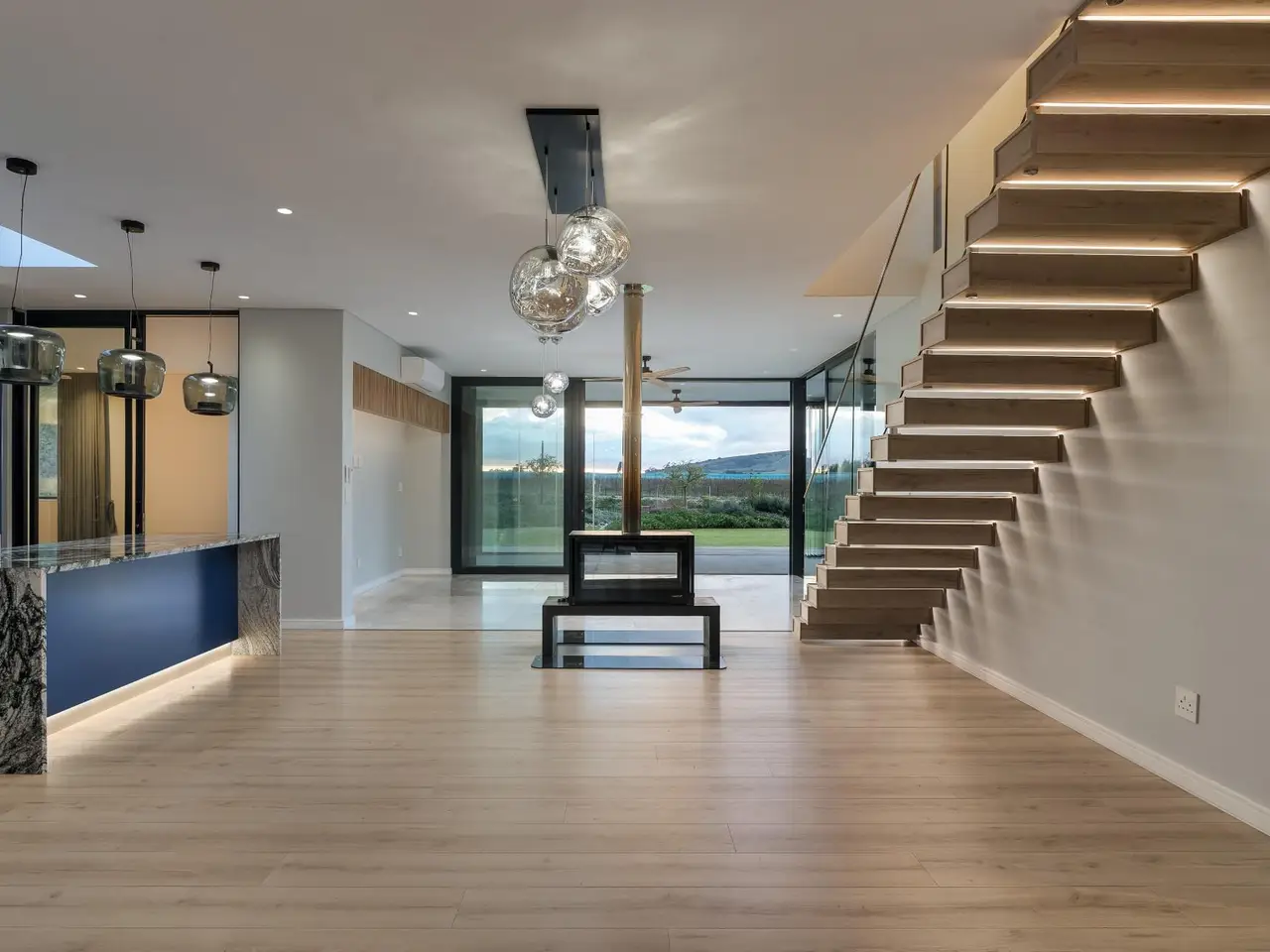 Where mountain views, modern design, and estate lifestyle meet. Situated in the prestigious River Farm area of Val de Vie Estate, this beautifully designed five-bedroom residence offers panoramic views of the Berg River, private vineyards and mountain ranges - an ideal blend of natural beauty and sophisticated living. The layout is thoughtfully planned for both family life and entertaining. The open-concept living space features large glass doors that flood the interior with natural light and lead to a covered entertainment area complete with a built-in braai and bar. A stylish kitchen with a central island, walk-in pantry, and scullery caters to both everyday use and special gatherings. A sliding window brings fresh air and scenic garden views directly into the cooking space. Upstairs, three luxurious en-suite bedrooms open onto a balcony with river and mountain vistas. The main suite is a standout, offering a spacious bathroom with double vanities and a double shower. An additional lounge upstairsGÇöideal for a home office or reading area - also enjoys its own balcony access. Downstairs, two more bedrooms (one en-suite) open to the landscaped garden, creating a private wing perfect for guests or multi-generational living. A second lounge on this level offers added flexibility for quiet evenings or family movie nights. The home is equipped with solar panels, a powerful 30kW inverter system, air conditioning throughout, and a heated saltwater pool - designed for comfort and sustainability. A double garage, separate laundry room, and staff WC round out the practical features. Living in Val de Vie Estate means access to world-class amenities including state-of-the-art security, wellness facilities, top-rated restaurants, scenic trails, polo fields, and quite a few elite schools.
