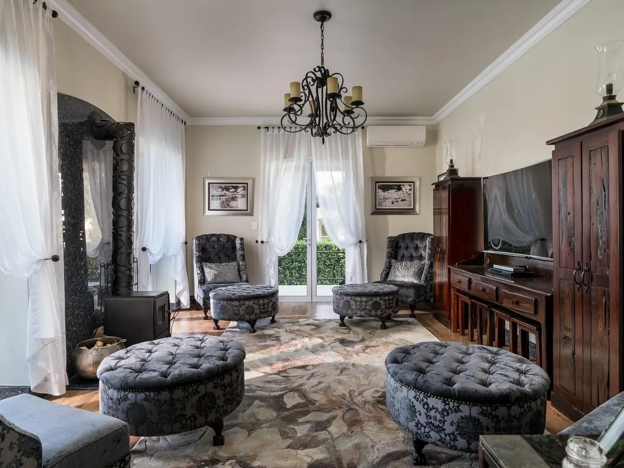 Cocooned between a serene Fynbos Reserve and manicured parklands lies this remarkable residence, offering breathtaking views of the Simonsberg mountains. Panoramic windows frame these stunning vistas, creating a seamless connection between indoor and outdoor ambiance. Designed with both elegance and practicality in mind, the open-plan kitchen, living, and dining areas are perfect for modern living. Custom cabinetry made from reclaimed railway sleepers compliments the black granite of the breakfast nook, which takes centre stage in the kitchen and allows one to gaze at the mesmerizing views. The space is further enhanced by a walk-in pantry, scullery/ laundry and French doors that open to a private courtyard garden. The northern side of the home cleverly offers an an undercover patio, accessed via French doors and spanning the entire frontage , effortlessly linking the sunlit interiors to the surrounding natural beauty, while offering protection from the wind. A beautifully landscaped garden framed by lush hedges offers an expansive pool, fabulous firepit and direct access to a stunning green belt. Downstairs also hosts a formal lounge with wood burning fireplace and a guest bedroom featuring its own private patio. The master suite is exceptional in size and comforts and enjoys sweeping views from both sides. A true sanctuary, complete with a spacious dressing room, luxurious en suite bathroom, underfloor heating and a private balcony. There are two additional en suite bedrooms upstairs, one of which offers a spa bath and sauna in the bathroom. Additionally, a North facing home office opens onto the balcony, offering more mountain views. Finishing off this incredible home are 3 garages, a CCTV and motion-sensor system, outdoor lighting for security, heat pump & automated pool cover for energy efficiency and solar power system with batteries & inverter. Set in one of Val de Vie EstateGÇÖs most sought-after locations, this home blends refined luxury with functional design and natural beauty, making it one of the most desirable properties on Val de Vie Estate. The home is sold fully furnished and includes valuable artwork and bespoke furniture, as well as appliances. Further details can be provided on request.