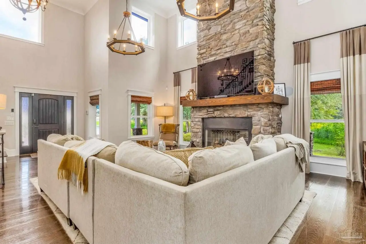 Cathedral ceilings with floor-to-ceiling stone fireplace