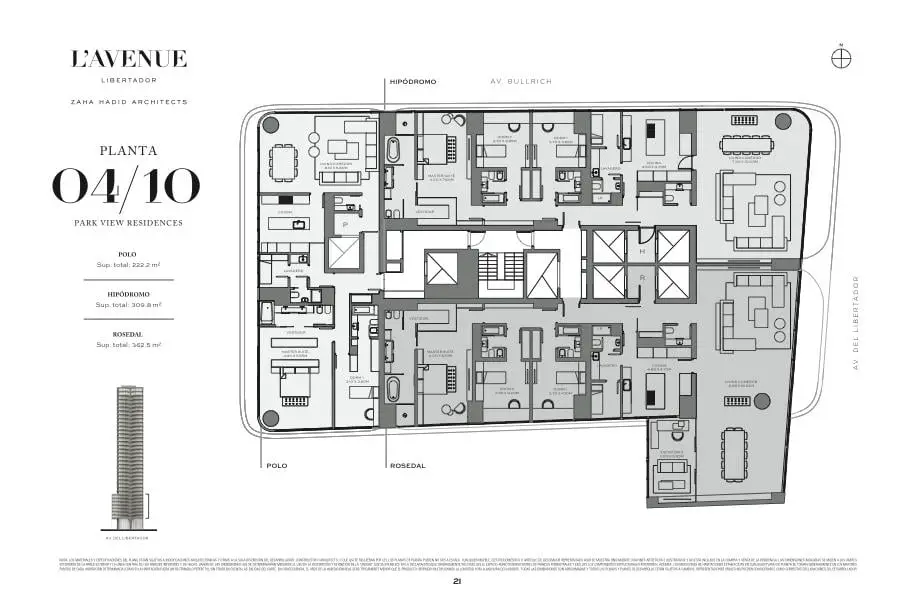 The avant-garde of global architecture comes to Buenos Aires, in the best location in the entire city, with panoramic views in the middle of nature. L'Avenue Libertador will transform the perception of residential projects in Argentina, with a design by Zaha Hadid Arquitects. It is the next reference icon of BA. An exquisite harmony between interior and exterior through the curved balconies and with the vibrant energy of Avenida Libertador at your feet. - 3-meter-high 360° fully glazed windows - spaciousness as a way of life - avant-garde in every detail - sophisticated materials - elegance and modernity every day - extraordinary views of the river, the polo field, the racetrack and the Rose Garden. - in/out heated pool surrounded by green spaces - relaxation lounge, spa and hair salon - fitness center - glazed lounge and 720 m2 roof top for meetings and celebrations This unit has 173 m2 covered and almost 34 m2 of balcony, with a panoramic view of Avenida Bullrich with a view of the Polo Field. Large living room and two suites plus service quarters. Ask about other available units! The property offered is not accessible for people with reduced mobility. Details: Total area: 207 m2 Code: MAP5130141 Type: Apartment Bedrooms: 3 Age: Under construction Bathrooms: 2 Toilettes: 2 Covered area: 173 m2 Semi-covered area: 33 m2 Rooms: 4