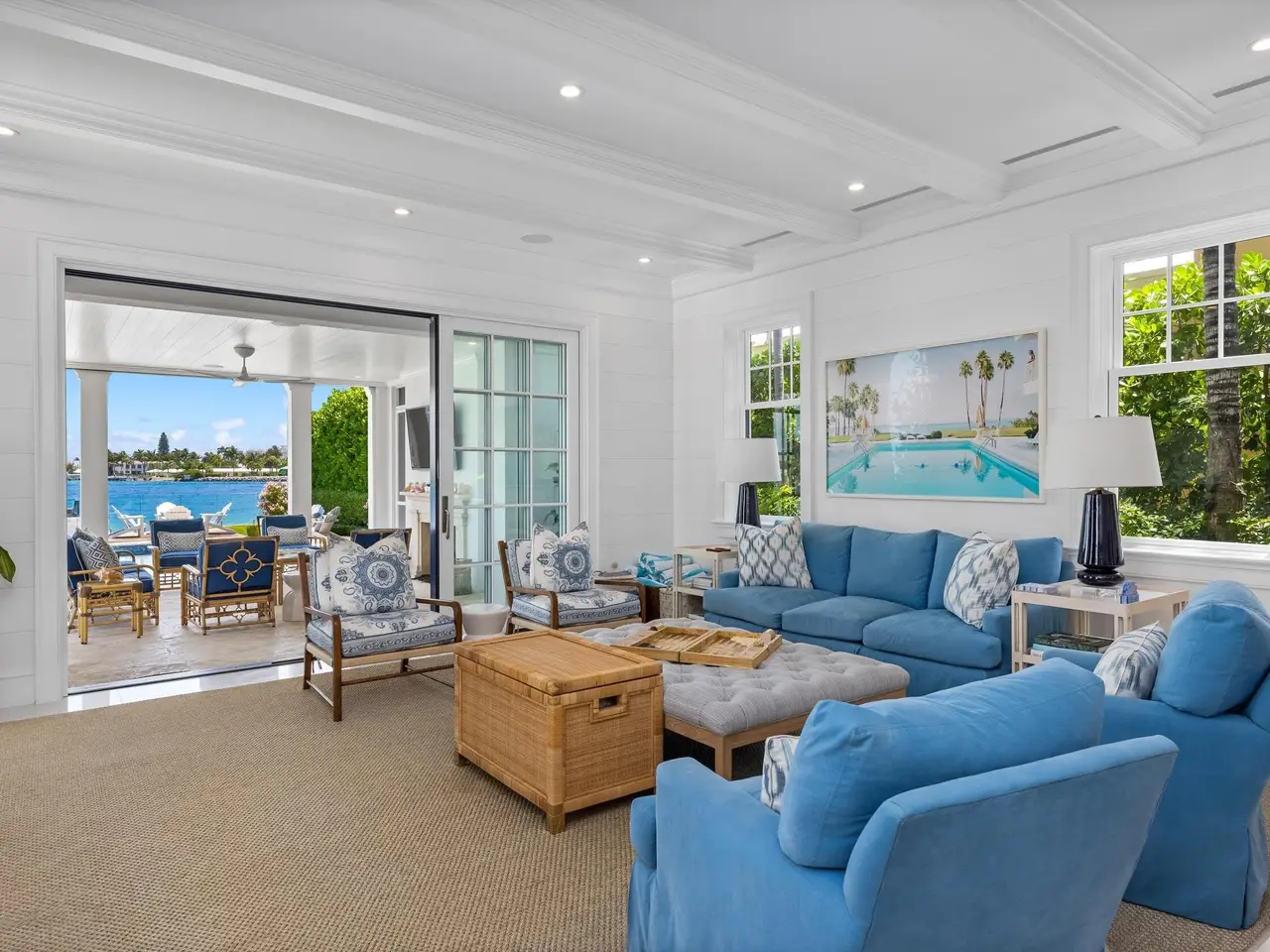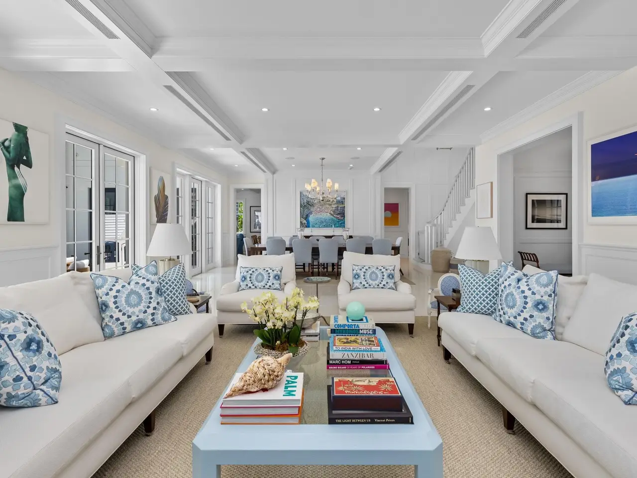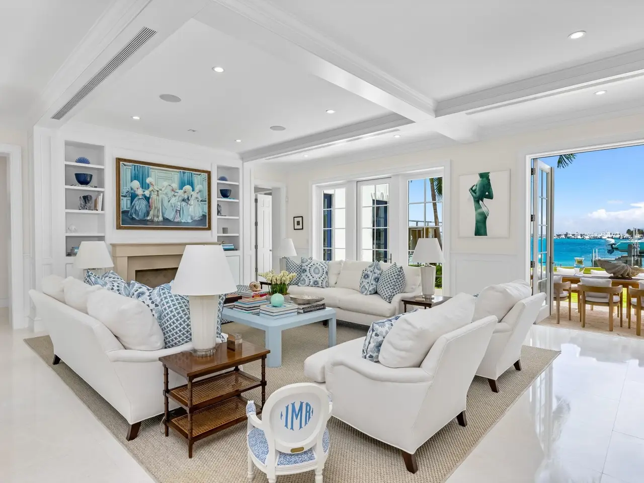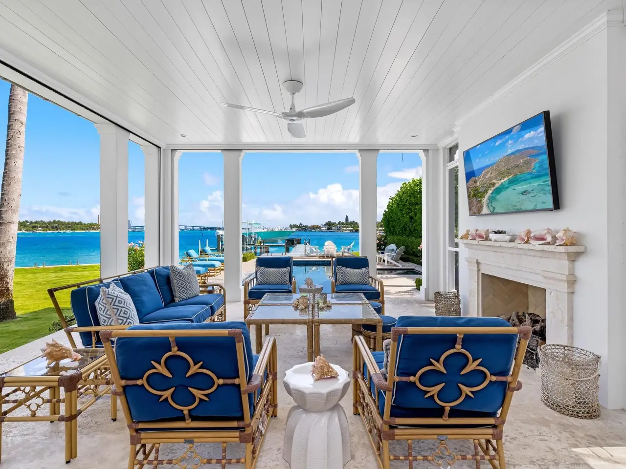 Stately fireplace with Bahamian blue water colors
