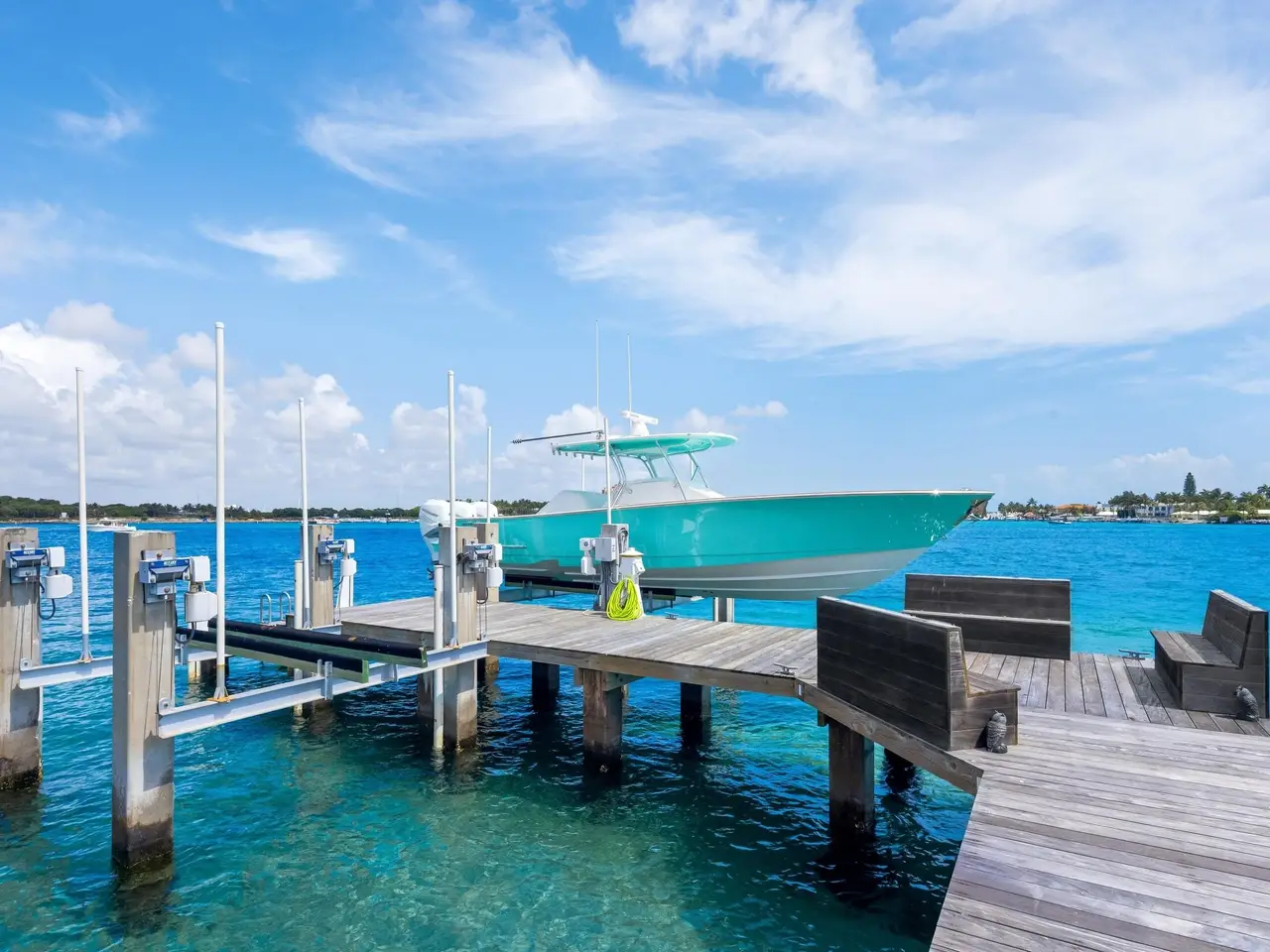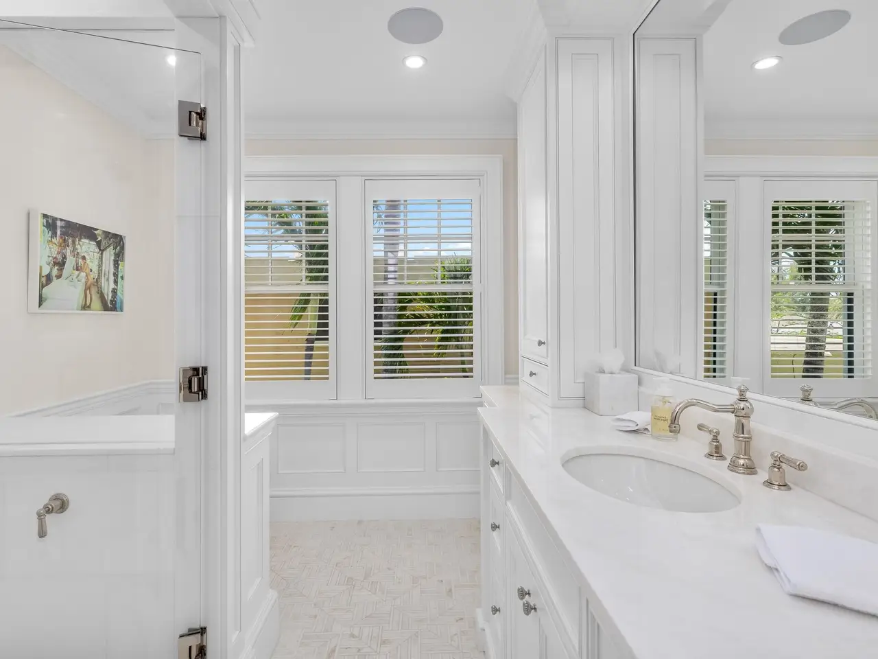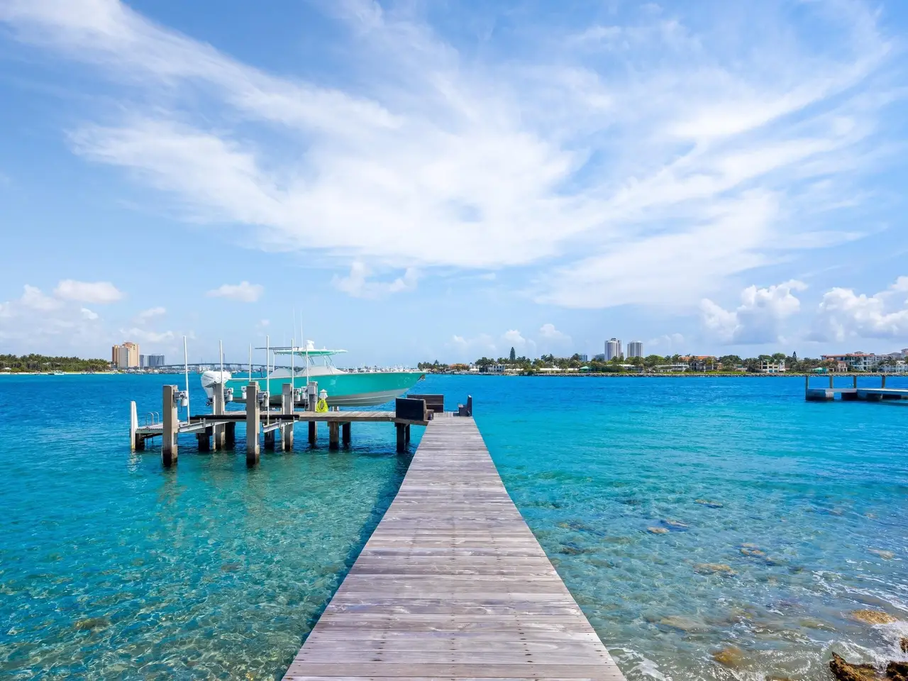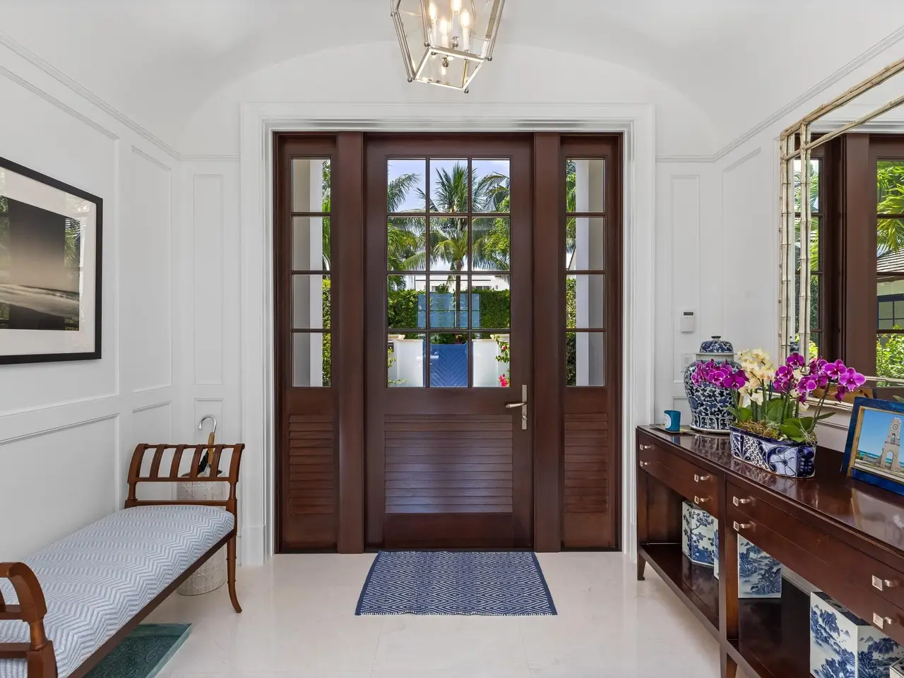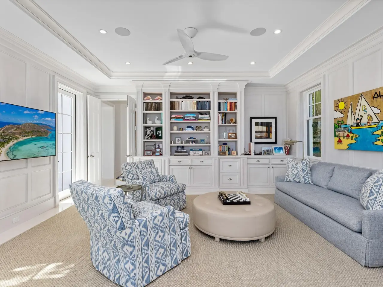Stately fireplace with Bahamian blue water colors