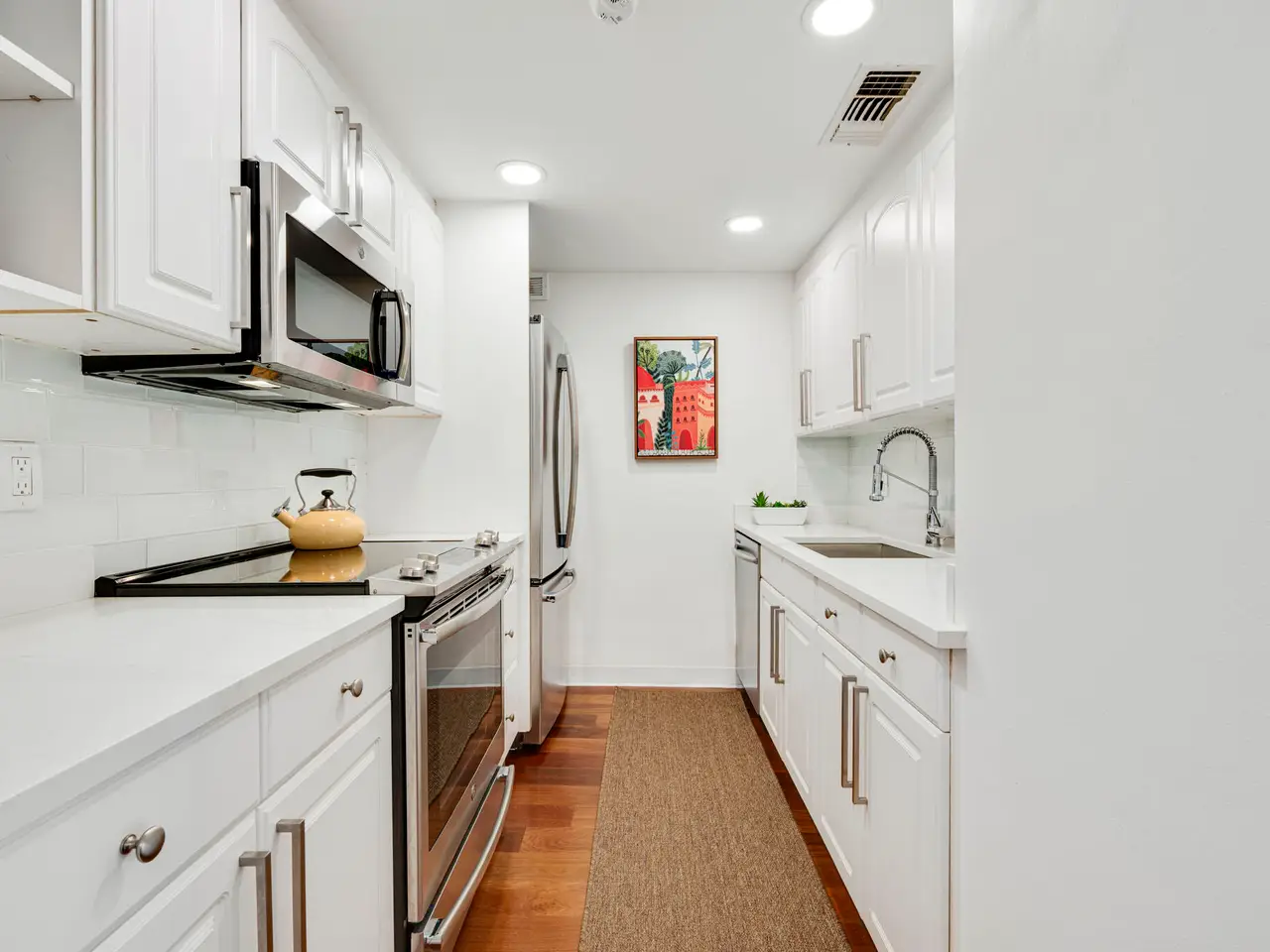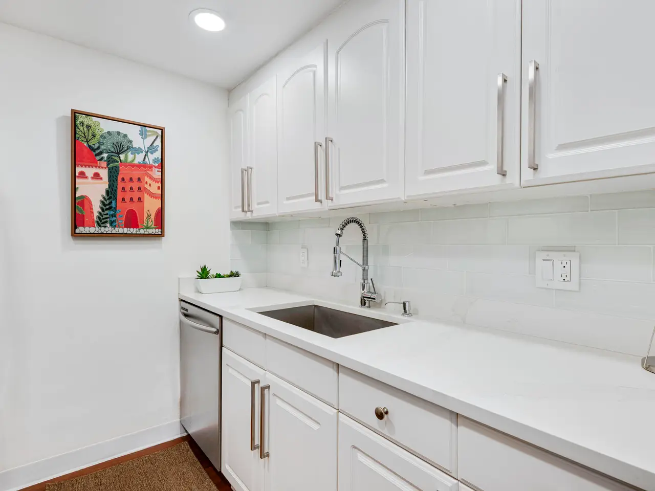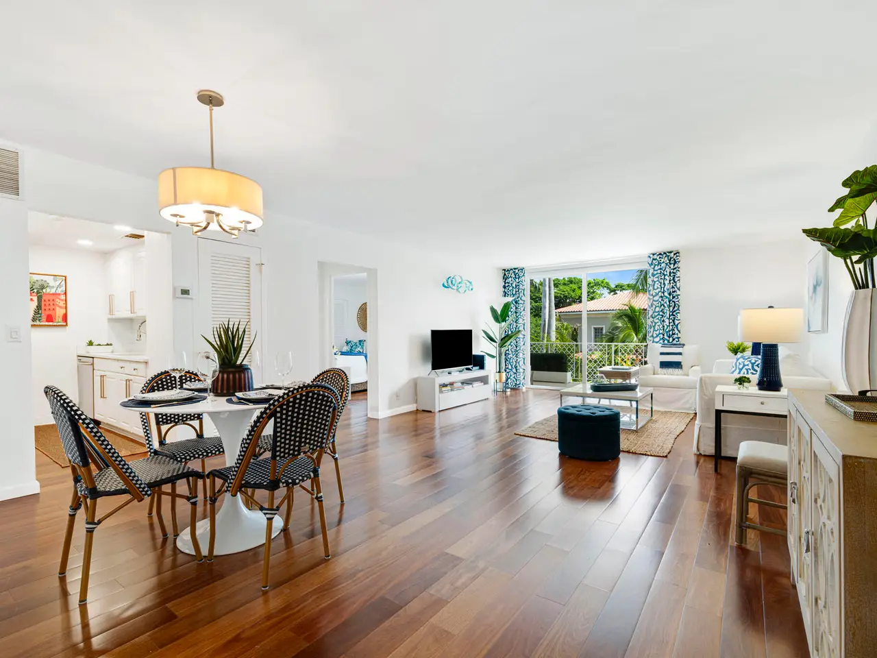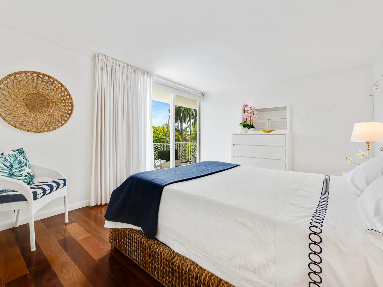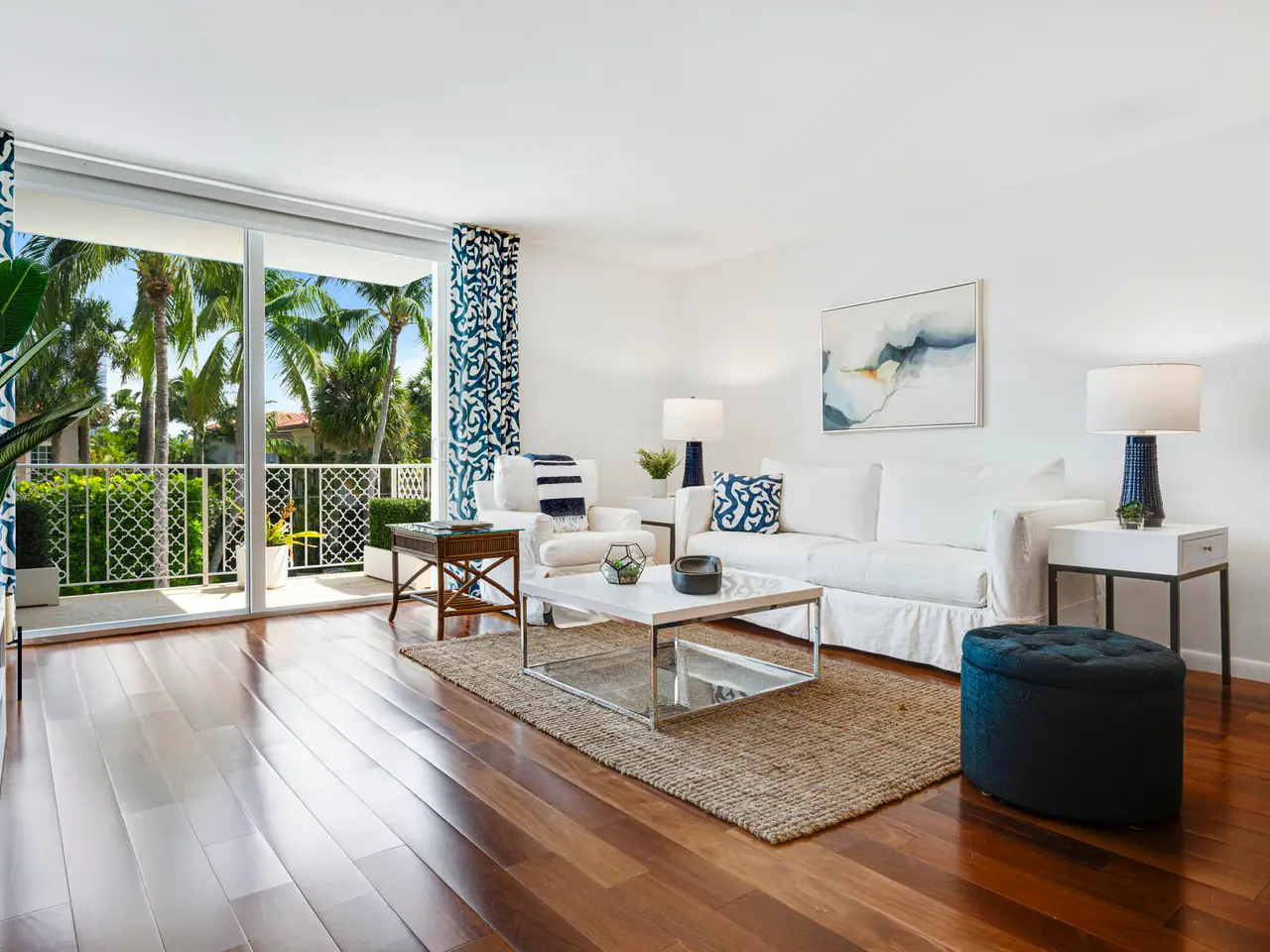 Exquisitely renovated with beautiful finishes including lovely wood flooring, white high end kitchen and bathroom. This newly completed apartment has wide sliding hurricane impact doors in both the living room and bedroom with spacious balcony overlooking the lovely residential neighborhood of the middle block of Chilean Avenue. Island House is a well kept secret and loved for its boutique private ambiance, plus services, and convenient location close to restaurants and world class shopping. Covered parking, heated pool and lovely pool side cabana area for relaxing. The building also has a fabulous guest apartment for residents use when they have family or guests staying. Has a bike room. Pet friendly. This building has met all structural requirements and there are no SEE MORE: