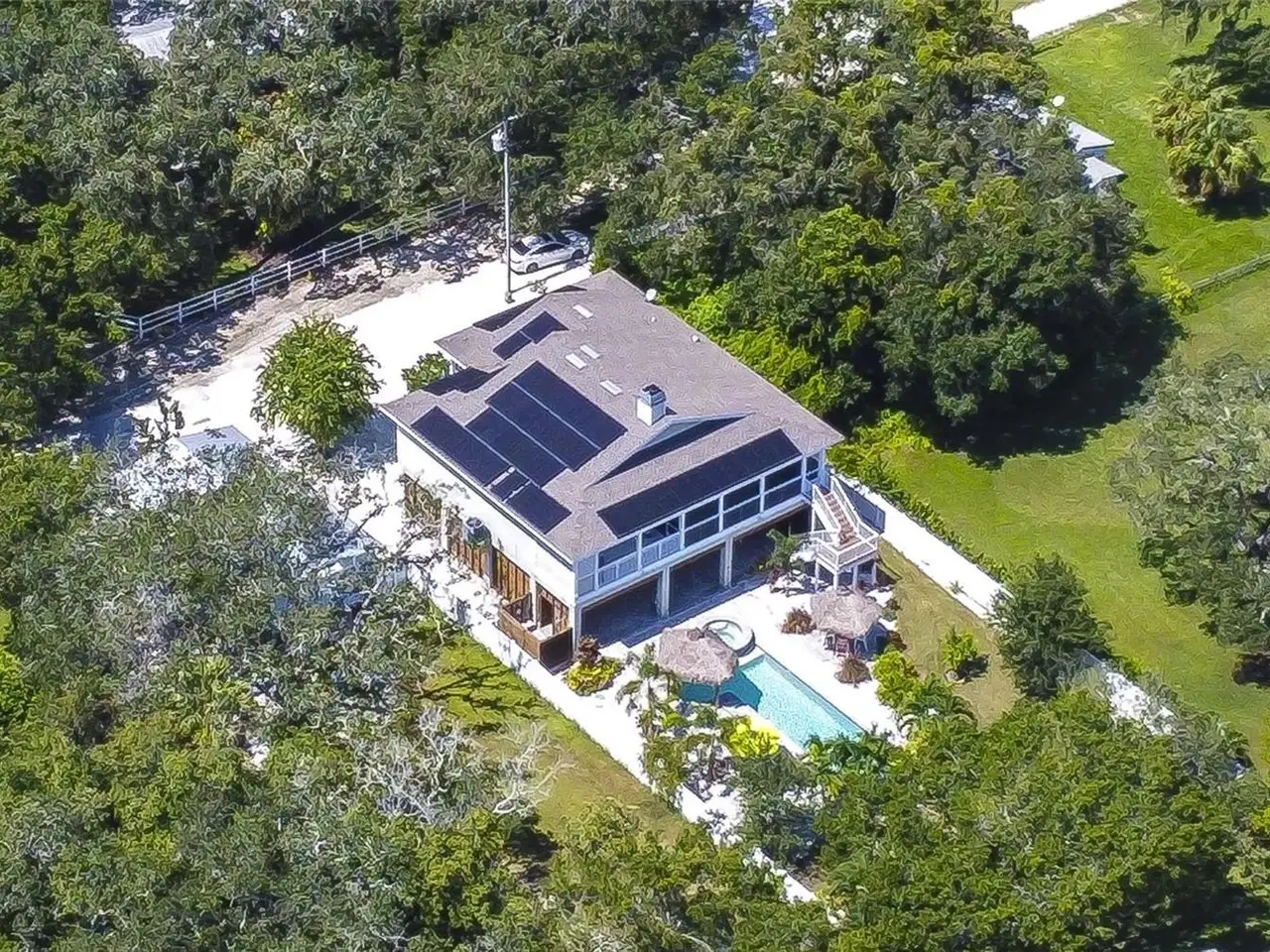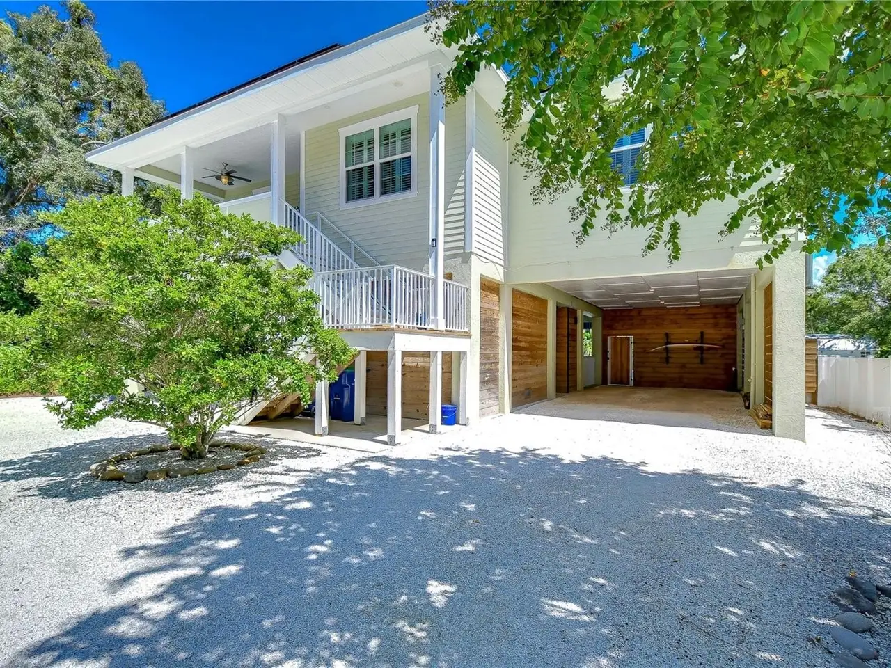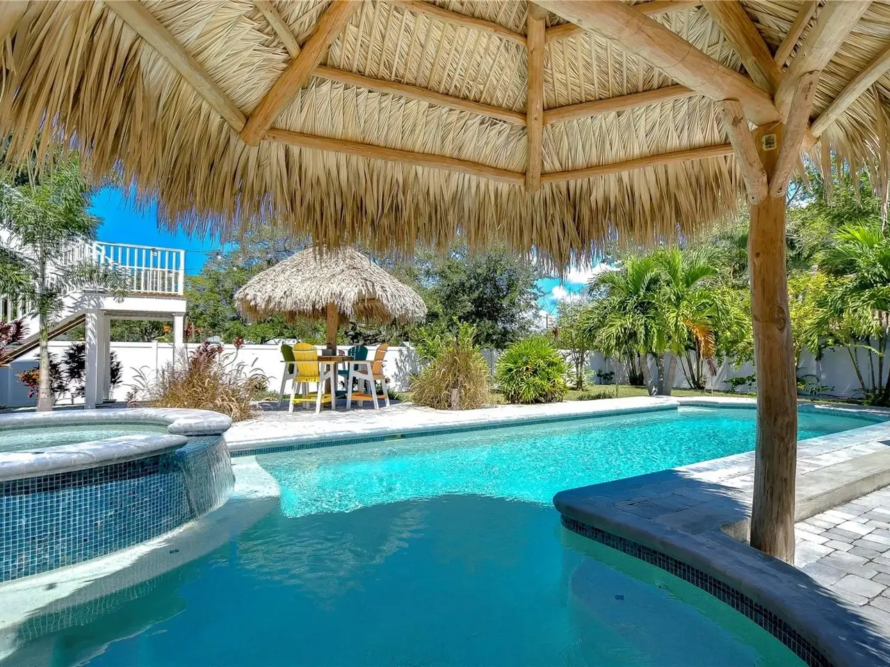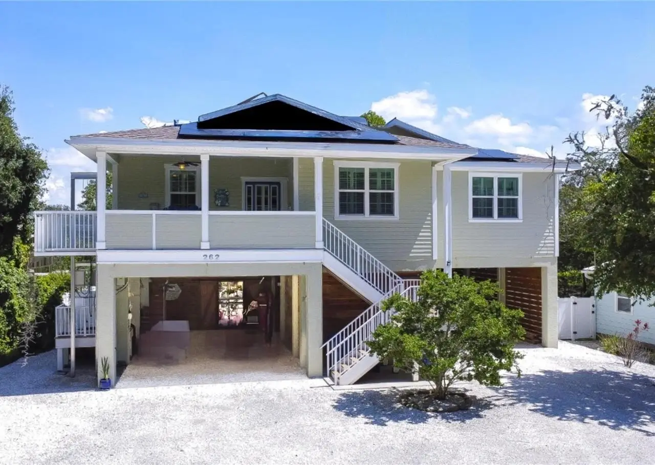 Experience upscale Coastal living in this elevated home...where meticulous construction meets comfortable luxury. Designed to embrace the Florida lifestyle inside and out, this wonderful property offers so much to enjoy. From a Breezy, light and bright interior to a tropical oasis backyard, it was Custom designed and built in 2016 with impeccable attention to detail and fortified for strength. This private stilt home offers both casually luxurious living and peace of mind. It proudly sits 17 feet above sea level on a private .32 acre lot and was constructed to rigorous FEMA standards. Crafted for resilience and eco-conscious living, the home features Hurricane-rated impact windows and doors, 55 solar panels that keep electric bills to an astonishing $30 per month, 140-gallon propane tank powering on-demand hot water, a grill, and generator connections, and all of the under home lumber is desirable "saltwater splash" dock grade, and pilings, headers, footers are concrete. Inside you will discover a space that wows with high quality and uniquely designed finishes.. custom shiplap walls, barn door accents, soaring vaulted ceilings with dimmable LED lighting and fans, and plantation shutters throughout. The floorplan is fun and functional and just right for everyday living or entertaining. Enjoy generous bedrooms, laundry utility room, and walk in pantry. Sliders from Living Room and primary bedroom open to an amazing screened in patio overlooking the backyard. 1000lb exterior elevator lift, 240 sqft of under home storage and under house/carport parking for up to 8 vehicles! And the Backyard...will truly take your breath away! It is private oasis that would make Jimmy Buffett proud! Showcasing a 2020 heated and cooled sparkling saltwater pool complete with spillover spa a shaded grotto seating, two locally designed and hand crafted tiki huts, and over 1,500 square feet of pavered patio space, and just under 2000 square feet of covered patio space for shady lounging and outdoor living, a whole house mosquito misting system and a retro fabulous custom outdoor surfboard and cypress lined shower. Your guests will never want to leave! Ozona is a unique community with coastal charm, 5 marinas, restaurants that are loved, and a waterfront with the most beautiful sunsets! Ride your bike or drive your golf cart all around town! This area is in unincorporated Pinellas -- possible short term rental and available fully furnished! Come make 262 Banana Road your Coastal Paradise! View matterport and virtual tour at https://my.matterport.com/show/?m=t4Nu3C1amJL&mls=1