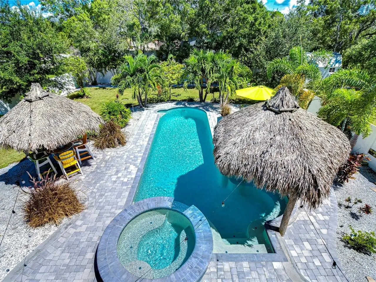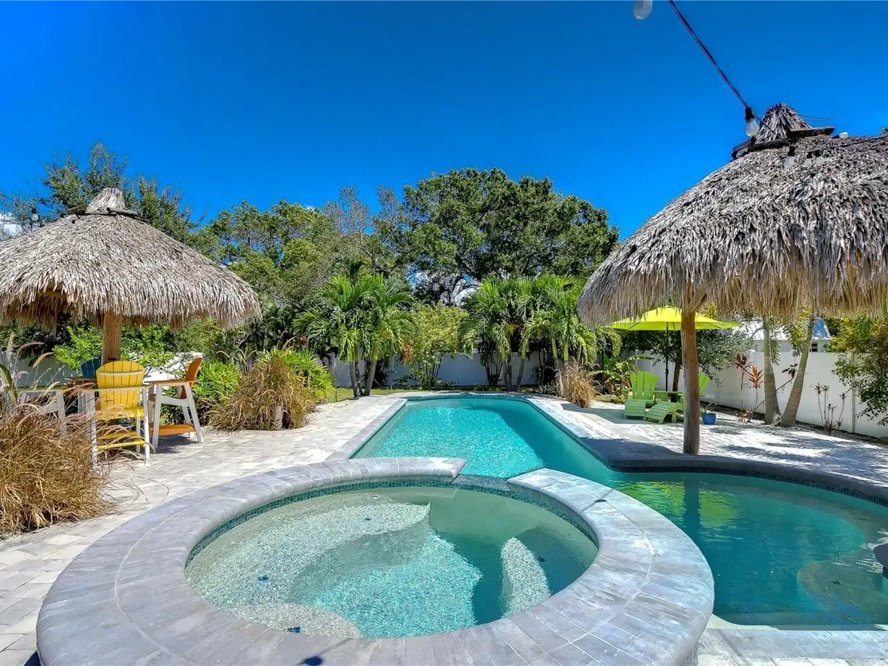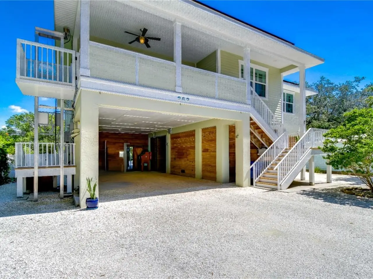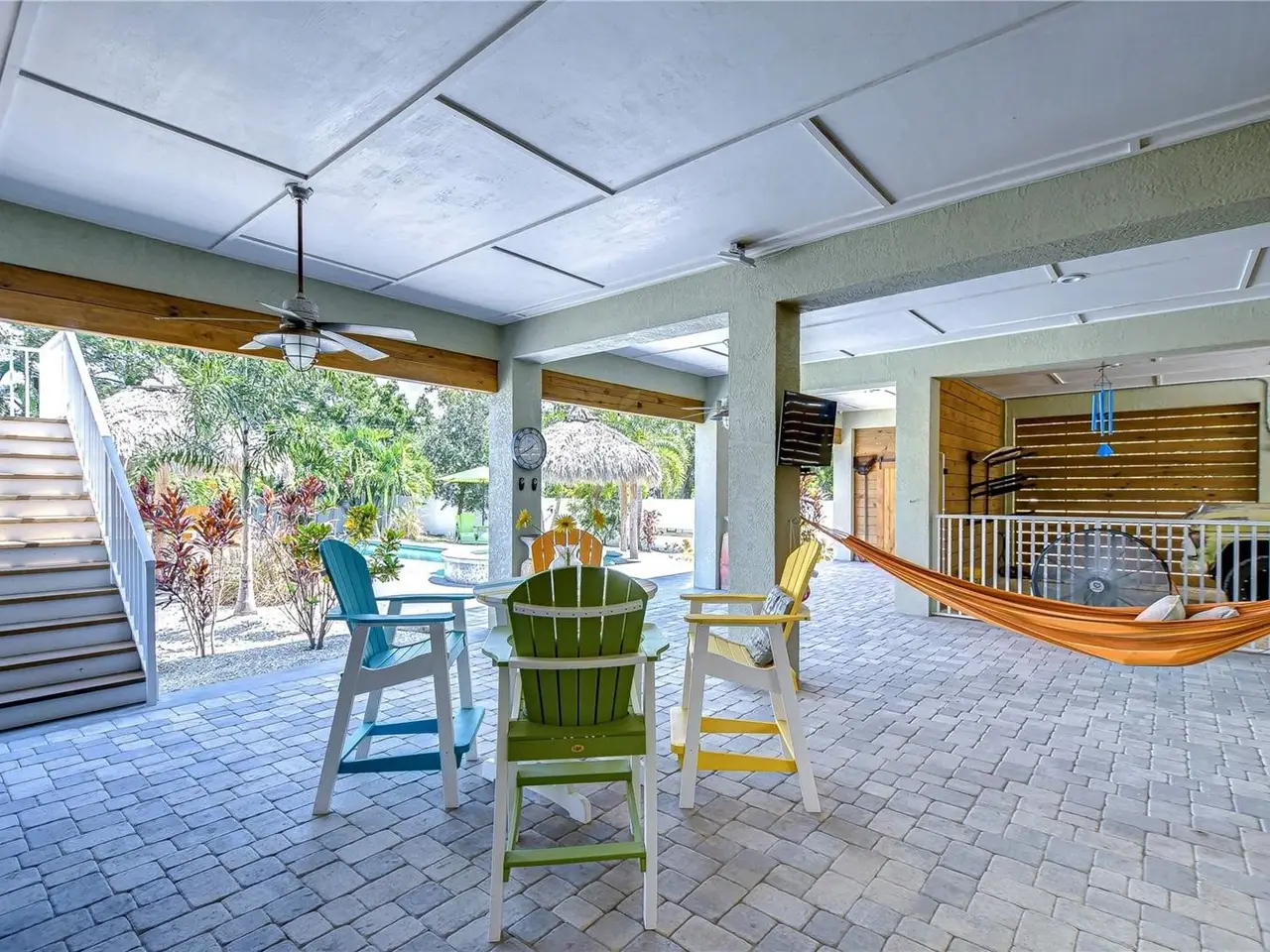 Experience upscale Coastal living in this elevated home...where meticulous construction meets comfortable luxury. Designed to embrace the Florida lifestyle inside and out, this wonderful property offers so much to enjoy. From a Breezy, light and bright interior to a tropical oasis backyard, it was Custom designed and built in 2016 with impeccable attention to detail and fortified for strength. This private stilt home offers both casually luxurious living and peace of mind. It proudly sits 17 feet above sea level on a private .32 acre lot and was constructed to rigorous FEMA standards. Crafted for resilience and eco-conscious living, the home features Hurricane-rated impact windows and doors, 55 solar panels that keep electric bills to an astonishing $30 per month, 140-gallon propane tank powering on-demand hot water, a grill, and generator connections, and all of the under home lumber is desirable "saltwater splash" dock grade, and pilings, headers, footers are concrete. Inside you will discover a space that wows with high quality and uniquely designed finishes.. custom shiplap walls, barn door accents, soaring vaulted ceilings with dimmable LED lighting and fans, and plantation shutters throughout. The floorplan is fun and functional and just right for everyday living or entertaining. Enjoy generous bedrooms, laundry utility room, and walk in pantry. Sliders from Living Room and primary bedroom open to an amazing screened in patio overlooking the backyard. 1000lb exterior elevator lift, 240 sqft of under home storage and under house/carport parking for up to 8 vehicles! And the Backyard...will truly take your breath away! It is private oasis that would make Jimmy Buffett proud! Showcasing a 2020 heated and cooled sparkling saltwater pool complete with spillover spa a shaded grotto seating, two locally designed and hand crafted tiki huts, and over 1,500 square feet of pavered patio space, and just under 2000 square feet of covered patio space for shady lounging and outdoor living, a whole house mosquito misting system and a retro fabulous custom outdoor surfboard and cypress lined shower. Your guests will never want to leave! Ozona is a unique community with coastal charm, 5 marinas, restaurants that are loved, and a waterfront with the most beautiful sunsets! Ride your bike or drive your golf cart all around town! This area is in unincorporated Pinellas -- possible short term rental and available fully furnished! Come make 262 Banana Road your Coastal Paradise! View matterport and virtual tour at https://my.matterport.com/show/?m=t4Nu3C1amJL&mls=1