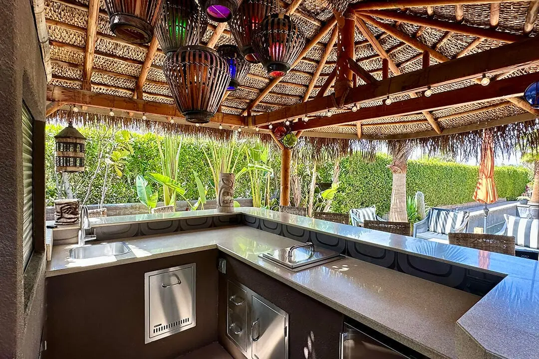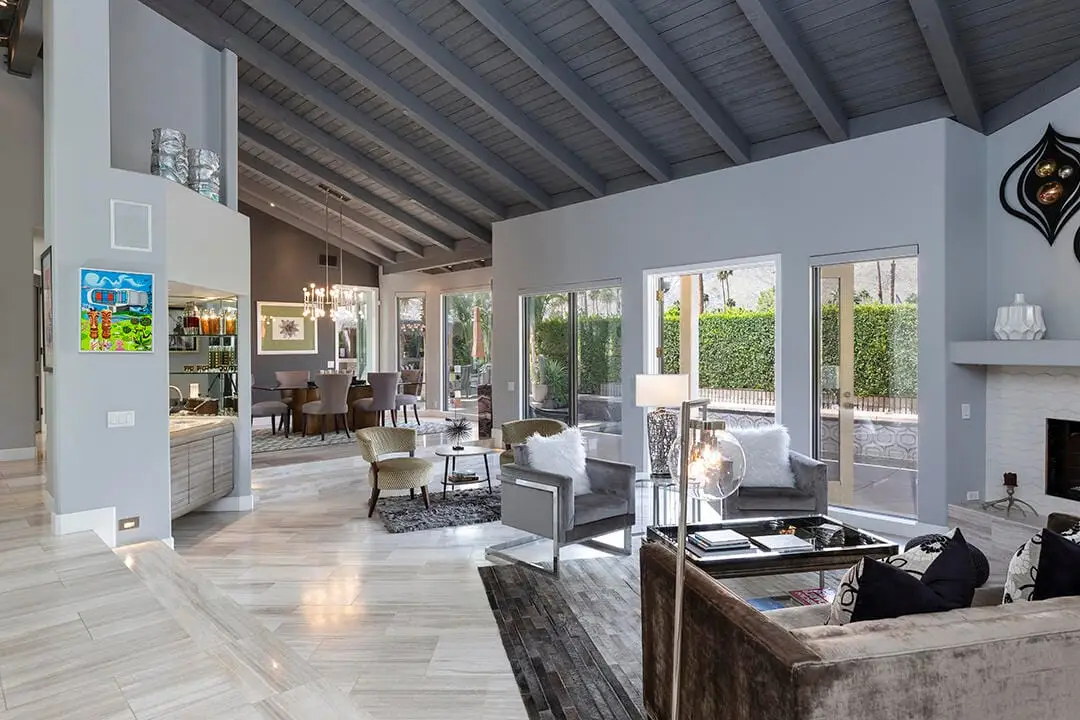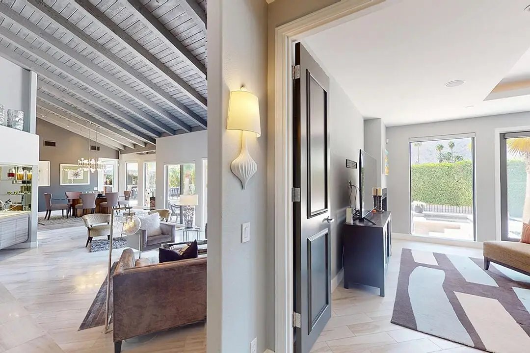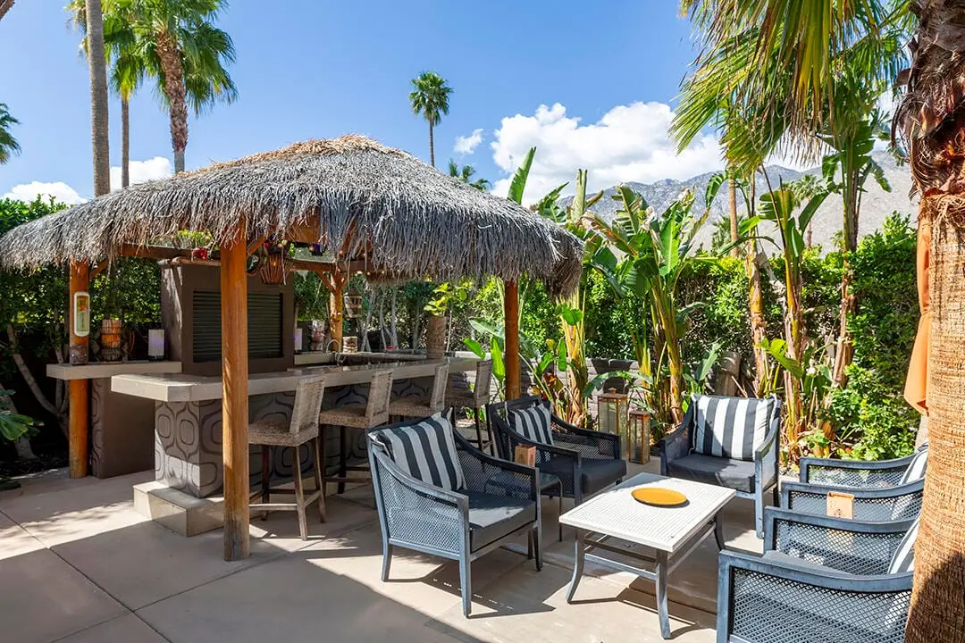 This beautifully remodeled property offers a luxury living experience, blending modern elegance with Polynesian-inspired flair. This immaculate, four-bedroom home is on fee land in the sought-after Indian Canyons neighborhood in South Palm Springs. Its open living room and dining area boasts vaulted and beamed ceilings. A wall of windows and doors to the backyard highlights the pool and panoramic mountain views. The main entertaining area also has a wet bar and an adjoining media room.The designer kitchen is a masterpiece centered around an oversized prep island with dine-in seating. This gourmet space showcases custom cabinetry, premium high-end appliances, and abundant room for entertaining family and friends. Fleetwood sliding doors lead directly to an outdoor paradise featuring a luxurious tiki bar, Polynesian-inspired pool with spa, and outdoor kitchen.The primary suite is a retreat that features a cozy sitting area with a gas fireplace, direct poolside access, a generous en ensuite bathroom, and a Sex in the City worthy walk-in closet. Additionally, the home provides three more comfortable bedrooms two of which include their own ensuite bathrooms. The home has leased solar and the convenience of an attached two-car garage.Bedrooms | Total 4 | 3 bedroom suites Bathrooms | 4 Total | 3 ensuite and a guest bathInterior size | 3,338 sqftLand | Lot size 12,197 sqft Fee Land - you own the landBuilt | 1990Parking | Attached 2-car garageLeased Solar | $326 per month | Installed 2018 | 52 panels; 18.72 direct current; 17.97 alternating currentAdditional Items and Amenities: Pool equipment installed in 2018 Two HVAC systems installed in 2020 Two on demand water heaters installed 2018