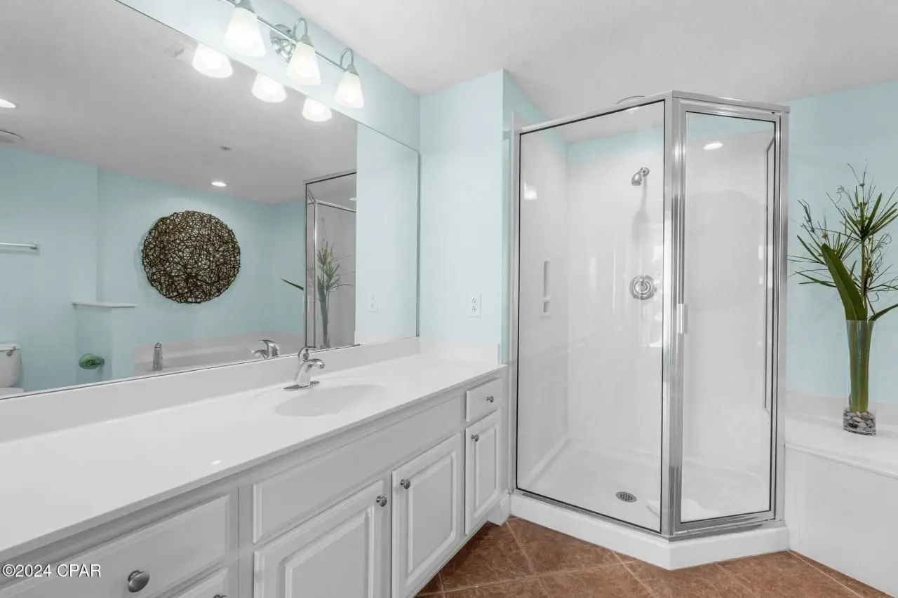 The Palazzo Resort is the premier condominium complex on the much sought after West End of Panama City Beach, FL. It is located a mile west of Pier Park, which means there is much less traffic congestion and is only a15-minute drive to Rosemary Beach and 30A. You can also quickly get to your favorite PCB attractions like the Sky Wheel, Aaron Bessant Park's open air amphitheater, Pier Park Dog Beach, Gulf World, and the coming Top Golf + Dolly Parton Dinner Theater. It is also easy to get to your favorite dining establishments like Runaway Island, Sharky's, Thomas Donuts and the new McGuire's Irish Pub being built right across the street. Palazzo is a ''low density'' resort with only 142 condos and has one of the highest ratios of owner ''non-rental'' units. What this means is that even during the prime summer rental season, it is less crowded on the beach and is much more quiet inside the resort. The amenities include a BBQ/grill and picnic area, dog walk, swimming pool, hot tub and a fitness center with ceiling to floor views of the Gulf! This 3 bedroom + 3 full bath corner unit is incredible with its westward facing 9th floor wraparound balcony showing off the most amazing, unobstructed sunset views through the floor to ceiling windows. As you walk into the foyer, you are mesmerized by the floor to ceiling views of the emerald green waters of the Gulf of Mexico. Then, you see the modern, fully equipped kitchen that features all stainless, high-end Kitchen Aid appliances, a custom backsplash, oversized island, lots of cabinetry, and recessed lighting. The wide-open living area welcomes you with a large sectional sofa, 2 coastal chairs, modern accessories, and a large wall-mounted TV. The quaint dining room has its own alcove with floor to ceiling views of the Gulf to the South and the beaches to the West. The Master en suite is Gulf front with floor to ceiling windows and also with South and West views. A large, comfy king size bed and bright, tasteful beach inspired furniture and decor make this space a relaxing oasis. It has 2 vanity areas with tasteful hardware, gorgeous mirrors and glass walk-in shower. The second master en suite is perfectly located on the opposite side of the unit. The bedroom is spacious and has Westward looking floor to ceiling windows with its own private balcony. The en suite boasts a glass enclosed shower, a single vanity, with its own floor to ceiling Westward facing window with shade. The guest bath also boasts a tub/shower combo with a single vanity. The guest bedroom is large enough for 2 full size beds and has it's own closet. Don't miss out on this rare opportunity to own a Palazzo 3BR West facing condo.