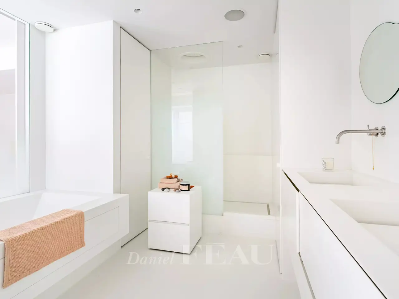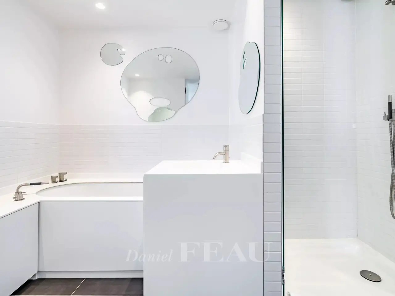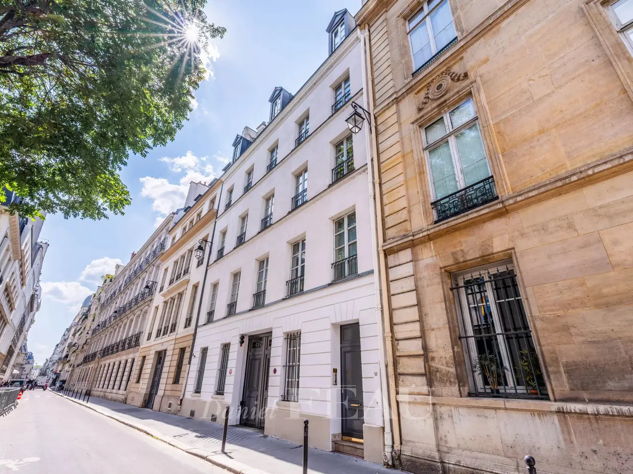 Rue de Lille. This beautifully appointed apartment benefiting from an exceptional 140 sqm roof terrace is on the top floors of a revamped period building. Offering about 290 sqm of floor space and 280 sqm of living space as defined by the Carrez Law, it includes a spacious living/reception room, a kitchen with dining facilities and a dining room, and a storage room. The lower floor comprises a suite with a bathroom and two dressing rooms, two bedrooms each with a shower room, a guest bedroom or study, and a utility room. The bedrooms are air-conditioned. A leafy 140 sqm roof terrace with a summer kitchen and dining room enjoys a view of the Eiffel Tower. With two parking spaces. The apartment is set between a courtyard and a garden and is particularly peaceful.