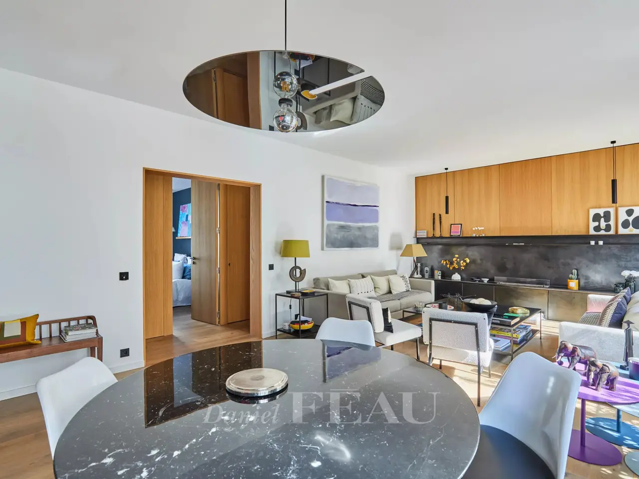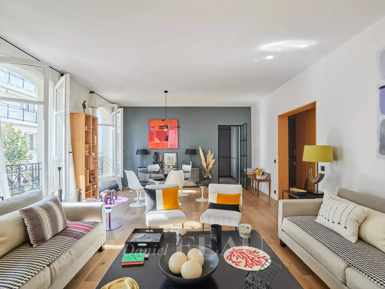 Rue Saint Dominique. This bright and peaceful dual-aspect apartment on the 3rd floor of a fine late 19th century private mansion offers about 86 sqm of living space. Meticulously renovated throughout and benefiting from an excellent floor plan, it includes a spacious west-facing living/reception room and dining room with an ethanol fireplace and a bespoke library area, a fully equipped kitchen with dining facilities, a suite with a shower room and fitted closet, a bedroom with a bathroom, and a guest wc. In a convenient location near the shops, the transport networks and the schools.
