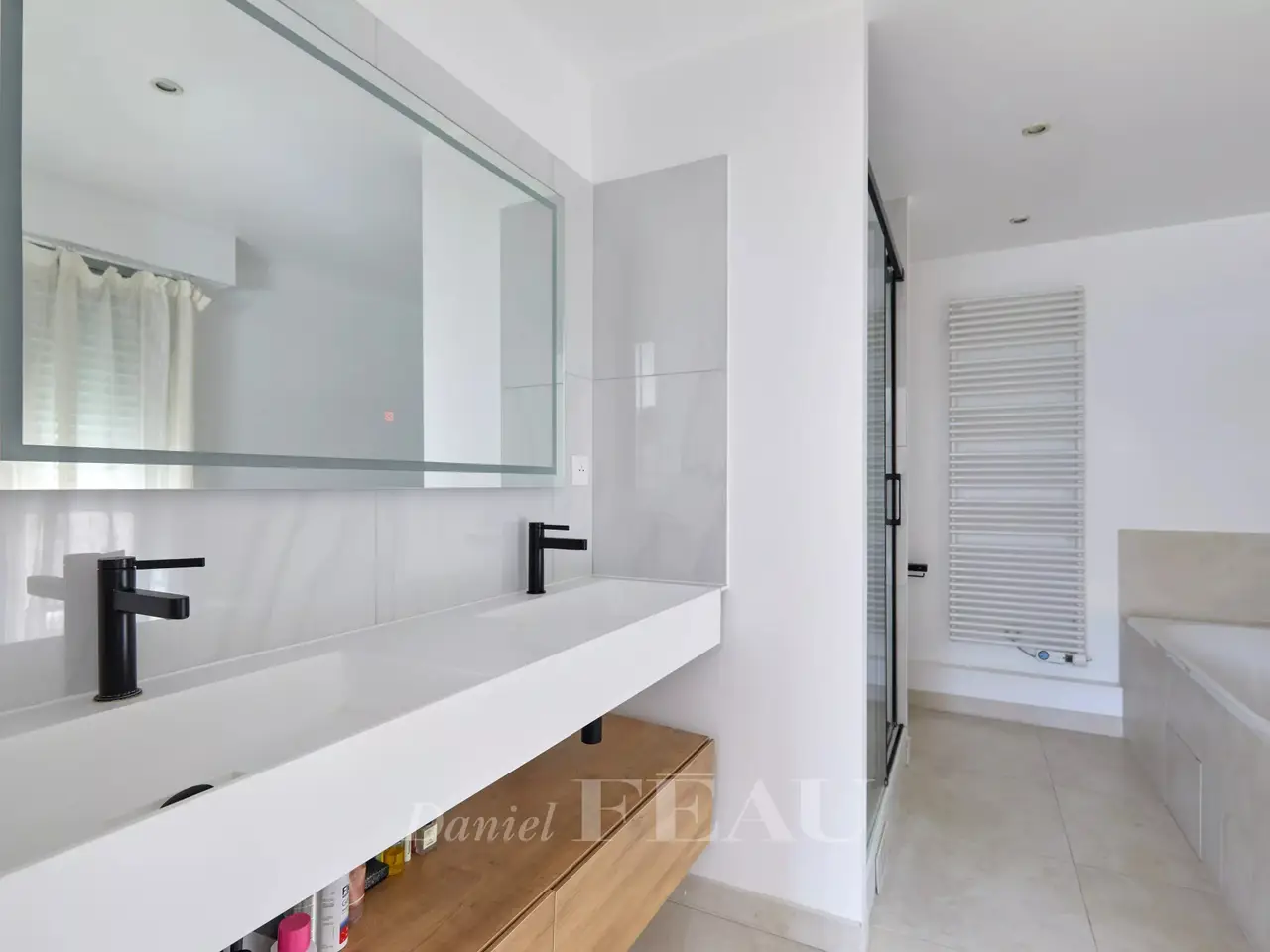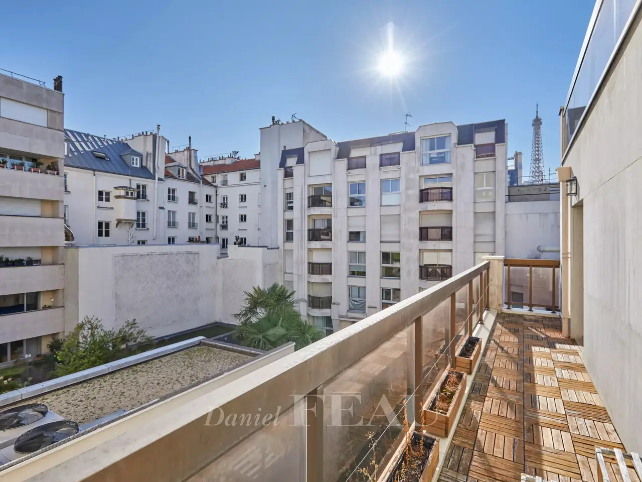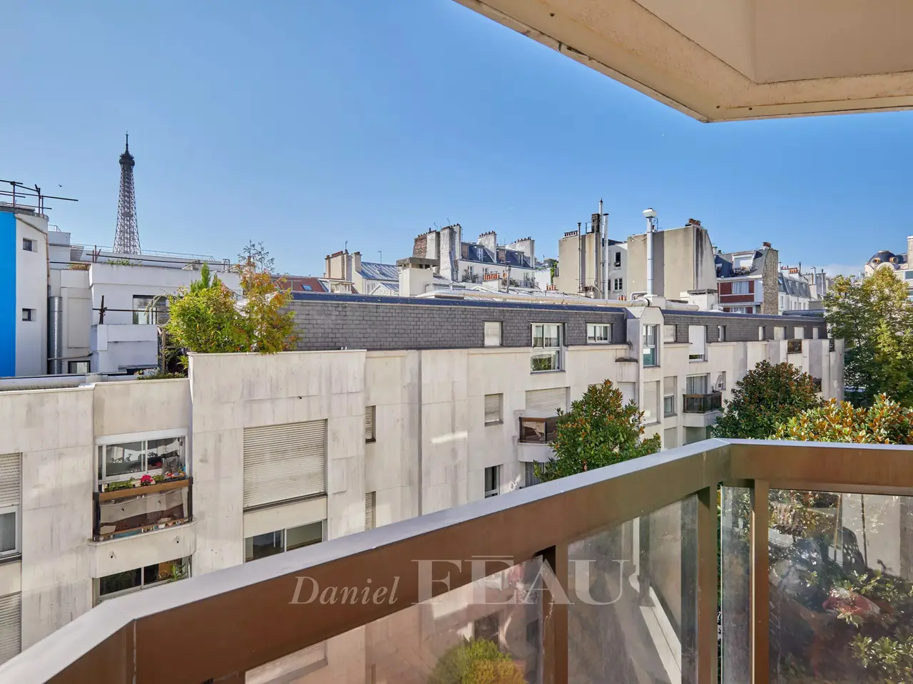 Saint Dominique/Gros Caillou neighbourhood. This apartment in very good condition is on the 4th floor of a peaceful relatively recent residence. Offering about 146 sqm of floor space and 137.57 sqm of living space as defined by the Carrez Law, it includes a living/reception room, a dining room, a kitchen opening onto west-facing balconies commanding a view of the Eiffel Tower, a master bedroom with a bathroom opening onto a fully south-facing terrace, two further bedrooms, a bathroom, a utility room and two wc. With a parking space and two cellars.