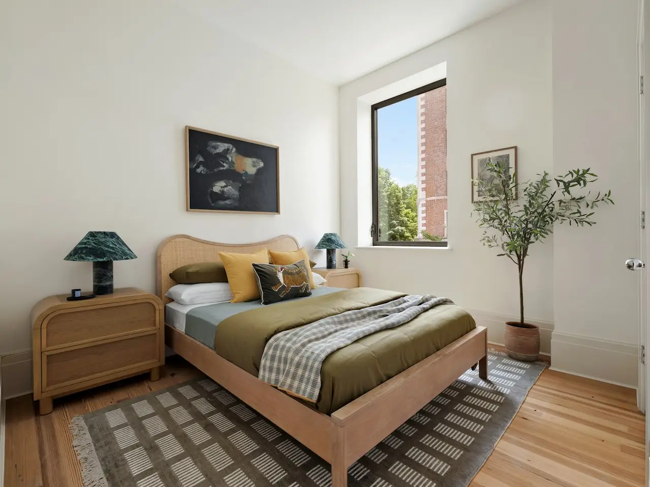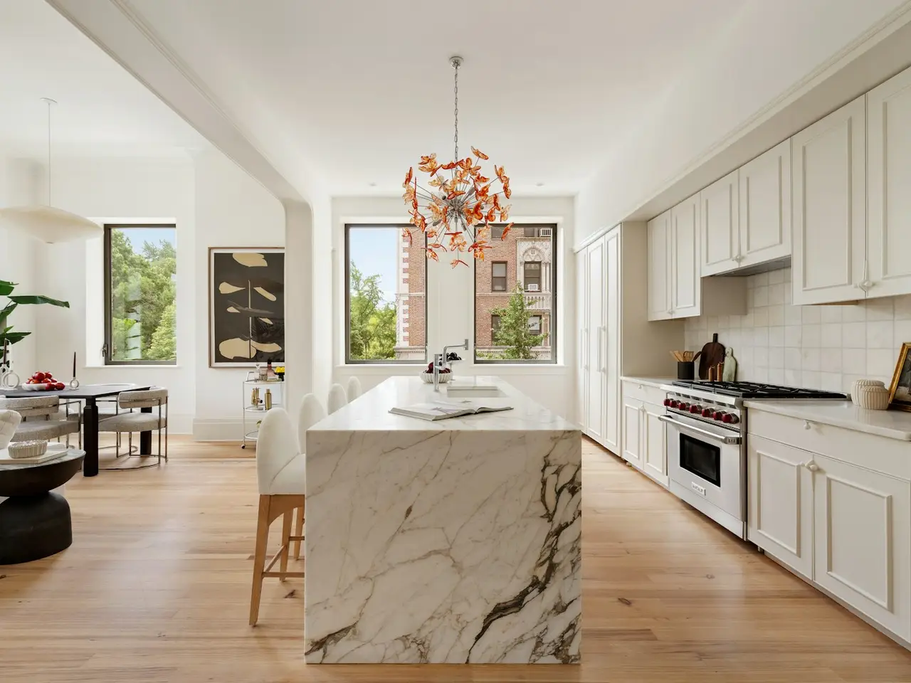 A seamless blend of architectural heritage and refined design, this corner three-bedroom, two-and-a-half-bathroom home at the prestigious 1 Prospect Park West offers a rare level of luxury, space, and light. With southeast and southwest exposures, the home is located on the corner overlooking Prospect Park West and President Street and is bathed in natural light. Spanning 2046 square feet, residence 3C is a sanctuary of proportion and detail with an optimal and gracious layout. At the heart of the home is the great room, crowned by 13-foot ceilings and graced with tree-lined views of Prospect Park. The layout unfolds with a sense of purpose and grandeur, beginning in a formal entry gallery where hand-laid, reclaimed heart pine floors-patterned in a motif inspired by Frank Stella-set a tone of warm elegance. These floors flow throughout the residence, unifying each space with rich texture and timeless appeal. Whether you are a hobbyist or a gourmet chef, the open kitchen's sculptural and functional elements will inspire your cuisine. Honed Estremoz marble counters, an oversized Calacatta Vagli island, and fully integrated Wolf and Sub-Zero appliances are complemented by custom Workstead paneled cabinetry, a cast iron undermount sink, and a Dornbracht chrome faucet that reads more like a piece of art than hardware. An arched opening transitions the kitchen into the grand entertaining space, where thoughtful moldings and custom trim elevate the room's pre-war charm. The private quarters are quietly tucked away along a central hall. Two well-proportioned secondary bedrooms enjoy generous closet space and share a serene bathroom outfitted with a Calacatta Nero vanity, Waterworks chrome fixtures, and gray limestone mosaic flooring. The primary suite is both tranquil and luxurious, anchored by custom oversized windows, bespoke millwork, and two spacious closets, including a walk-in wardrobe. The en-suite bath is a study in soft contrast and curated materials: Novelda Cream limestone, a Bianco Dolomite marble shower with pyramid glass and powder-coated steel, a freestanding soaking tub, and Calacatta Nero-topped double vanity complete the spa-like experience. A 1920s landmark, One Prospect Park West is a beautifully restored exercise in Classic Revival architecture, reimagined by Workstead with interiors that speak to quiet elegance and modern craftsmanship. Residents enjoy a full suite of elevated amenities: a 24-hour attended lobby, landscaped rooftop terrace by ODA New York with a unique apple orchard, outdoor kitchen, and sun deck with skyline views. Wellness offerings include a state-of-the-art gym, sauna and steam room, movement studio and basketball court, and ample bike and package storage. Private storage is also available for purchase. Set at the gateway to Park Slope and directly across from Prospect Park, this location offers immediate access to green space, cultural institutions, beloved neighborhood restaurants, and excellent transportation-placing luxury, lifestyle, and legacy all at your doorstep.
