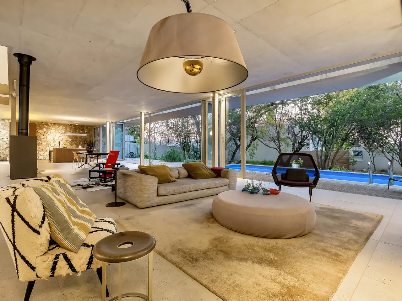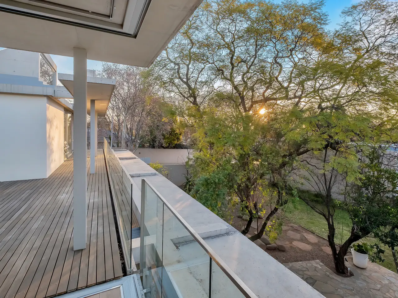 This architectural masterpiece out of the pages of a glossy magazine, combines cutting-edge glamour with a minimalist aesthetic. Brimming with sunshine and energy, it thinks way beyond the minimalist box. An inspired blend of floor to ceiling fenestration, bespoke cabinetry, and detailed finishes throughout are a happy mix. Courtyards, expansive tree-top views, ideal north facing aspects and seamless integration between the indoors and outdoors set the tone of this urban retreat measuring 513 square metres, with welcoming entrance and free-flowing spaces to include state of the art kitchen with stunning feature stone wall, integrated appliances and breakfast bar, dining, living, areas opening to the elevated pool and terraced treed garden – a total entertainer’s lifestyle. Generous stacking doors open this home to light, air, and structured garden views. There is a private guest wing comprising of spacious bedroom, bespoke bathroom, and private courtyard access. Currently this section is being utilised as a study. Guest cloakroom. The feature-clad staircase takes you to the accommodation on the upper level of the home, with tree-top views over the suburb. There are four bedrooms and three bathrooms finished to exacting standards (two en suite). Both the master suite and second bedroom suite are superbly integrated with the outdoors and the expansive treed garden below. The master suite offers a sun filled dressing room with clerestory windows and beautifully detailed full bathroom. A stand-alone, light filled, double volume, open plan studio/cottage of 126 square metres, with private entrance and double garage, enclosed courtyards, open plan kitchen, living and bedroom spaces and gorgeous bathroom offers multiple options – ideal for extended family living, additional income generating cottage, Airbnb, or home office environment. The double volume spaces allow for a mezzanine level to be created for additional living or accommodation. In addition, excellent staff suite with direct access to the main house, additional double automated garage, and storeroom/laundry. Features include piped gas connection for geysers and hobs, SMEG appliances and sinks, swivel wood burning fireplace in the living area and alarm system in the cottage. Do not miss out on this opportunity in the stylish suburb of Parkview, where access to local coffee shops, eateries, the retail strip on Tyrone Avenue, and both private and public schools, is just a stone’s throw away. Distinctive architecture plus a prestige neighbourhood. One look will do.