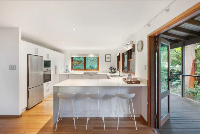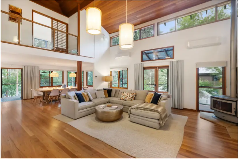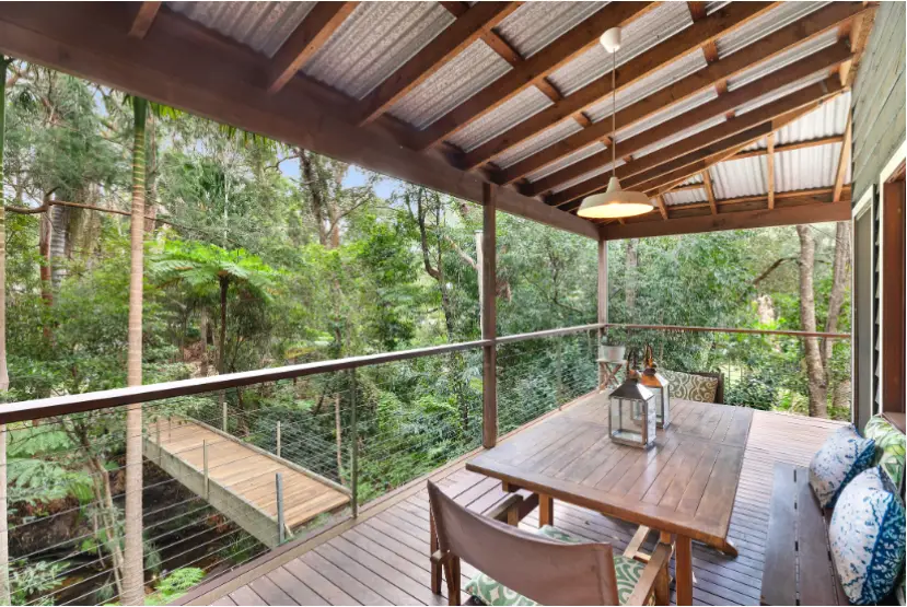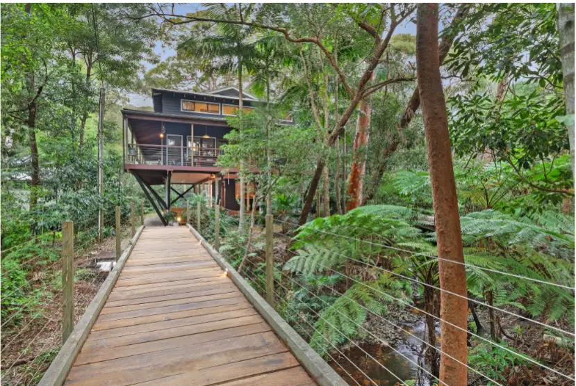 Located atop the treetops on a sprawling 1,587sqm bushland block, this unique designer residence features a charming footbridge crossing a private creek, offering a serene bushland retreat just a short stroll from the beach and local cafes. Boasting soaring 8-meter-high timber ceilings, this exceptional property presents a perfect lifestyle opportunity-ideal for families seeking tranquility or investors looking for a distinctive holiday rental. Perfect for entertaining and relaxing among the canopy of trees. Inside, you'll find a bright, open-plan layout spread across two stunning levels, including a mezzanine with a wraparound deck. The stylish CaesarStone kitchen is equipped with premium appliances and a breakfast bar, perfect for casual dining. The home offers five spacious bedrooms, providing ample privacy and space for large families or hosting guests. Three modern bathrooms, recently renovated, include laundry facilities in one. Designed by acclaimed architects Gibbon Hammor and Associates, the home features multiple living zones, a potential cubby area for children, and easy-care finishes. It remains airy, spacious, and filled with natural light during summer, with air conditioning to keep you comfortable, complemented by a slow combustion fireplace for cozy winter evenings. Just a 250-meter level walk to the beach, ocean pool, and tennis courts, and less than 90 minutes from Sydney CBD, this property also offers exciting potential to add a pool, hot tub, fire pit, or landscaped gardens to enhance outdoor living.