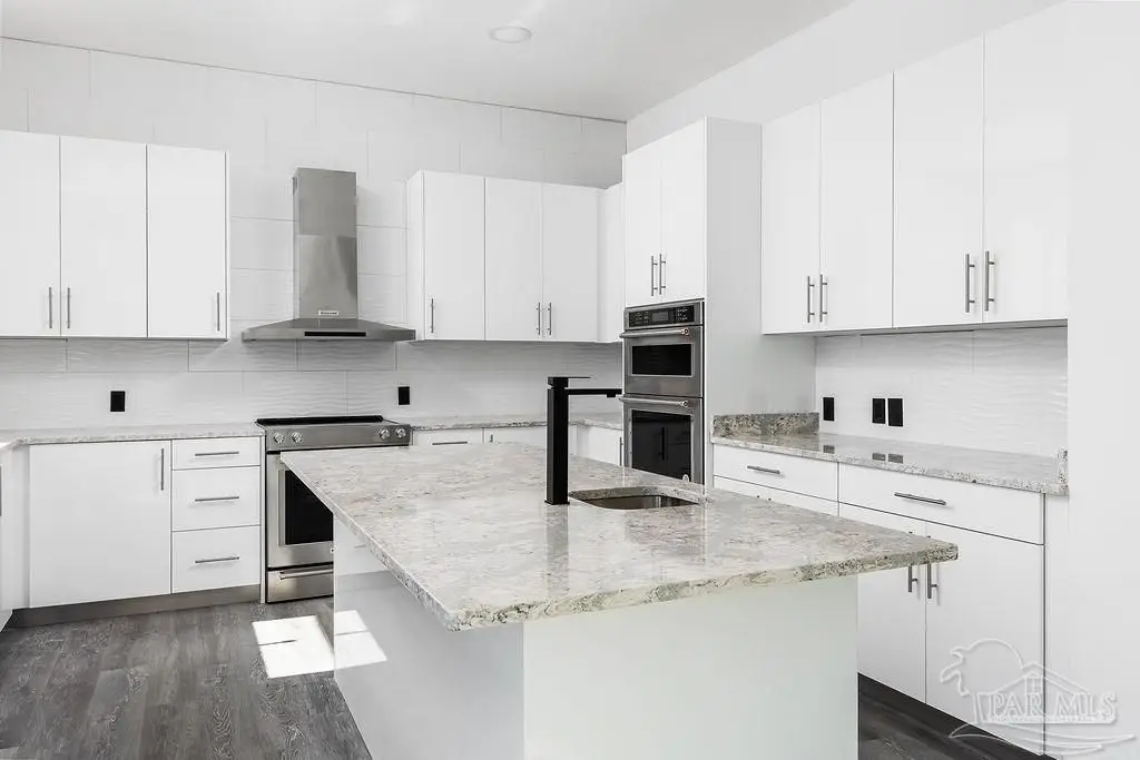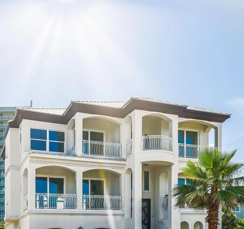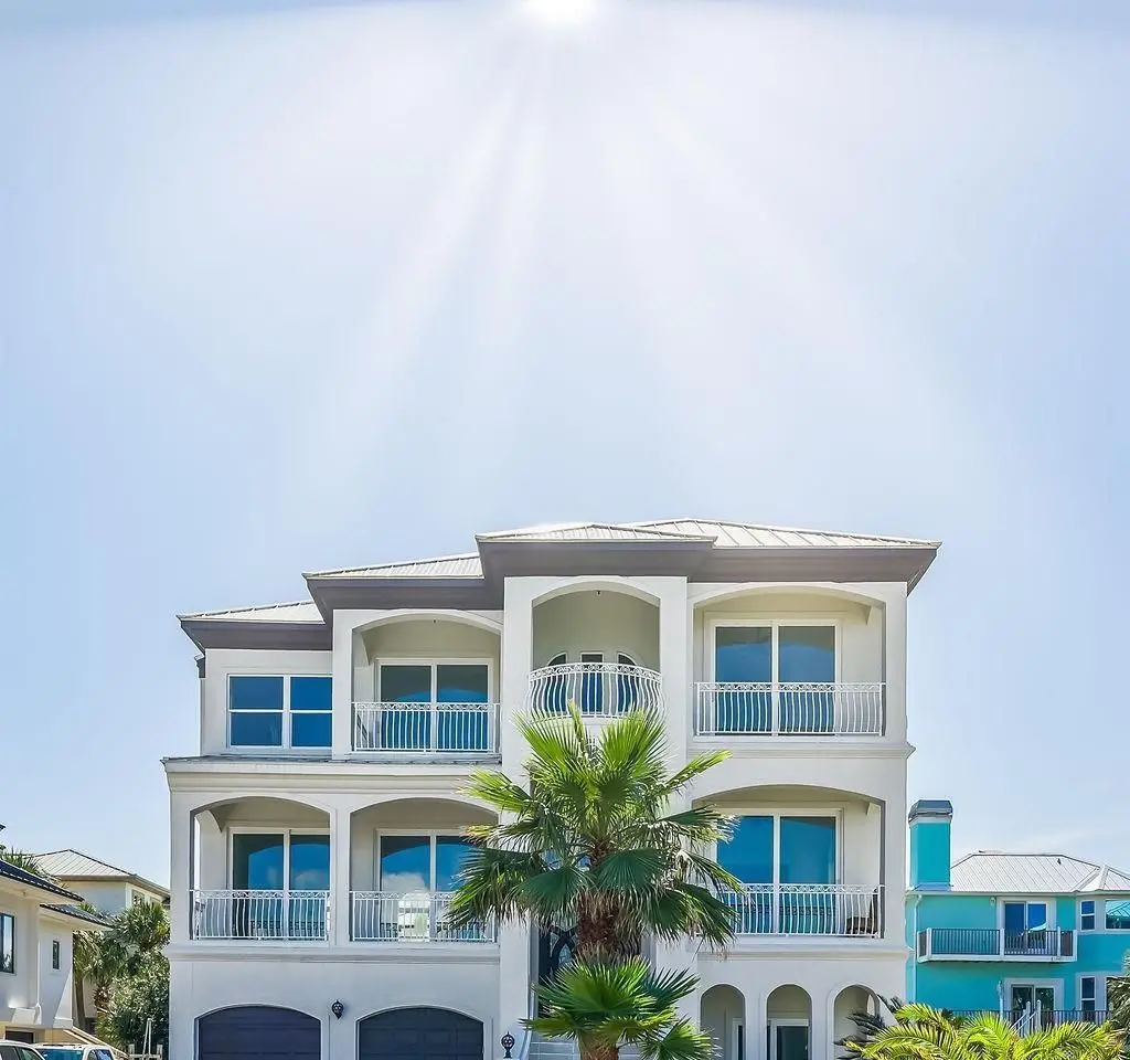 Newly renovated and over 5,000 square feet of total living space in the desired residential gated community of Deluna Point on Pensacola Beach. Direct access to Pensacola Bay and the Gulf of Mexico at the edge of preserved nature, the Gulf Islands National Seashore, make this a coveted location for those seeking the stillness life on an island brings. You've got 3,800 square feet, 6 balconies, 4 bedrooms, and 4.5 bathrooms above grade- plus a finished bottom floor giving you over 5,000 square feet of total living space, 2 extra bedrooms, and the possibility of 2 extra bathrooms. The 8 foot ornate French doors and the height of the entrance gives this home a stately posture. The formal entrance opens on a split level where there are two avenues of entering the main floor - the stairways, or the residential elevator that services all three floors. The main floor consists of the great room, formal dining room, the kitchen with eat-in-kitchen and breakfast bar utility, one bedroom with it's own full bathroom, a half bath for guests, three balconies, and a full service wet bar that holds the whole space together in the center. The kitchen features a large center island with granite counter tops perfect for meal preparation with its own basin sink, double ovens, an oversized sink for cleaning, and a stone finished backsplash for added texture. The full-size wet bar is meant to service the kitchen, the formal dining room, and the great room- wherever you find yourself entertaining family and friends. The bedroom on the main floor features its own balcony making it a great use for an in-home office. On the third floor you'll find 3 additional bedrooms and bathrooms, including that of the master suite and ensuite. Just off the kitchenette on the landing of the third floor, the mast suite is exquisite with a built in entertainment space, fireplace, and six piece ensuite. Armani marble props the jacuzzi tub up in the spotlight and builds out the features of the entire ensuite.