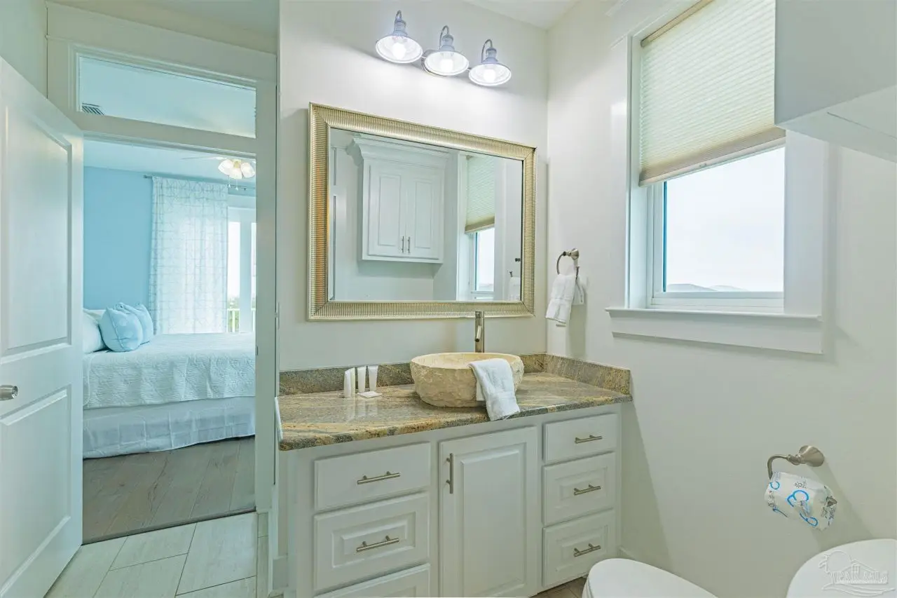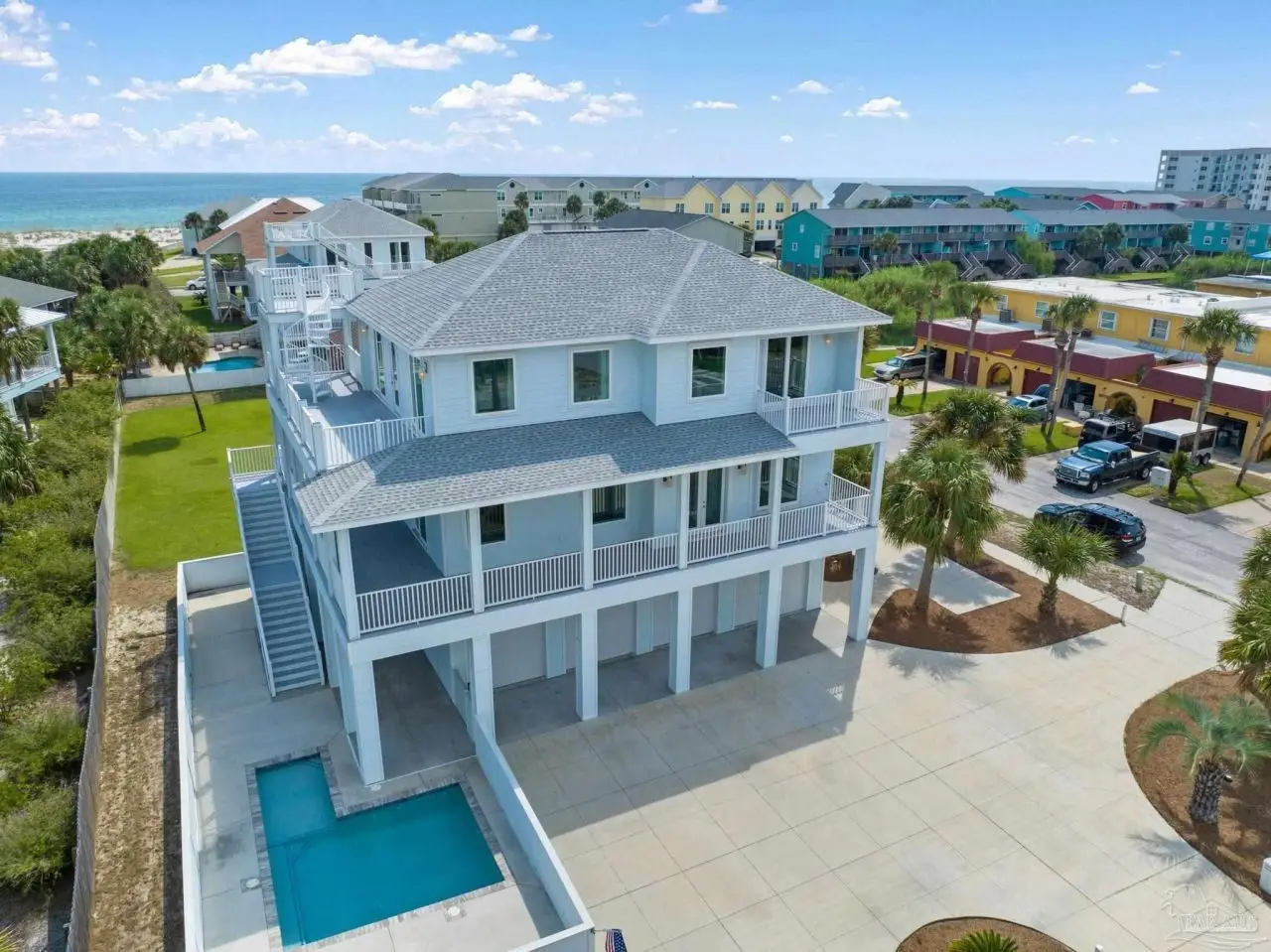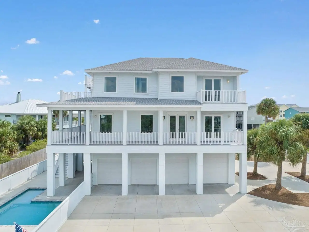Experience the pinnacle of coastal elegance in this custom-built, fully furnished Pensacola Beach residence, just steps from the sugar white sands and the calming emerald waters of the Gulf. With 3200 square feet of impeccably designed living space, this home blends everyday comfort with high-end sophistication, making it ideal as a private beach retreat, full-time residence, or income generating investment. An open-concept floor plan seamlessly connects indoor and outdoor living. Enjoy multiple spaces to relax or entertain-from the private inground pool and expansive balconies to the rooftop deck with sweeping views of the Gulf and the Sound. Whether hosting sunset gatherings or enjoying quiet mornings by the water, every detail has been thoughtfully designed for an elevated coastal lifestyle. The gourmet chef's kitchen is a true centerpiece, featuring commercial grade appliances, a large island, granite countertops, and picture-perfect window views. The main level primary suite offers a serene escape, complete with a spa-inspired ensuite bath featuring a spacious tiled shower, garden tub, dual vanities, and a generous walk-in closet. Upstairs, you'll find four additional bedrooms, two connected by a Jack and Jill bath; each offering comfort and privacy. One bedroom opens directly onto a large balcony, while a second balcony leads to the rooftop deck, the ideal perch for soaking in breathtaking sunrises and sunsets over the Gulf and Sound. Look for the two additional bedroom spaces: one in the loft and the other in a fun and cozy spot under the staircase. Additional luxury features include an interior elevator with access from the oversized garage, perfect for storing beach gear and water toys. Whether you're seeking a serene sanctuary or a high-performing rental property, this exceptional Pensacola Beach home delivers on every level. Schedule your private showing today and step into a life of luxury, comfort, and coastal beauty.