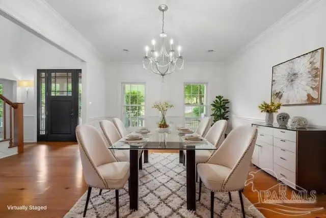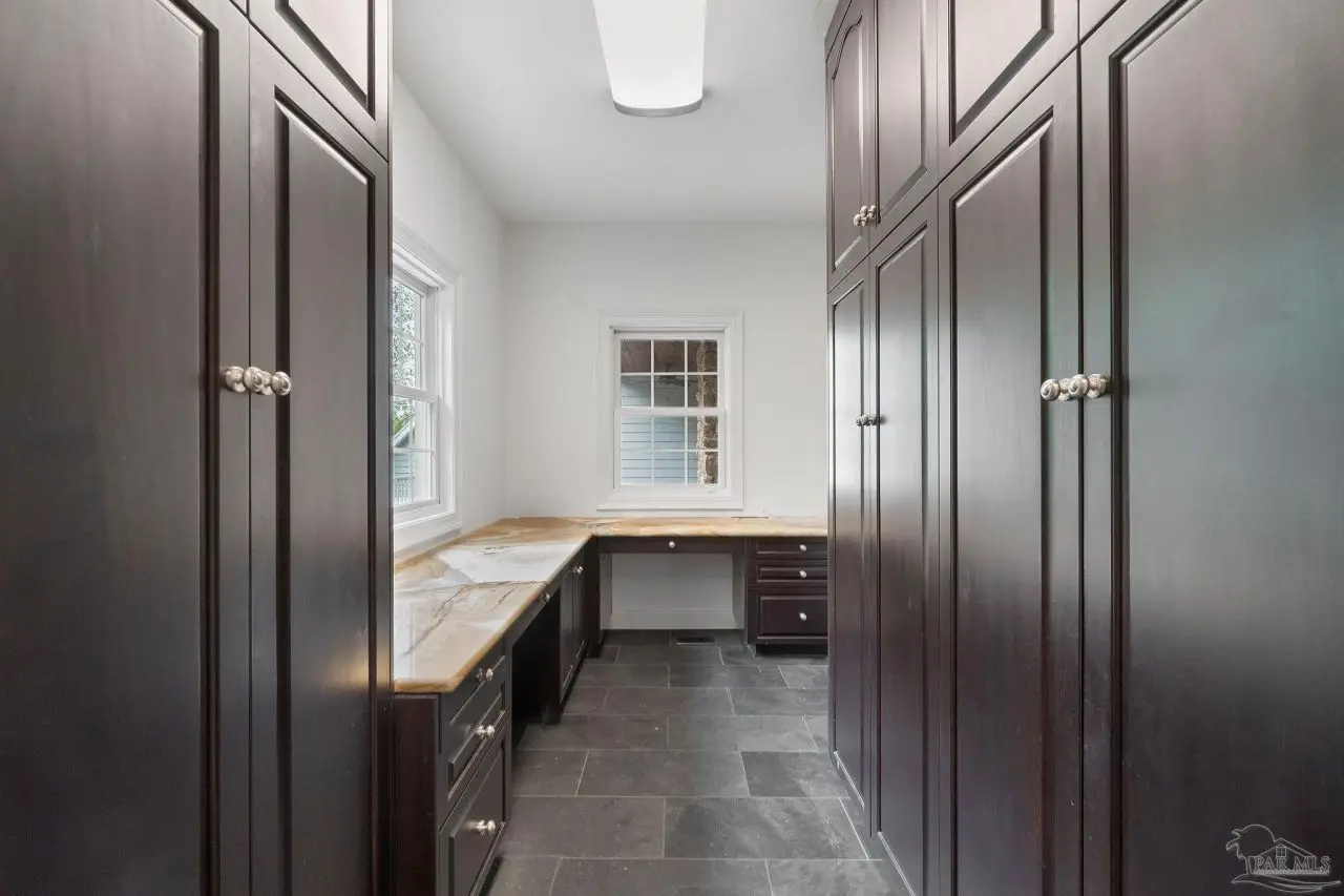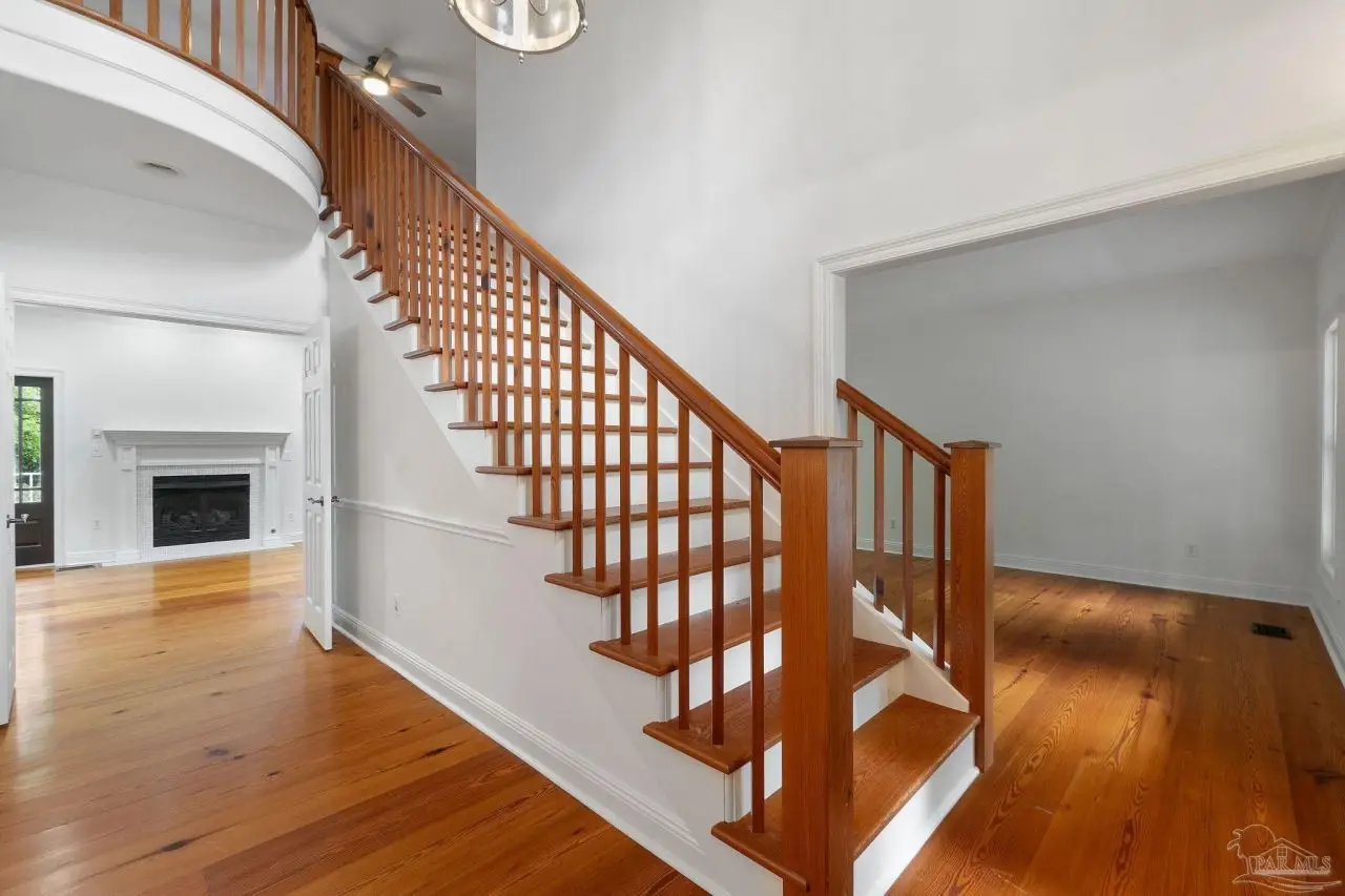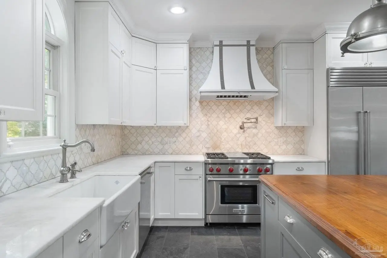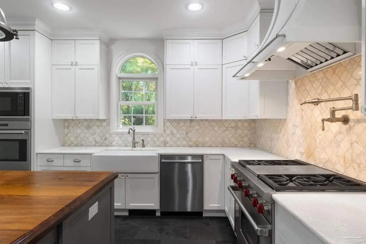 Opportunity awaits in Heritage Oaks with this distinctive pool home on a spacious lot bordered by mature woods, featuring a walkout basement and private studio apartment, offering an estate-like feel just minutes from downtown Pensacola. From the inviting curb appeal to the meticulously maintained grounds, this home blends character, functionality, and timeless design, ideal for multi-generational living. Inside, natural light fills the main living spaces, creating an effortless flow from the entryway to the formal dining room, office, and combined kitchen and den. Reclaimed heart-pine flooring and double doors leading to multiple outdoor living areas enhance the ambiance. The chef's kitchen is a true showstopper, featuring top-of-the-line stainless steel appliances, Marble countertops, ceiling-height white shaker cabinetry, and an elegant Arabesque tile backsplash. The custom oversized island offers generous prep space, while the beverage center includes a built-in wine refrigerator and serving station. An adjacent versatile area serves as an office/homework area, laundry room, and additional storage. The main-floor primary suite features a sophisticated ensuite with an expansive shower, Marble countertops, elegant Espresso cabinetry, and a soaking tub. Upstairs, additional bedrooms and beautifully appointed full baths continue the home's design aesthetic. In addition to the oversized two-car garage, a secondary three-car garage with upper-level living quarters and kitchenette offers endless possibilities-whether as a guest suite, art studio, or workout area. The home's outdoor entertaining space is equally impressive, with multiple areas designed for enjoying the pool. A covered porch with fireplace off the guest apartment offers convenient access to the pool changing area and shower, while a covered patio provides the ideal spot for lounging and escaping the sun. The pool deck and side yard with fire pit, make this home the ultimate year-round hosting space.