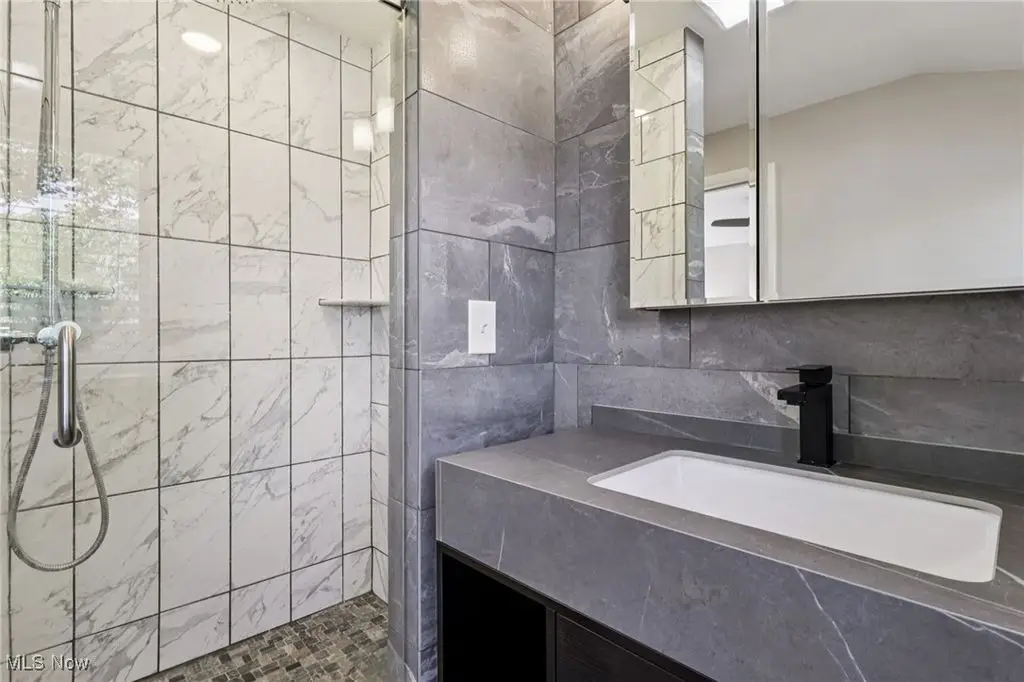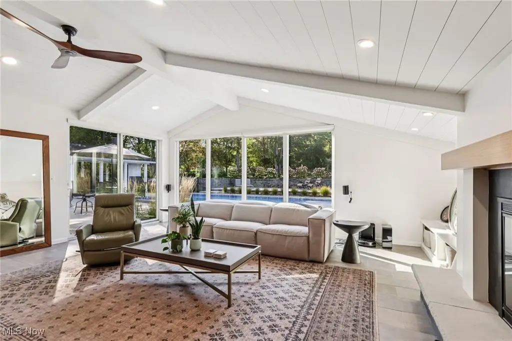 This breathtaking, fully renovated midcentury residence is the epitome of luxury living! Perched on a professionally landscaped 1-acre hilltop lot, this exquisite home features 4 bedrooms, 4 full baths, 1 half bath, a walk-out lower level, sparkling pool, and pool house. Arrive via the circular driveway and step into the dramatic two-story foyer, highlighted by a floating staircase and marble flooring. From there, the open living and dining room impress with picture windows front and back, and a decorative wrought-iron screen. The spectacular gourmet kitchen boasts full-height cabinetry, quartz countertops, tiled backsplash, and stainless-steel appliances. Adjacent is the vaulted, beamed-ceiling family room with wet bar, built-in buffet, and a stunning gas fireplace. A large pantry, an incredible exercise room, a laundry with dog shower, and a mudroom complete this wing of the home. On the opposite side of the foyer, the gorgeous primary suite offers built-in bookshelves, a wet bar, dual closets with a Murphy bed, and a spa-inspired bath with oversized tiled shower, sauna, soaking tub, and double-sink granite vanity. Upstairs, three generously sized bedrooms, two remodeled bathrooms, and a versatile loft provide comfort and flexibility. The walk-out lower level features a spacious recreation room and full bath with direct yard access. Both levels of the home overlook the private backyard oasisC/B?B=complete with pool, pool house, lush gardens, and firepit. Additional highlights include a 4-car attached garage, extra parking, and full connection to public sewer in 2024. Whether hosting elegant dinner parties, enjoying summer poolside, or relaxing with family in inviting living spaces, this remarkable property offers an unparalleled lifestyle.